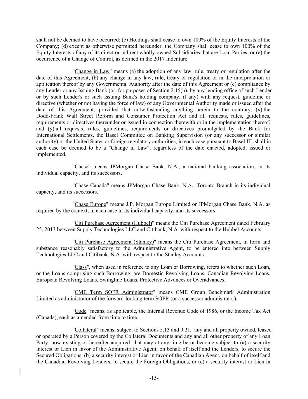shall not be deemed to have occurred; (c) Holdings shall cease to own 100% of the Equity Interests of the Company; (d) except as otherwise permitted hereunder, the Company shall cease to own 100% of the Equity Interests of any of its direct or indirect wholly-owned Subsidiaries that are Loan Parties; or (e) the occurrence of a Change of Control, as defined in the 2017 Indenture. "Change in Law" means (a) the adoption of any law, rule, treaty or regulation after the date of this Agreement, (b) any change in any law, rule, treaty or regulation or in the interpretation or application thereof by any Governmental Authority after the date of this Agreement or (c) compliance by any Lender or any Issuing Bank (or, for purposes of Section 2.15(b), by any lending office of such Lender or by such Lender's or such Issuing Bank's holding company, if any) with any request, guideline or directive (whether or not having the force of law) of any Governmental Authority made or issued after the date of this Agreement; provided that notwithstanding anything herein to the contrary, (x) the Dodd-Frank Wall Street Reform and Consumer Protection Act and all requests, rules, guidelines, requirements or directives thereunder or issued in connection therewith or in the implementation thereof, and (y) all requests, rules, guidelines, requirements or directives promulgated by the Bank for International Settlements, the Basel Committee on Banking Supervision (or any successor or similar authority) or the United States or foreign regulatory authorities, in each case pursuant to Basel III, shall in each case be deemed to be a "Change in Law", regardless of the date enacted, adopted, issued or implemented. "Chase" means JPMorgan Chase Bank, N.A., a national banking association, in its individual capacity, and its successors. "Chase Canada" means JPMorgan Chase Bank, N.A., Toronto Branch in its individual capacity, and its successors. "Chase Europe" means J.P. Morgan Europe Limited or JPMorgan Chase Bank, N.A. as required by the context, in each case in its individual capacity, and its successors. "Citi Purchase Agreement (Hubbel)" means the Citi Purchase Agreement dated February 25, 2013 between Supply Technologies LLC and Citibank, N.A. with respect to the Hubbel Accounts. "Citi Purchase Agreement (Stanley)" means the Citi Purchase Agreement, in form and substance reasonably satisfactory to the Administrative Agent, to be entered into between Supply Technologies LLC and Citibank, N.A. with respect to the Stanley Accounts. "Class", when used in reference to any Loan or Borrowing, refers to whether such Loan, or the Loans comprising such Borrowing, are Domestic Revolving Loans, Canadian Revolving Loans, European Revolving Loans, Swingline Loans, Protective Advances or Overadvances. "CME Term SOFR Administrator" means CME Group Benchmark Administration Limited as administrator of the forward-looking term SOFR (or a successor administrator). "Code" means, as applicable, the Internal Revenue Code of 1986, or the Income Tax Act (Canada), each as amended from time to time. "Collateral" means, subject to Sections 5.13 and 9.21, any and all property owned, leased or operated by a Person covered by the Collateral Documents and any and all other property of any Loan Party, now existing or hereafter acquired, that may at any time be or become subject to (a) a security interest or Lien in favor of the Administrative Agent, on behalf of itself and the Lenders, to secure the Secured Obligations, (b) a security interest or Lien in favor of the Canadian Agent, on behalf of itself and the Canadian Revolving Lenders, to secure the Foreign Obligations, or (c) a security interest or Lien in -15-