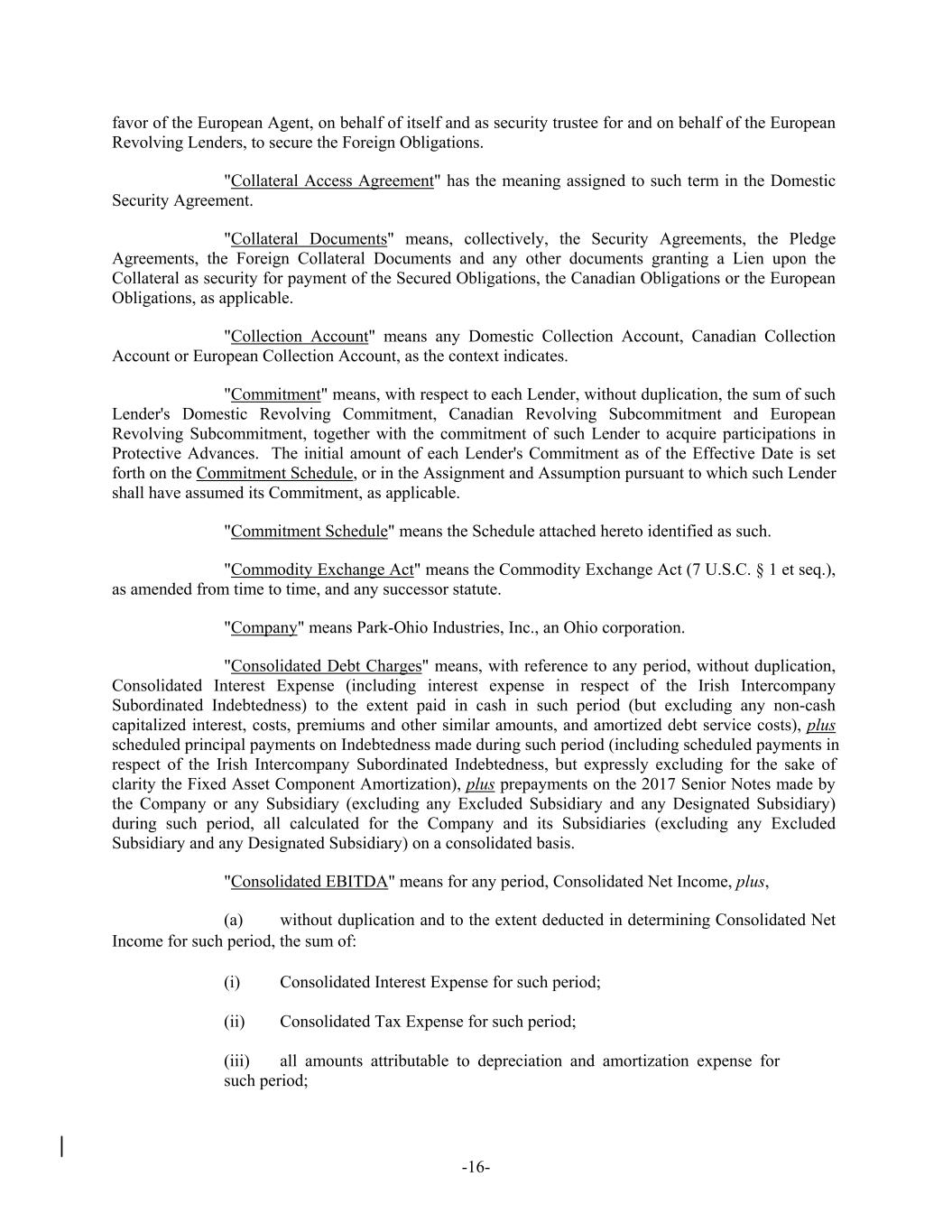 favor of the European Agent, on behalf of itself and as security trustee for and on behalf of the European Revolving Lenders, to secure the Foreign Obligations. "Collateral Access Agreement" has the meaning assigned to such term in the Domestic Security Agreement. "Collateral Documents" means, collectively, the Security Agreements, the Pledge Agreements, the Foreign Collateral Documents and any other documents granting a Lien upon the Collateral as security for payment of the Secured Obligations, the Canadian Obligations or the European Obligations, as applicable. "Collection Account" means any Domestic Collection Account, Canadian Collection Account or European Collection Account, as the context indicates. "Commitment" means, with respect to each Lender, without duplication, the sum of such Lender's Domestic Revolving Commitment, Canadian Revolving Subcommitment and European Revolving Subcommitment, together with the commitment of such Lender to acquire participations in Protective Advances. The initial amount of each Lender's Commitment as of the Effective Date is set forth on the Commitment Schedule, or in the Assignment and Assumption pursuant to which such Lender shall have assumed its Commitment, as applicable. "Commitment Schedule" means the Schedule attached hereto identified as such. "Commodity Exchange Act" means the Commodity Exchange Act (7 U.S.C. § 1 et seq.), as amended from time to time, and any successor statute. "Company" means Park-Ohio Industries, Inc., an Ohio corporation. "Consolidated Debt Charges" means, with reference to any period, without duplication, Consolidated Interest Expense (including interest expense in respect of the Irish Intercompany Subordinated Indebtedness) to the extent paid in cash in such period (but excluding any non-cash capitalized interest, costs, premiums and other similar amounts, and amortized debt service costs), plus scheduled principal payments on Indebtedness made during such period (including scheduled payments in respect of the Irish Intercompany Subordinated Indebtedness, but expressly excluding for the sake of clarity the Fixed Asset Component Amortization), plus prepayments on the 2017 Senior Notes made by the Company or any Subsidiary (excluding any Excluded Subsidiary and any Designated Subsidiary) during such period, all calculated for the Company and its Subsidiaries (excluding any Excluded Subsidiary and any Designated Subsidiary) on a consolidated basis. "Consolidated EBITDA" means for any period, Consolidated Net Income, plus, (a) without duplication and to the extent deducted in determining Consolidated Net Income for such period, the sum of: (i) Consolidated Interest Expense for such period; (ii) Consolidated Tax Expense for such period; (iii) all amounts attributable to depreciation and amortization expense for such period; -16-