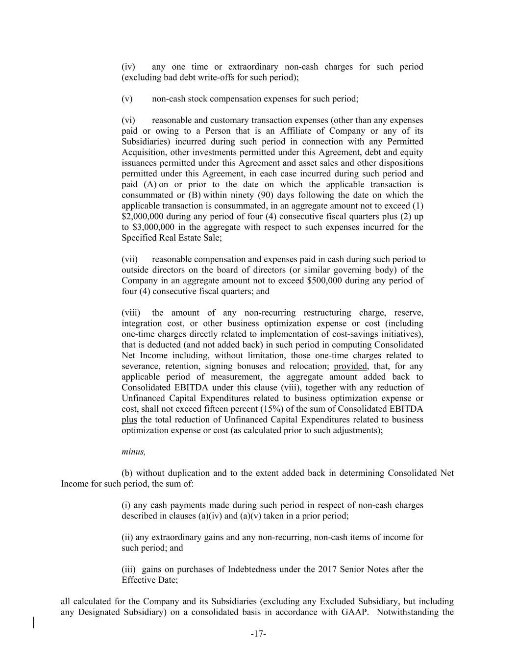 (iv) any one time or extraordinary non-cash charges for such period (excluding bad debt write-offs for such period); (v) non-cash stock compensation expenses for such period; (vi) reasonable and customary transaction expenses (other than any expenses paid or owing to a Person that is an Affiliate of Company or any of its Subsidiaries) incurred during such period in connection with any Permitted Acquisition, other investments permitted under this Agreement, debt and equity issuances permitted under this Agreement and asset sales and other dispositions permitted under this Agreement, in each case incurred during such period and paid (A) on or prior to the date on which the applicable transaction is consummated or (B) within ninety (90) days following the date on which the applicable transaction is consummated, in an aggregate amount not to exceed (1) $2,000,000 during any period of four (4) consecutive fiscal quarters plus (2) up to $3,000,000 in the aggregate with respect to such expenses incurred for the Specified Real Estate Sale; (vii) reasonable compensation and expenses paid in cash during such period to outside directors on the board of directors (or similar governing body) of the Company in an aggregate amount not to exceed $500,000 during any period of four (4) consecutive fiscal quarters; and (viii) the amount of any non-recurring restructuring charge, reserve, integration cost, or other business optimization expense or cost (including one-time charges directly related to implementation of cost-savings initiatives), that is deducted (and not added back) in such period in computing Consolidated Net Income including, without limitation, those one-time charges related to severance, retention, signing bonuses and relocation; provided, that, for any applicable period of measurement, the aggregate amount added back to Consolidated EBITDA under this clause (viii), together with any reduction of Unfinanced Capital Expenditures related to business optimization expense or cost, shall not exceed fifteen percent (15%) of the sum of Consolidated EBITDA plus the total reduction of Unfinanced Capital Expenditures related to business optimization expense or cost (as calculated prior to such adjustments); minus, (b) without duplication and to the extent added back in determining Consolidated Net Income for such period, the sum of: (i) any cash payments made during such period in respect of non-cash charges described in clauses (a)(iv) and (a)(v) taken in a prior period; (ii) any extraordinary gains and any non-recurring, non-cash items of income for such period; and (iii) gains on purchases of Indebtedness under the 2017 Senior Notes after the Effective Date; all calculated for the Company and its Subsidiaries (excluding any Excluded Subsidiary, but including any Designated Subsidiary) on a consolidated basis in accordance with GAAP. Notwithstanding the -17-