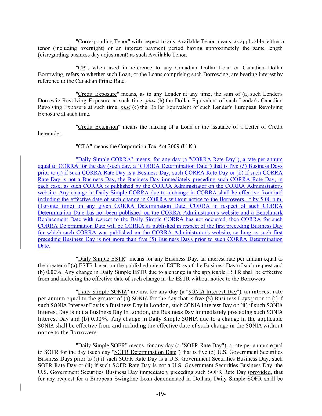 "Corresponding Tenor" with respect to any Available Tenor means, as applicable, either a tenor (including overnight) or an interest payment period having approximately the same length (disregarding business day adjustment) as such Available Tenor. "CP", when used in reference to any Canadian Dollar Loan or Canadian Dollar Borrowing, refers to whether such Loan, or the Loans comprising such Borrowing, are bearing interest by reference to the Canadian Prime Rate. "Credit Exposure" means, as to any Lender at any time, the sum of (a) such Lender's Domestic Revolving Exposure at such time, plus (b) the Dollar Equivalent of such Lender's Canadian Revolving Exposure at such time, plus (c) the Dollar Equivalent of such Lender's European Revolving Exposure at such time. "Credit Extension" means the making of a Loan or the issuance of a Letter of Credit hereunder. "CTA" means the Corporation Tax Act 2009 (U.K.). "Daily Simple CORRA" means, for any day (a "CORRA Rate Day"), a rate per annum equal to CORRA for the day (such day, a "CORRA Determination Date") that is five (5) Business Days prior to (i) if such CORRA Rate Day is a Business Day, such CORRA Rate Day or (ii) if such CORRA Rate Day is not a Business Day, the Business Day immediately preceding such CORRA Rate Day, in each case, as such CORRA is published by the CORRA Administrator on the CORRA Administrator's website. Any change in Daily Simple CORRA due to a change in CORRA shall be effective from and including the effective date of such change in CORRA without notice to the Borrowers. If by 5:00 p.m. (Toronto time) on any given CORRA Determination Date, CORRA in respect of such CORRA Determination Date has not been published on the CORRA Administrator's website and a Benchmark Replacement Date with respect to the Daily Simple CORRA has not occurred, then CORRA for such CORRA Determination Date will be CORRA as published in respect of the first preceding Business Day for which such CORRA was published on the CORRA Administrator's website, so long as such first preceding Business Day is not more than five (5) Business Days prior to such CORRA Determination Date. "Daily Simple ESTR" means for any Business Day, an interest rate per annum equal to the greater of (a) ESTR based on the published rate of ESTR as of the Business Day of such request and (b) 0.00%. Any change in Daily Simple ESTR due to a change in the applicable ESTR shall be effective from and including the effective date of such change in the ESTR without notice to the Borrowers "Daily Simple SONIA" means, for any day (a "SONIA Interest Day"), an interest rate per annum equal to the greater of (a) SONIA for the day that is five (5) Business Days prior to (i) if such SONIA Interest Day is a Business Day in London, such SONIA Interest Day or (ii) if such SONIA Interest Day is not a Business Day in London, the Business Day immediately preceding such SONIA Interest Day and (b) 0.00%. Any change in Daily Simple SONIA due to a change in the applicable SONIA shall be effective from and including the effective date of such change in the SONIA without notice to the Borrowers. "Daily Simple SOFR" means, for any day (a "SOFR Rate Day"), a rate per annum equal to SOFR for the day (such day "SOFR Determination Date") that is five (5) U.S. Government Securities Business Days prior to (i) if such SOFR Rate Day is a U.S. Government Securities Business Day, such SOFR Rate Day or (ii) if such SOFR Rate Day is not a U.S. Government Securities Business Day, the U.S. Government Securities Business Day immediately preceding such SOFR Rate Day (provided, that for any request for a European Swingline Loan denominated in Dollars, Daily Simple SOFR shall be -19-