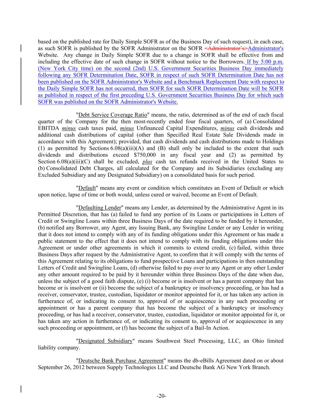 based on the published rate for Daily Simple SOFR as of the Business Day of such request), in each case, as such SOFR is published by the SOFR Administrator on the SOFR <Administrator’s>Administrator's Website. Any change in Daily Simple SOFR due to a change in SOFR shall be effective from and including the effective date of such change in SOFR without notice to the Borrowers. If by 5:00 p.m. (New York City time) on the second (2nd) U.S. Government Securities Business Day immediately following any SOFR Determination Date, SOFR in respect of such SOFR Determination Date has not been published on the SOFR Administrator's Website and a Benchmark Replacement Date with respect to the Daily Simple SOFR has not occurred, then SOFR for such SOFR Determination Date will be SOFR as published in respect of the first preceding U.S. Government Securities Business Day for which such SOFR was published on the SOFR Administrator's Website. "Debt Service Coverage Ratio" means, the ratio, determined as of the end of each fiscal quarter of the Company for the then most-recently ended four fiscal quarters, of (a) Consolidated EBITDA minus cash taxes paid, minus Unfinanced Capital Expenditures, minus cash dividends and additional cash distributions of capital (other than Specified Real Estate Sale Dividends made in accordance with this Agreement); provided, that cash dividends and cash distributions made to Holdings (1) as permitted by Sections 6.08(a)(iii)(A) and (B) shall only be included to the extent that such dividends and distributions exceed $750,000 in any fiscal year and (2) as permitted by Section 6.08(a)(iii)(C) shall be excluded, plus cash tax refunds received in the United States to (b) Consolidated Debt Charges, all calculated for the Company and its Subsidiaries (excluding any Excluded Subsidiary and any Designated Subsidiary) on a consolidated basis for such period. "Default" means any event or condition which constitutes an Event of Default or which upon notice, lapse of time or both would, unless cured or waived, become an Event of Default. "Defaulting Lender" means any Lender, as determined by the Administrative Agent in its Permitted Discretion, that has (a) failed to fund any portion of its Loans or participations in Letters of Credit or Swingline Loans within three Business Days of the date required to be funded by it hereunder, (b) notified any Borrower, any Agent, any Issuing Bank, any Swingline Lender or any Lender in writing that it does not intend to comply with any of its funding obligations under this Agreement or has made a public statement to the effect that it does not intend to comply with its funding obligations under this Agreement or under other agreements in which it commits to extend credit, (c) failed, within three Business Days after request by the Administrative Agent, to confirm that it will comply with the terms of this Agreement relating to its obligations to fund prospective Loans and participations in then outstanding Letters of Credit and Swingline Loans, (d) otherwise failed to pay over to any Agent or any other Lender any other amount required to be paid by it hereunder within three Business Days of the date when due, unless the subject of a good faith dispute, (e) (i) become or is insolvent or has a parent company that has become or is insolvent or (ii) become the subject of a bankruptcy or insolvency proceeding, or has had a receiver, conservator, trustee, custodian, liquidator or monitor appointed for it, or has taken any action in furtherance of, or indicating its consent to, approval of or acquiescence in any such proceeding or appointment or has a parent company that has become the subject of a bankruptcy or insolvency proceeding, or has had a receiver, conservator, trustee, custodian, liquidator or monitor appointed for it, or has taken any action in furtherance of, or indicating its consent to, approval of or acquiescence in any such proceeding or appointment, or (f) has become the subject of a Bail-In Action. "Designated Subsidiary" means Southwest Steel Processing, LLC, an Ohio limited liability company. "Deutsche Bank Purchase Agreement" means the db-eBills Agreement dated on or about September 26, 2012 between Supply Technologies LLC and Deutsche Bank AG New York Branch. -20-