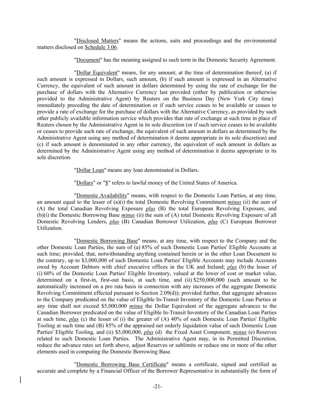 "Disclosed Matters" means the actions, suits and proceedings and the environmental matters disclosed on Schedule 3.06. "Document" has the meaning assigned to such term in the Domestic Security Agreement. "Dollar Equivalent" means, for any amount, at the time of determination thereof, (a) if such amount is expressed in Dollars, such amount, (b) if such amount is expressed in an Alternative Currency, the equivalent of such amount in dollars determined by using the rate of exchange for the purchase of dollars with the Alternative Currency last provided (either by publication or otherwise provided to the Administrative Agent) by Reuters on the Business Day (New York City time) immediately preceding the date of determination or if such service ceases to be available or ceases to provide a rate of exchange for the purchase of dollars with the Alternative Currency, as provided by such other publicly available information service which provides that rate of exchange at such time in place of Reuters chosen by the Administrative Agent in its sole discretion (or if such service ceases to be available or ceases to provide such rate of exchange, the equivalent of such amount in dollars as determined by the Administrative Agent using any method of determination it deems appropriate in its sole discretion) and (c) if such amount is denominated in any other currency, the equivalent of such amount in dollars as determined by the Administrative Agent using any method of determination it deems appropriate in its sole discretion. "Dollar Loan" means any loan denominated in Dollars. "Dollars" or "$" refers to lawful money of the United States of America. "Domestic Availability" means, with respect to the Domestic Loan Parties, at any time, an amount equal to the lesser of (a)(i) the total Domestic Revolving Commitment minus (ii) the sum of (A) the total Canadian Revolving Exposure plus (B) the total European Revolving Exposure, and (b)(i) the Domestic Borrowing Base minus (ii) the sum of (A) total Domestic Revolving Exposure of all Domestic Revolving Lenders, plus (B) Canadian Borrower Utilization, plus (C) European Borrower Utilization. "Domestic Borrowing Base" means, at any time, with respect to the Company and the other Domestic Loan Parties, the sum of (a) 85% of such Domestic Loan Parties' Eligible Accounts at such time; provided, that, notwithstanding anything contained herein or in the other Loan Document to the contrary, up to $3,000,000 of such Domestic Loan Parties' Eligible Accounts may include Accounts owed by Account Debtors with chief executive offices in the UK and Ireland; plus (b) the lesser of (i) 60% of the Domestic Loan Parties' Eligible Inventory, valued at the lower of cost or market value, determined on a first-in, first-out basis, at such time, and (ii) $250,000,000 (such amount to be automatically increased on a pro rata basis in connection with any increases of the aggregate Domestic Revolving Commitment effected pursuant to Section 2.09(d)); provided further, that aggregate advances to the Company predicated on the value of Eligible In-Transit Inventory of the Domestic Loan Parties at any time shall not exceed $5,000,000 minus the Dollar Equivalent of the aggregate advances to the Canadian Borrower predicated on the value of Eligible In-Transit Inventory of the Canadian Loan Parties at such time, plus (c) the lesser of (i) the greater of (A) 40% of such Domestic Loan Parties' Eligible Tooling at such time and (B) 85% of the appraised net orderly liquidation value of such Domestic Loan Parties' Eligible Tooling, and (ii) $5,000,000, plus (d) the Fixed Asset Component, minus (e) Reserves related to such Domestic Loan Parties. The Administrative Agent may, in its Permitted Discretion, reduce the advance rates set forth above, adjust Reserves or sublimits or reduce one or more of the other elements used in computing the Domestic Borrowing Base. "Domestic Borrowing Base Certificate" means a certificate, signed and certified as accurate and complete by a Financial Officer of the Borrower Representative in substantially the form of -21-
