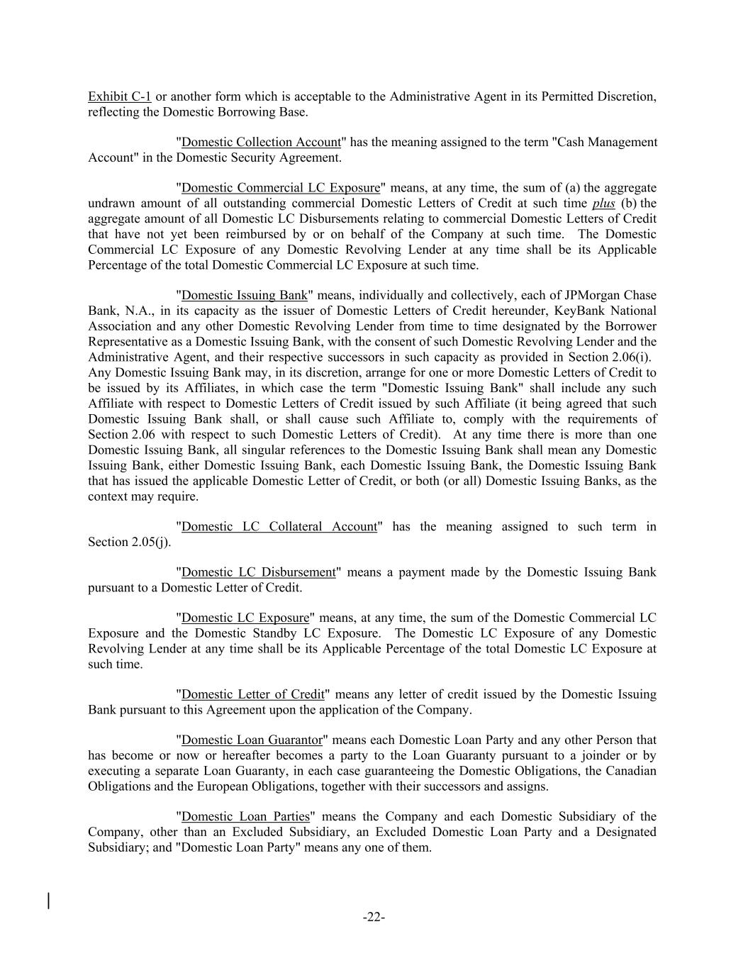 Exhibit C-1 or another form which is acceptable to the Administrative Agent in its Permitted Discretion, reflecting the Domestic Borrowing Base. "Domestic Collection Account" has the meaning assigned to the term "Cash Management Account" in the Domestic Security Agreement. "Domestic Commercial LC Exposure" means, at any time, the sum of (a) the aggregate undrawn amount of all outstanding commercial Domestic Letters of Credit at such time plus (b) the aggregate amount of all Domestic LC Disbursements relating to commercial Domestic Letters of Credit that have not yet been reimbursed by or on behalf of the Company at such time. The Domestic Commercial LC Exposure of any Domestic Revolving Lender at any time shall be its Applicable Percentage of the total Domestic Commercial LC Exposure at such time. "Domestic Issuing Bank" means, individually and collectively, each of JPMorgan Chase Bank, N.A., in its capacity as the issuer of Domestic Letters of Credit hereunder, KeyBank National Association and any other Domestic Revolving Lender from time to time designated by the Borrower Representative as a Domestic Issuing Bank, with the consent of such Domestic Revolving Lender and the Administrative Agent, and their respective successors in such capacity as provided in Section 2.06(i). Any Domestic Issuing Bank may, in its discretion, arrange for one or more Domestic Letters of Credit to be issued by its Affiliates, in which case the term "Domestic Issuing Bank" shall include any such Affiliate with respect to Domestic Letters of Credit issued by such Affiliate (it being agreed that such Domestic Issuing Bank shall, or shall cause such Affiliate to, comply with the requirements of Section 2.06 with respect to such Domestic Letters of Credit). At any time there is more than one Domestic Issuing Bank, all singular references to the Domestic Issuing Bank shall mean any Domestic Issuing Bank, either Domestic Issuing Bank, each Domestic Issuing Bank, the Domestic Issuing Bank that has issued the applicable Domestic Letter of Credit, or both (or all) Domestic Issuing Banks, as the context may require. "Domestic LC Collateral Account" has the meaning assigned to such term in Section 2.05(j). "Domestic LC Disbursement" means a payment made by the Domestic Issuing Bank pursuant to a Domestic Letter of Credit. "Domestic LC Exposure" means, at any time, the sum of the Domestic Commercial LC Exposure and the Domestic Standby LC Exposure. The Domestic LC Exposure of any Domestic Revolving Lender at any time shall be its Applicable Percentage of the total Domestic LC Exposure at such time. "Domestic Letter of Credit" means any letter of credit issued by the Domestic Issuing Bank pursuant to this Agreement upon the application of the Company. "Domestic Loan Guarantor" means each Domestic Loan Party and any other Person that has become or now or hereafter becomes a party to the Loan Guaranty pursuant to a joinder or by executing a separate Loan Guaranty, in each case guaranteeing the Domestic Obligations, the Canadian Obligations and the European Obligations, together with their successors and assigns. "Domestic Loan Parties" means the Company and each Domestic Subsidiary of the Company, other than an Excluded Subsidiary, an Excluded Domestic Loan Party and a Designated Subsidiary; and "Domestic Loan Party" means any one of them. -22-