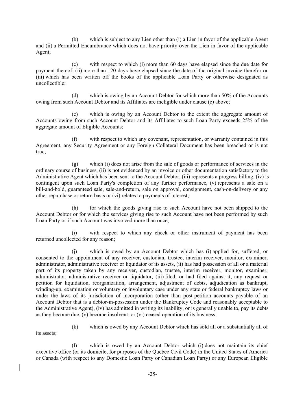 (b) which is subject to any Lien other than (i) a Lien in favor of the applicable Agent and (ii) a Permitted Encumbrance which does not have priority over the Lien in favor of the applicable Agent; (c) with respect to which (i) more than 60 days have elapsed since the due date for payment thereof, (ii) more than 120 days have elapsed since the date of the original invoice therefor or (iii) which has been written off the books of the applicable Loan Party or otherwise designated as uncollectible; (d) which is owing by an Account Debtor for which more than 50% of the Accounts owing from such Account Debtor and its Affiliates are ineligible under clause (c) above; (e) which is owing by an Account Debtor to the extent the aggregate amount of Accounts owing from such Account Debtor and its Affiliates to such Loan Party exceeds 25% of the aggregate amount of Eligible Accounts; (f) with respect to which any covenant, representation, or warranty contained in this Agreement, any Security Agreement or any Foreign Collateral Document has been breached or is not true; (g) which (i) does not arise from the sale of goods or performance of services in the ordinary course of business, (ii) is not evidenced by an invoice or other documentation satisfactory to the Administrative Agent which has been sent to the Account Debtor, (iii) represents a progress billing, (iv) is contingent upon such Loan Party's completion of any further performance, (v) represents a sale on a bill-and-hold, guaranteed sale, sale-and-return, sale on approval, consignment, cash-on-delivery or any other repurchase or return basis or (vi) relates to payments of interest; (h) for which the goods giving rise to such Account have not been shipped to the Account Debtor or for which the services giving rise to such Account have not been performed by such Loan Party or if such Account was invoiced more than once; (i) with respect to which any check or other instrument of payment has been returned uncollected for any reason; (j) which is owed by an Account Debtor which has (i) applied for, suffered, or consented to the appointment of any receiver, custodian, trustee, interim receiver, monitor, examiner, administrator, administrative receiver or liquidator of its assets, (ii) has had possession of all or a material part of its property taken by any receiver, custodian, trustee, interim receiver, monitor, examiner, administrator, administrative receiver or liquidator, (iii) filed, or had filed against it, any request or petition for liquidation, reorganization, arrangement, adjustment of debts, adjudication as bankrupt, winding-up, examination or voluntary or involuntary case under any state or federal bankruptcy laws or under the laws of its jurisdiction of incorporation (other than post-petition accounts payable of an Account Debtor that is a debtor-in-possession under the Bankruptcy Code and reasonably acceptable to the Administrative Agent), (iv) has admitted in writing its inability, or is generally unable to, pay its debts as they become due, (v) become insolvent, or (vi) ceased operation of its business; (k) which is owed by any Account Debtor which has sold all or a substantially all of its assets; (l) which is owed by an Account Debtor which (i) does not maintain its chief executive office (or its domicile, for purposes of the Quebec Civil Code) in the United States of America or Canada (with respect to any Domestic Loan Party or Canadian Loan Party) or any European Eligible -25-