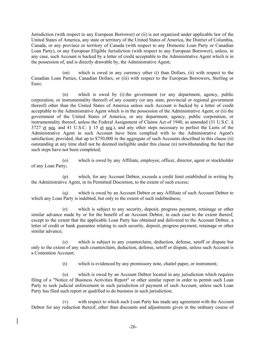 Jurisdiction (with respect to any European Borrower) or (ii) is not organized under applicable law of the United States of America, any state or territory of the United States of America, the District of Columbia, Canada, or any province or territory of Canada (with respect to any Domestic Loan Party or Canadian Loan Party), or any European Eligible Jurisdiction (with respect to any European Borrower), unless, in any case, such Account is backed by a letter of credit acceptable to the Administrative Agent which is in the possession of, and is directly drawable by, the Administrative Agent; (m) which is owed in any currency other (i) than Dollars, (ii) with respect to the Canadian Loan Parties, Canadian Dollars, or (iii) with respect to the European Borrowers, Sterling or Euro; (n) which is owed by (i) the government (or any department, agency, public corporation, or instrumentality thereof) of any country (or any state, provincial or regional government thereof) other than the United States of America unless such Account is backed by a letter of credit acceptable to the Administrative Agent which is in the possession of the Administrative Agent, or (ii) the government of the United States of America, or any department, agency, public corporation, or instrumentality thereof, unless the Federal Assignment of Claims Act of 1940, as amended (31 U.S.C. § 3727 et seq. and 41 U.S.C. § 15 et seq.), and any other steps necessary to perfect the Liens of the Administrative Agent in such Account have been complied with to the Administrative Agent's satisfaction; provided, that up to $750,000 in the aggregate of such Accounts described in this clause (ii) outstanding at any time shall not be deemed ineligible under this clause (n) notwithstanding the fact that such steps have not been completed; (o) which is owed by any Affiliate, employee, officer, director, agent or stockholder of any Loan Party; (p) which, for any Account Debtor, exceeds a credit limit established in writing by the Administrative Agent, in its Permitted Discretion, to the extent of such excess; (q) which is owed by an Account Debtor or any Affiliate of such Account Debtor to which any Loan Party is indebted, but only to the extent of such indebtedness; (r) which is subject to any security, deposit, progress payment, retainage or other similar advance made by or for the benefit of an Account Debtor, in each case to the extent thereof, except to the extent that the applicable Loan Party has obtained and delivered to the Account Debtor, a letter of credit or bank guarantee relating to such security, deposit, progress payment, retainage or other similar advance; (s) which is subject to any counterclaim, deduction, defense, setoff or dispute but only to the extent of any such counterclaim, deduction, defense, setoff or dispute, unless such Account is a Contention Account; (t) which is evidenced by any promissory note, chattel paper, or instrument; (u) which is owed by an Account Debtor located in any jurisdiction which requires filing of a "Notice of Business Activities Report" or other similar report in order to permit such Loan Party to seek judicial enforcement in such jurisdiction of payment of such Account, unless such Loan Party has filed such report or qualified to do business in such jurisdiction; (v) with respect to which such Loan Party has made any agreement with the Account Debtor for any reduction thereof, other than discounts and adjustments given in the ordinary course of -26-
