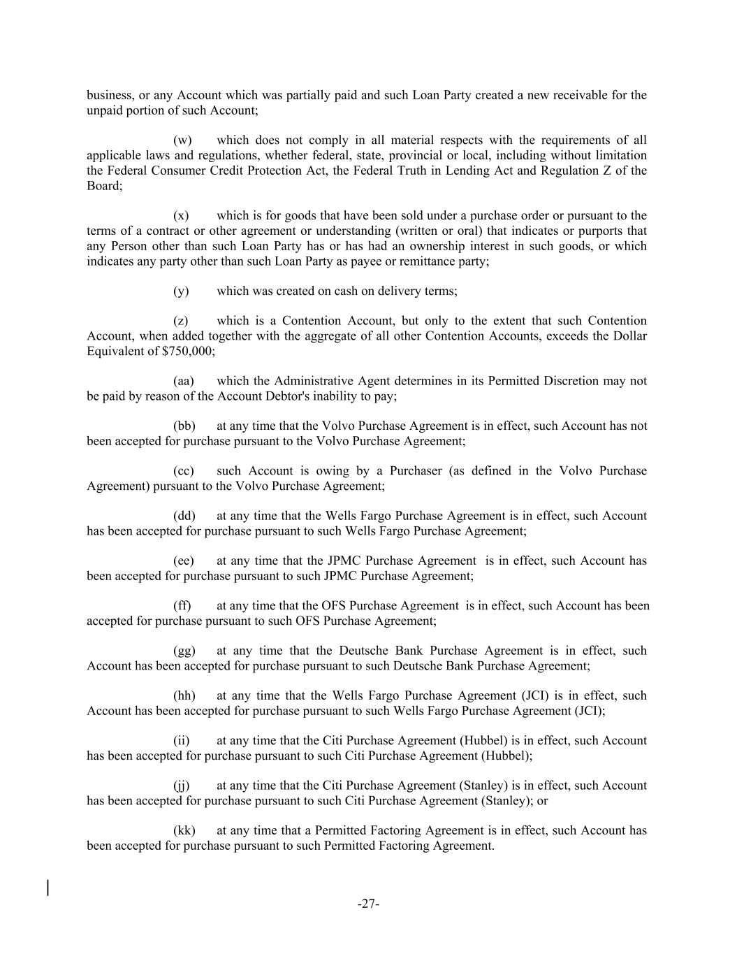 business, or any Account which was partially paid and such Loan Party created a new receivable for the unpaid portion of such Account; (w) which does not comply in all material respects with the requirements of all applicable laws and regulations, whether federal, state, provincial or local, including without limitation the Federal Consumer Credit Protection Act, the Federal Truth in Lending Act and Regulation Z of the Board; (x) which is for goods that have been sold under a purchase order or pursuant to the terms of a contract or other agreement or understanding (written or oral) that indicates or purports that any Person other than such Loan Party has or has had an ownership interest in such goods, or which indicates any party other than such Loan Party as payee or remittance party; (y) which was created on cash on delivery terms; (z) which is a Contention Account, but only to the extent that such Contention Account, when added together with the aggregate of all other Contention Accounts, exceeds the Dollar Equivalent of $750,000; (aa) which the Administrative Agent determines in its Permitted Discretion may not be paid by reason of the Account Debtor's inability to pay; (bb) at any time that the Volvo Purchase Agreement is in effect, such Account has not been accepted for purchase pursuant to the Volvo Purchase Agreement; (cc) such Account is owing by a Purchaser (as defined in the Volvo Purchase Agreement) pursuant to the Volvo Purchase Agreement; (dd) at any time that the Wells Fargo Purchase Agreement is in effect, such Account has been accepted for purchase pursuant to such Wells Fargo Purchase Agreement; (ee) at any time that the JPMC Purchase Agreement is in effect, such Account has been accepted for purchase pursuant to such JPMC Purchase Agreement; (ff) at any time that the OFS Purchase Agreement is in effect, such Account has been accepted for purchase pursuant to such OFS Purchase Agreement; (gg) at any time that the Deutsche Bank Purchase Agreement is in effect, such Account has been accepted for purchase pursuant to such Deutsche Bank Purchase Agreement; (hh) at any time that the Wells Fargo Purchase Agreement (JCI) is in effect, such Account has been accepted for purchase pursuant to such Wells Fargo Purchase Agreement (JCI); (ii) at any time that the Citi Purchase Agreement (Hubbel) is in effect, such Account has been accepted for purchase pursuant to such Citi Purchase Agreement (Hubbel); (jj) at any time that the Citi Purchase Agreement (Stanley) is in effect, such Account has been accepted for purchase pursuant to such Citi Purchase Agreement (Stanley); or (kk) at any time that a Permitted Factoring Agreement is in effect, such Account has been accepted for purchase pursuant to such Permitted Factoring Agreement. -27-