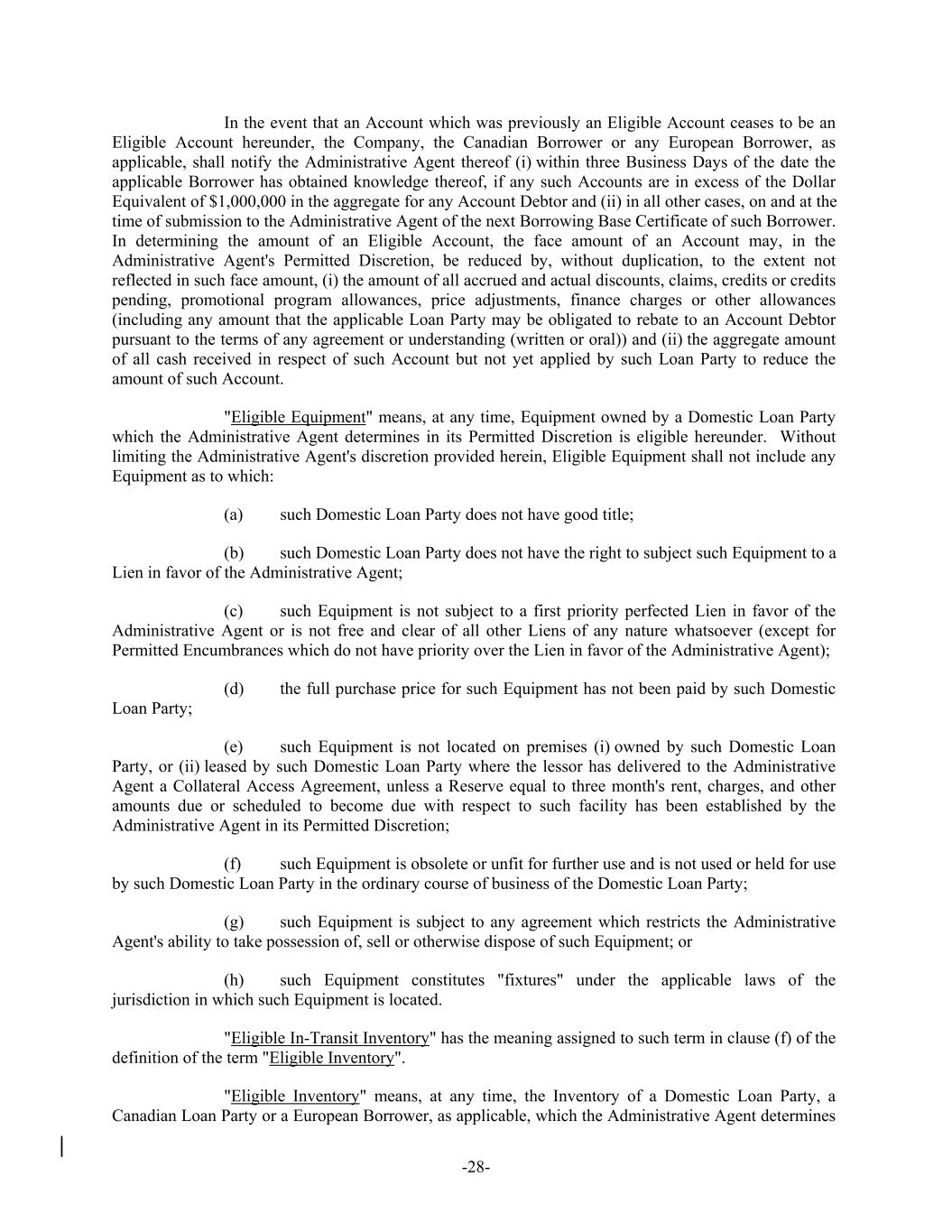 In the event that an Account which was previously an Eligible Account ceases to be an Eligible Account hereunder, the Company, the Canadian Borrower or any European Borrower, as applicable, shall notify the Administrative Agent thereof (i) within three Business Days of the date the applicable Borrower has obtained knowledge thereof, if any such Accounts are in excess of the Dollar Equivalent of $1,000,000 in the aggregate for any Account Debtor and (ii) in all other cases, on and at the time of submission to the Administrative Agent of the next Borrowing Base Certificate of such Borrower. In determining the amount of an Eligible Account, the face amount of an Account may, in the Administrative Agent's Permitted Discretion, be reduced by, without duplication, to the extent not reflected in such face amount, (i) the amount of all accrued and actual discounts, claims, credits or credits pending, promotional program allowances, price adjustments, finance charges or other allowances (including any amount that the applicable Loan Party may be obligated to rebate to an Account Debtor pursuant to the terms of any agreement or understanding (written or oral)) and (ii) the aggregate amount of all cash received in respect of such Account but not yet applied by such Loan Party to reduce the amount of such Account. "Eligible Equipment" means, at any time, Equipment owned by a Domestic Loan Party which the Administrative Agent determines in its Permitted Discretion is eligible hereunder. Without limiting the Administrative Agent's discretion provided herein, Eligible Equipment shall not include any Equipment as to which: (a) such Domestic Loan Party does not have good title; (b) such Domestic Loan Party does not have the right to subject such Equipment to a Lien in favor of the Administrative Agent; (c) such Equipment is not subject to a first priority perfected Lien in favor of the Administrative Agent or is not free and clear of all other Liens of any nature whatsoever (except for Permitted Encumbrances which do not have priority over the Lien in favor of the Administrative Agent); (d) the full purchase price for such Equipment has not been paid by such Domestic Loan Party; (e) such Equipment is not located on premises (i) owned by such Domestic Loan Party, or (ii) leased by such Domestic Loan Party where the lessor has delivered to the Administrative Agent a Collateral Access Agreement, unless a Reserve equal to three month's rent, charges, and other amounts due or scheduled to become due with respect to such facility has been established by the Administrative Agent in its Permitted Discretion; (f) such Equipment is obsolete or unfit for further use and is not used or held for use by such Domestic Loan Party in the ordinary course of business of the Domestic Loan Party; (g) such Equipment is subject to any agreement which restricts the Administrative Agent's ability to take possession of, sell or otherwise dispose of such Equipment; or (h) such Equipment constitutes "fixtures" under the applicable laws of the jurisdiction in which such Equipment is located. "Eligible In-Transit Inventory" has the meaning assigned to such term in clause (f) of the definition of the term "Eligible Inventory". "Eligible Inventory" means, at any time, the Inventory of a Domestic Loan Party, a Canadian Loan Party or a European Borrower, as applicable, which the Administrative Agent determines -28-