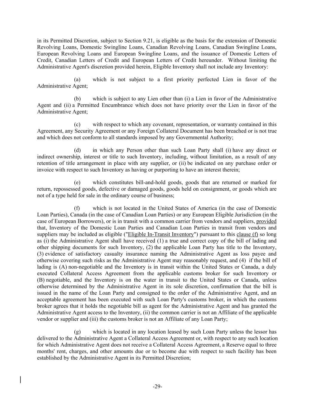 in its Permitted Discretion, subject to Section 9.21, is eligible as the basis for the extension of Domestic Revolving Loans, Domestic Swingline Loans, Canadian Revolving Loans, Canadian Swingline Loans, European Revolving Loans and European Swingline Loans, and the issuance of Domestic Letters of Credit, Canadian Letters of Credit and European Letters of Credit hereunder. Without limiting the Administrative Agent's discretion provided herein, Eligible Inventory shall not include any Inventory: (a) which is not subject to a first priority perfected Lien in favor of the Administrative Agent; (b) which is subject to any Lien other than (i) a Lien in favor of the Administrative Agent and (ii) a Permitted Encumbrance which does not have priority over the Lien in favor of the Administrative Agent; (c) with respect to which any covenant, representation, or warranty contained in this Agreement, any Security Agreement or any Foreign Collateral Document has been breached or is not true and which does not conform to all standards imposed by any Governmental Authority; (d) in which any Person other than such Loan Party shall (i) have any direct or indirect ownership, interest or title to such Inventory, including, without limitation, as a result of any retention of title arrangement in place with any supplier, or (ii) be indicated on any purchase order or invoice with respect to such Inventory as having or purporting to have an interest therein; (e) which constitutes bill-and-hold goods, goods that are returned or marked for return, repossessed goods, defective or damaged goods, goods held on consignment, or goods which are not of a type held for sale in the ordinary course of business; (f) which is not located in the United States of America (in the case of Domestic Loan Parties), Canada (in the case of Canadian Loan Parties) or any European Eligible Jurisdiction (in the case of European Borrowers), or is in transit with a common carrier from vendors and suppliers, provided that, Inventory of the Domestic Loan Parties and Canadian Loan Parties in transit from vendors and suppliers may be included as eligible ("Eligible In-Transit Inventory") pursuant to this clause (f) so long as (i) the Administrative Agent shall have received (1) a true and correct copy of the bill of lading and other shipping documents for such Inventory, (2) the applicable Loan Party has title to the Inventory, (3) evidence of satisfactory casualty insurance naming the Administrative Agent as loss payee and otherwise covering such risks as the Administrative Agent may reasonably request, and (4) if the bill of lading is (A) non-negotiable and the Inventory is in transit within the United States or Canada, a duly executed Collateral Access Agreement from the applicable customs broker for such Inventory or (B) negotiable, and the Inventory is on the water in transit to the United States or Canada, unless otherwise determined by the Administrative Agent in its sole discretion, confirmation that the bill is issued in the name of the Loan Party and consigned to the order of the Administrative Agent, and an acceptable agreement has been executed with such Loan Party's customs broker, in which the customs broker agrees that it holds the negotiable bill as agent for the Administrative Agent and has granted the Administrative Agent access to the Inventory, (ii) the common carrier is not an Affiliate of the applicable vendor or supplier and (iii) the customs broker is not an Affiliate of any Loan Party; (g) which is located in any location leased by such Loan Party unless the lessor has delivered to the Administrative Agent a Collateral Access Agreement or, with respect to any such location for which Administrative Agent does not receive a Collateral Access Agreement, a Reserve equal to three months' rent, charges, and other amounts due or to become due with respect to such facility has been established by the Administrative Agent in its Permitted Discretion; -29-