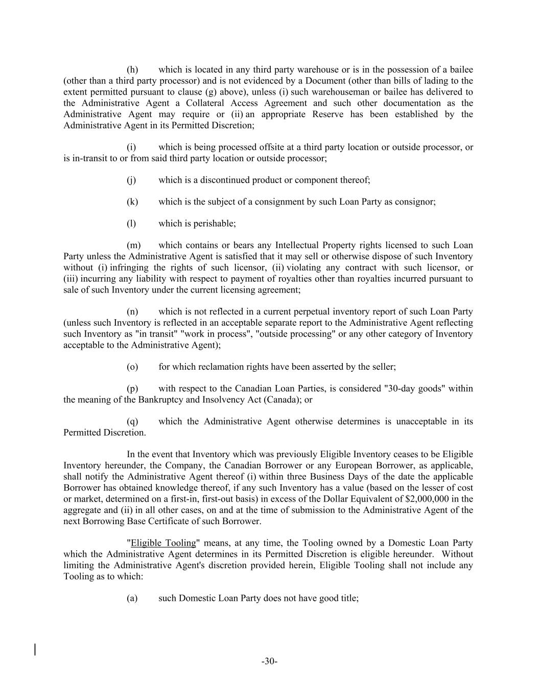 (h) which is located in any third party warehouse or is in the possession of a bailee (other than a third party processor) and is not evidenced by a Document (other than bills of lading to the extent permitted pursuant to clause (g) above), unless (i) such warehouseman or bailee has delivered to the Administrative Agent a Collateral Access Agreement and such other documentation as the Administrative Agent may require or (ii) an appropriate Reserve has been established by the Administrative Agent in its Permitted Discretion; (i) which is being processed offsite at a third party location or outside processor, or is in-transit to or from said third party location or outside processor; (j) which is a discontinued product or component thereof; (k) which is the subject of a consignment by such Loan Party as consignor; (l) which is perishable; (m) which contains or bears any Intellectual Property rights licensed to such Loan Party unless the Administrative Agent is satisfied that it may sell or otherwise dispose of such Inventory without (i) infringing the rights of such licensor, (ii) violating any contract with such licensor, or (iii) incurring any liability with respect to payment of royalties other than royalties incurred pursuant to sale of such Inventory under the current licensing agreement; (n) which is not reflected in a current perpetual inventory report of such Loan Party (unless such Inventory is reflected in an acceptable separate report to the Administrative Agent reflecting such Inventory as "in transit" "work in process", "outside processing" or any other category of Inventory acceptable to the Administrative Agent); (o) for which reclamation rights have been asserted by the seller; (p) with respect to the Canadian Loan Parties, is considered "30-day goods" within the meaning of the Bankruptcy and Insolvency Act (Canada); or (q) which the Administrative Agent otherwise determines is unacceptable in its Permitted Discretion. In the event that Inventory which was previously Eligible Inventory ceases to be Eligible Inventory hereunder, the Company, the Canadian Borrower or any European Borrower, as applicable, shall notify the Administrative Agent thereof (i) within three Business Days of the date the applicable Borrower has obtained knowledge thereof, if any such Inventory has a value (based on the lesser of cost or market, determined on a first-in, first-out basis) in excess of the Dollar Equivalent of $2,000,000 in the aggregate and (ii) in all other cases, on and at the time of submission to the Administrative Agent of the next Borrowing Base Certificate of such Borrower. "Eligible Tooling" means, at any time, the Tooling owned by a Domestic Loan Party which the Administrative Agent determines in its Permitted Discretion is eligible hereunder. Without limiting the Administrative Agent's discretion provided herein, Eligible Tooling shall not include any Tooling as to which: (a) such Domestic Loan Party does not have good title; -30-