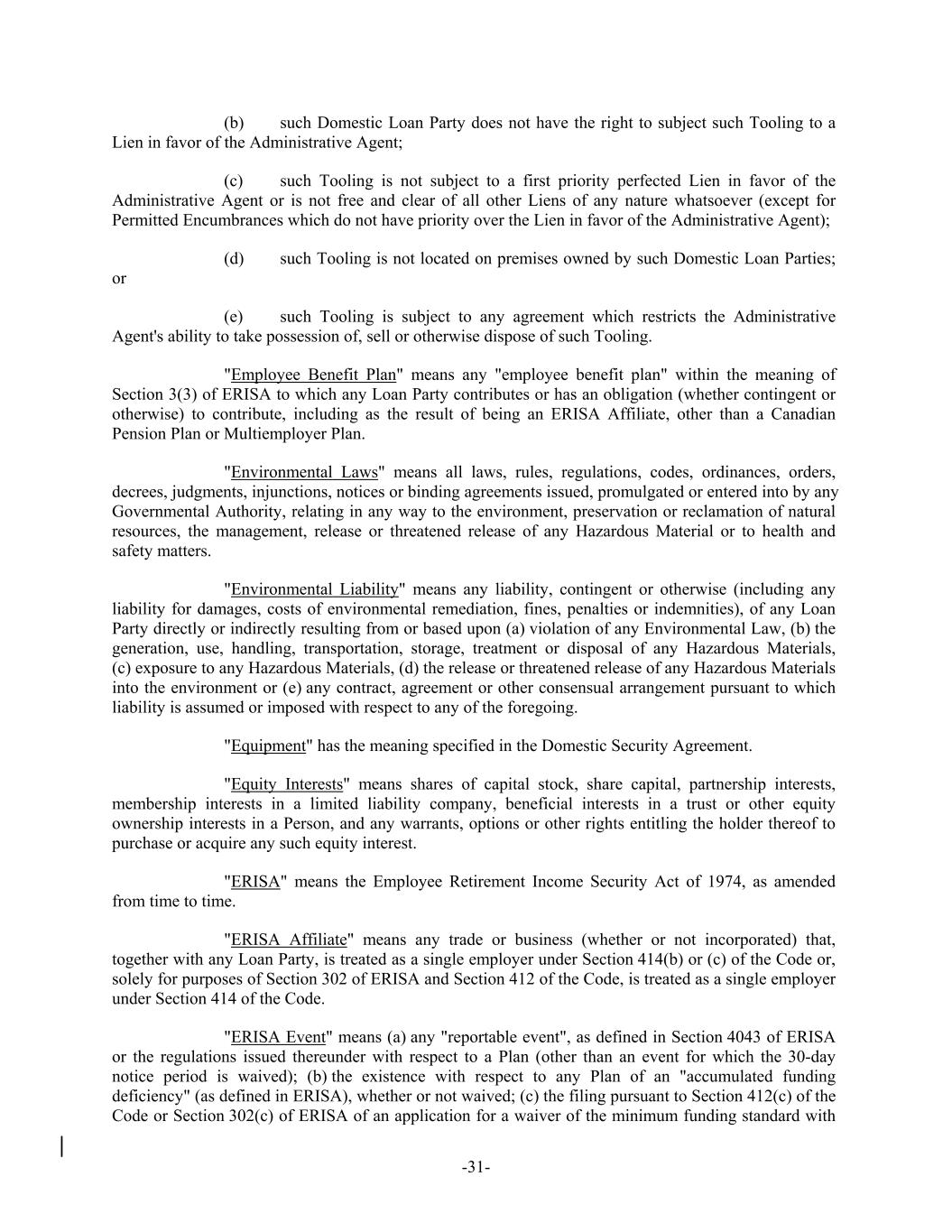(b) such Domestic Loan Party does not have the right to subject such Tooling to a Lien in favor of the Administrative Agent; (c) such Tooling is not subject to a first priority perfected Lien in favor of the Administrative Agent or is not free and clear of all other Liens of any nature whatsoever (except for Permitted Encumbrances which do not have priority over the Lien in favor of the Administrative Agent); (d) such Tooling is not located on premises owned by such Domestic Loan Parties; or (e) such Tooling is subject to any agreement which restricts the Administrative Agent's ability to take possession of, sell or otherwise dispose of such Tooling. "Employee Benefit Plan" means any "employee benefit plan" within the meaning of Section 3(3) of ERISA to which any Loan Party contributes or has an obligation (whether contingent or otherwise) to contribute, including as the result of being an ERISA Affiliate, other than a Canadian Pension Plan or Multiemployer Plan. "Environmental Laws" means all laws, rules, regulations, codes, ordinances, orders, decrees, judgments, injunctions, notices or binding agreements issued, promulgated or entered into by any Governmental Authority, relating in any way to the environment, preservation or reclamation of natural resources, the management, release or threatened release of any Hazardous Material or to health and safety matters. "Environmental Liability" means any liability, contingent or otherwise (including any liability for damages, costs of environmental remediation, fines, penalties or indemnities), of any Loan Party directly or indirectly resulting from or based upon (a) violation of any Environmental Law, (b) the generation, use, handling, transportation, storage, treatment or disposal of any Hazardous Materials, (c) exposure to any Hazardous Materials, (d) the release or threatened release of any Hazardous Materials into the environment or (e) any contract, agreement or other consensual arrangement pursuant to which liability is assumed or imposed with respect to any of the foregoing. "Equipment" has the meaning specified in the Domestic Security Agreement. "Equity Interests" means shares of capital stock, share capital, partnership interests, membership interests in a limited liability company, beneficial interests in a trust or other equity ownership interests in a Person, and any warrants, options or other rights entitling the holder thereof to purchase or acquire any such equity interest. "ERISA" means the Employee Retirement Income Security Act of 1974, as amended from time to time. "ERISA Affiliate" means any trade or business (whether or not incorporated) that, together with any Loan Party, is treated as a single employer under Section 414(b) or (c) of the Code or, solely for purposes of Section 302 of ERISA and Section 412 of the Code, is treated as a single employer under Section 414 of the Code. "ERISA Event" means (a) any "reportable event", as defined in Section 4043 of ERISA or the regulations issued thereunder with respect to a Plan (other than an event for which the 30-day notice period is waived); (b) the existence with respect to any Plan of an "accumulated funding deficiency" (as defined in ERISA), whether or not waived; (c) the filing pursuant to Section 412(c) of the Code or Section 302(c) of ERISA of an application for a waiver of the minimum funding standard with -31-