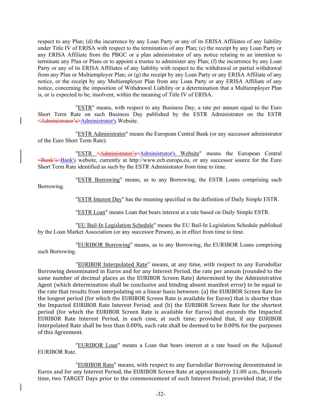 respect to any Plan; (d) the incurrence by any Loan Party or any of its ERISA Affiliates of any liability under Title IV of ERISA with respect to the termination of any Plan; (e) the receipt by any Loan Party or any ERISA Affiliate from the PBGC or a plan administrator of any notice relating to an intention to terminate any Plan or Plans or to appoint a trustee to administer any Plan; (f) the incurrence by any Loan Party or any of its ERISA Affiliates of any liability with respect to the withdrawal or partial withdrawal from any Plan or Multiemployer Plan; or (g) the receipt by any Loan Party or any ERISA Affiliate of any notice, or the receipt by any Multiemployer Plan from any Loan Party or any ERISA Affiliate of any notice, concerning the imposition of Withdrawal Liability or a determination that a Multiemployer Plan is, or is expected to be, insolvent, within the meaning of Title IV of ERISA. "ESTR" means, with respect to any Business Day, a rate per annum equal to the Euro Short Term Rate on such Business Day published by the ESTR Administrator on the ESTR <Administrator’s>Administrator's Website. "ESTR Administrator" means the European Central Bank (or any successor administrator of the Euro Short Term Rate). "ESTR <Administrator’s>Administrator's Website" means the European Central <Bank’s>Bank's website, currently at http://www.ecb.europa.eu, or any successor source for the Euro Short Term Rate identified as such by the ESTR Administrator from time to time. "ESTR Borrowing" means, as to any Borrowing, the ESTR Loans comprising such Borrowing. "ESTR Interest Day" has the meaning specified in the definition of Daily Simple ESTR. "ESTR Loan" means Loan that bears interest at a rate based on Daily Simple ESTR. "EU Bail-In Legislation Schedule" means the EU Bail-In Legislation Schedule published by the Loan Market Association (or any successor Person), as in effect from time to time. "EURIBOR Borrowing" means, as to any Borrowing, the EURIBOR Loans comprising such Borrowing. "EURIBOR Interpolated Rate" means, at any time, with respect to any Eurodollar Borrowing denominated in Euros and for any Interest Period, the rate per annum (rounded to the same number of decimal places as the EURIBOR Screen Rate) determined by the Administrative Agent (which determination shall be conclusive and binding absent manifest error) to be equal to the rate that results from interpolating on a linear basis between: (a) the EURIBOR Screen Rate for the longest period (for which the EURIBOR Screen Rate is available for Euros) that is shorter than the Impacted EURIBOR Rate Interest Period; and (b) the EURIBOR Screen Rate for the shortest period (for which the EURIBOR Screen Rate is available for Euros) that exceeds the Impacted EURIBOR Rate Interest Period, in each case, at such time; provided that, if any EURIBOR Interpolated Rate shall be less than 0.00%, such rate shall be deemed to be 0.00% for the purposes of this Agreement. "EURIBOR Loan" means a Loan that bears interest at a rate based on the Adjusted EURIBOR Rate. "EURIBOR Rate" means, with respect to any Eurodollar Borrowing denominated in Euros and for any Interest Period, the EURIBOR Screen Rate at approximately 11:00 a.m., Brussels time, two TARGET Days prior to the commencement of such Interest Period; provided that, if the -32-