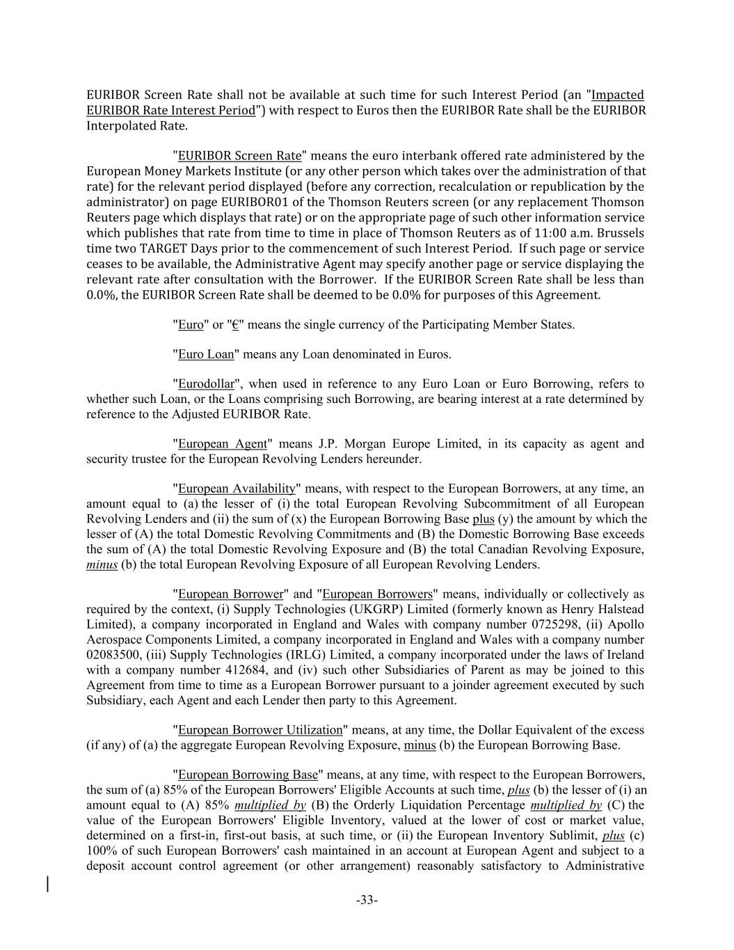 EURIBOR Screen Rate shall not be available at such time for such Interest Period (an "Impacted EURIBOR Rate Interest Period") with respect to Euros then the EURIBOR Rate shall be the EURIBOR Interpolated Rate. "EURIBOR Screen Rate" means the euro interbank offered rate administered by the European Money Markets Institute (or any other person which takes over the administration of that rate) for the relevant period displayed (before any correction, recalculation or republication by the administrator) on page EURIBOR01 of the Thomson Reuters screen (or any replacement Thomson Reuters page which displays that rate) or on the appropriate page of such other information service which publishes that rate from time to time in place of Thomson Reuters as of 11:00 a.m. Brussels time two TARGET Days prior to the commencement of such Interest Period. If such page or service ceases to be available, the Administrative Agent may specify another page or service displaying the relevant rate after consultation with the Borrower. If the EURIBOR Screen Rate shall be less than 0.0%, the EURIBOR Screen Rate shall be deemed to be 0.0% for purposes of this Agreement. "Euro" or "€" means the single currency of the Participating Member States. "Euro Loan" means any Loan denominated in Euros. "Eurodollar", when used in reference to any Euro Loan or Euro Borrowing, refers to whether such Loan, or the Loans comprising such Borrowing, are bearing interest at a rate determined by reference to the Adjusted EURIBOR Rate. "European Agent" means J.P. Morgan Europe Limited, in its capacity as agent and security trustee for the European Revolving Lenders hereunder. "European Availability" means, with respect to the European Borrowers, at any time, an amount equal to (a) the lesser of (i) the total European Revolving Subcommitment of all European Revolving Lenders and (ii) the sum of (x) the European Borrowing Base plus (y) the amount by which the lesser of (A) the total Domestic Revolving Commitments and (B) the Domestic Borrowing Base exceeds the sum of (A) the total Domestic Revolving Exposure and (B) the total Canadian Revolving Exposure, minus (b) the total European Revolving Exposure of all European Revolving Lenders. "European Borrower" and "European Borrowers" means, individually or collectively as required by the context, (i) Supply Technologies (UKGRP) Limited (formerly known as Henry Halstead Limited), a company incorporated in England and Wales with company number 0725298, (ii) Apollo Aerospace Components Limited, a company incorporated in England and Wales with a company number 02083500, (iii) Supply Technologies (IRLG) Limited, a company incorporated under the laws of Ireland with a company number 412684, and (iv) such other Subsidiaries of Parent as may be joined to this Agreement from time to time as a European Borrower pursuant to a joinder agreement executed by such Subsidiary, each Agent and each Lender then party to this Agreement. "European Borrower Utilization" means, at any time, the Dollar Equivalent of the excess (if any) of (a) the aggregate European Revolving Exposure, minus (b) the European Borrowing Base. "European Borrowing Base" means, at any time, with respect to the European Borrowers, the sum of (a) 85% of the European Borrowers' Eligible Accounts at such time, plus (b) the lesser of (i) an amount equal to (A) 85% multiplied by (B) the Orderly Liquidation Percentage multiplied by (C) the value of the European Borrowers' Eligible Inventory, valued at the lower of cost or market value, determined on a first-in, first-out basis, at such time, or (ii) the European Inventory Sublimit, plus (c) 100% of such European Borrowers' cash maintained in an account at European Agent and subject to a deposit account control agreement (or other arrangement) reasonably satisfactory to Administrative -33-