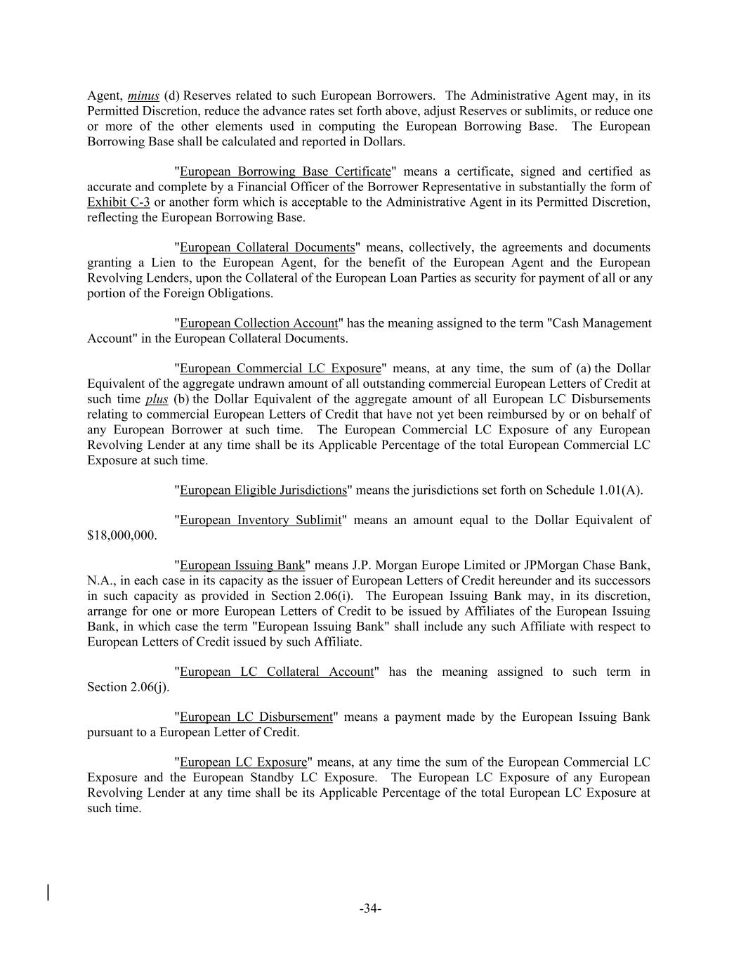 Agent, minus (d) Reserves related to such European Borrowers. The Administrative Agent may, in its Permitted Discretion, reduce the advance rates set forth above, adjust Reserves or sublimits, or reduce one or more of the other elements used in computing the European Borrowing Base. The European Borrowing Base shall be calculated and reported in Dollars. "European Borrowing Base Certificate" means a certificate, signed and certified as accurate and complete by a Financial Officer of the Borrower Representative in substantially the form of Exhibit C-3 or another form which is acceptable to the Administrative Agent in its Permitted Discretion, reflecting the European Borrowing Base. "European Collateral Documents" means, collectively, the agreements and documents granting a Lien to the European Agent, for the benefit of the European Agent and the European Revolving Lenders, upon the Collateral of the European Loan Parties as security for payment of all or any portion of the Foreign Obligations. "European Collection Account" has the meaning assigned to the term "Cash Management Account" in the European Collateral Documents. "European Commercial LC Exposure" means, at any time, the sum of (a) the Dollar Equivalent of the aggregate undrawn amount of all outstanding commercial European Letters of Credit at such time plus (b) the Dollar Equivalent of the aggregate amount of all European LC Disbursements relating to commercial European Letters of Credit that have not yet been reimbursed by or on behalf of any European Borrower at such time. The European Commercial LC Exposure of any European Revolving Lender at any time shall be its Applicable Percentage of the total European Commercial LC Exposure at such time. "European Eligible Jurisdictions" means the jurisdictions set forth on Schedule 1.01(A). "European Inventory Sublimit" means an amount equal to the Dollar Equivalent of $18,000,000. "European Issuing Bank" means J.P. Morgan Europe Limited or JPMorgan Chase Bank, N.A., in each case in its capacity as the issuer of European Letters of Credit hereunder and its successors in such capacity as provided in Section 2.06(i). The European Issuing Bank may, in its discretion, arrange for one or more European Letters of Credit to be issued by Affiliates of the European Issuing Bank, in which case the term "European Issuing Bank" shall include any such Affiliate with respect to European Letters of Credit issued by such Affiliate. "European LC Collateral Account" has the meaning assigned to such term in Section 2.06(j). "European LC Disbursement" means a payment made by the European Issuing Bank pursuant to a European Letter of Credit. "European LC Exposure" means, at any time the sum of the European Commercial LC Exposure and the European Standby LC Exposure. The European LC Exposure of any European Revolving Lender at any time shall be its Applicable Percentage of the total European LC Exposure at such time. -34-
