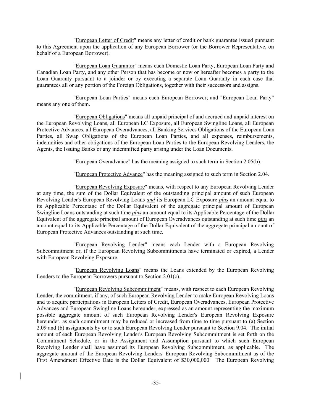 "European Letter of Credit" means any letter of credit or bank guarantee issued pursuant to this Agreement upon the application of any European Borrower (or the Borrower Representative, on behalf of a European Borrower). "European Loan Guarantor" means each Domestic Loan Party, European Loan Party and Canadian Loan Party, and any other Person that has become or now or hereafter becomes a party to the Loan Guaranty pursuant to a joinder or by executing a separate Loan Guaranty in each case that guarantees all or any portion of the Foreign Obligations, together with their successors and assigns. "European Loan Parties" means each European Borrower; and "European Loan Party" means any one of them. "European Obligations" means all unpaid principal of and accrued and unpaid interest on the European Revolving Loans, all European LC Exposure, all European Swingline Loans, all European Protective Advances, all European Overadvances, all Banking Services Obligations of the European Loan Parties, all Swap Obligations of the European Loan Parties, and all expenses, reimbursements, indemnities and other obligations of the European Loan Parties to the European Revolving Lenders, the Agents, the Issuing Banks or any indemnified party arising under the Loan Documents. "European Overadvance" has the meaning assigned to such term in Section 2.05(b). "European Protective Advance" has the meaning assigned to such term in Section 2.04. "European Revolving Exposure" means, with respect to any European Revolving Lender at any time, the sum of the Dollar Equivalent of the outstanding principal amount of such European Revolving Lender's European Revolving Loans and its European LC Exposure plus an amount equal to its Applicable Percentage of the Dollar Equivalent of the aggregate principal amount of European Swingline Loans outstanding at such time plus an amount equal to its Applicable Percentage of the Dollar Equivalent of the aggregate principal amount of European Overadvances outstanding at such time plus an amount equal to its Applicable Percentage of the Dollar Equivalent of the aggregate principal amount of European Protective Advances outstanding at such time. "European Revolving Lender" means each Lender with a European Revolving Subcommitment or, if the European Revolving Subcommitments have terminated or expired, a Lender with European Revolving Exposure. "European Revolving Loans" means the Loans extended by the European Revolving Lenders to the European Borrowers pursuant to Section 2.01(c). "European Revolving Subcommitment" means, with respect to each European Revolving Lender, the commitment, if any, of such European Revolving Lender to make European Revolving Loans and to acquire participations in European Letters of Credit, European Overadvances, European Protective Advances and European Swingline Loans hereunder, expressed as an amount representing the maximum possible aggregate amount of such European Revolving Lender's European Revolving Exposure hereunder, as such commitment may be reduced or increased from time to time pursuant to (a) Section 2.09 and (b) assignments by or to such European Revolving Lender pursuant to Section 9.04. The initial amount of each European Revolving Lender's European Revolving Subcommitment is set forth on the Commitment Schedule, or in the Assignment and Assumption pursuant to which such European Revolving Lender shall have assumed its European Revolving Subcommitment, as applicable. The aggregate amount of the European Revolving Lenders' European Revolving Subcommitment as of the First Amendment Effective Date is the Dollar Equivalent of $30,000,000. The European Revolving -35-