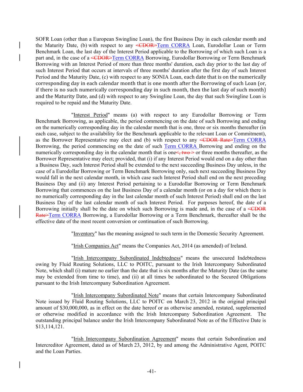 SOFR Loan (other than a European Swingline Loan), the first Business Day in each calendar month and the Maturity Date, (b) with respect to any <CDOR>Term CORRA Loan, Eurodollar Loan or Term Benchmark Loan, the last day of the Interest Period applicable to the Borrowing of which such Loan is a part and, in the case of a <CDOR>Term CORRA Borrowing, Eurodollar Borrowing or Term Benchmark Borrowing with an Interest Period of more than three months' duration, each day prior to the last day of such Interest Period that occurs at intervals of three months' duration after the first day of such Interest Period and the Maturity Date, (c) with respect to any SONIA Loan, each date that is on the numerically corresponding day in each calendar month that is one month after the Borrowing of such Loan (or, if there is no such numerically corresponding day in such month, then the last day of such month) and the Maturity Date, and (d) with respect to any Swingline Loan, the day that such Swingline Loan is required to be repaid and the Maturity Date. "Interest Period" means (a) with respect to any Eurodollar Borrowing or Term Benchmark Borrowing, as applicable, the period commencing on the date of such Borrowing and ending on the numerically corresponding day in the calendar month that is one, three or six months thereafter (in each case, subject to the availability for the Benchmark applicable to the relevant Loan or Commitment), as the Borrower Representative may elect and (b) with respect to any <CDOR Rate>Term CORRA Borrowing, the period commencing on the date of such Term CORRA Borrowing and ending on the numerically corresponding day in the calendar month that is one<, two > or three months thereafter, as the Borrower Representative may elect; provided, that (i) if any Interest Period would end on a day other than a Business Day, such Interest Period shall be extended to the next succeeding Business Day unless, in the case of a Eurodollar Borrowing or Term Benchmark Borrowing only, such next succeeding Business Day would fall in the next calendar month, in which case such Interest Period shall end on the next preceding Business Day and (ii) any Interest Period pertaining to a Eurodollar Borrowing or Term Benchmark Borrowing that commences on the last Business Day of a calendar month (or on a day for which there is no numerically corresponding day in the last calendar month of such Interest Period) shall end on the last Business Day of the last calendar month of such Interest Period. For purposes hereof, the date of a Borrowing initially shall be the date on which such Borrowing is made and, in the case of a <CDOR Rate>Term CORRA Borrowing, a Eurodollar Borrowing or a Term Benchmark, thereafter shall be the effective date of the most recent conversion or continuation of such Borrowing. "Inventory" has the meaning assigned to such term in the Domestic Security Agreement. "Irish Companies Act" means the Companies Act, 2014 (as amended) of Ireland. "Irish Intercompany Subordinated Indebtedness" means the unsecured Indebtedness owing by Fluid Routing Solutions, LLC to POITC, pursuant to the Irish Intercompany Subordinated Note, which shall (i) mature no earlier than the date that is six months after the Maturity Date (as the same may be extended from time to time), and (ii) at all times be subordinated to the Secured Obligations pursuant to the Irish Intercompany Subordination Agreement. "Irish Intercompany Subordinated Note" means that certain Intercompany Subordinated Note issued by Fluid Routing Solutions, LLC to POITC on March 23, 2012 in the original principal amount of $30,000,000, as in effect on the date hereof or as otherwise amended, restated, supplemented or otherwise modified in accordance with the Irish Intercompany Subordination Agreement. The outstanding principal balance under the Irish Intercompany Subordinated Note as of the Effective Date is $13,114,121. "Irish Intercompany Subordination Agreement" means that certain Subordination and Intercreditor Agreement, dated as of March 23, 2012, by and among the Administrative Agent, POITC and the Loan Parties. -41-