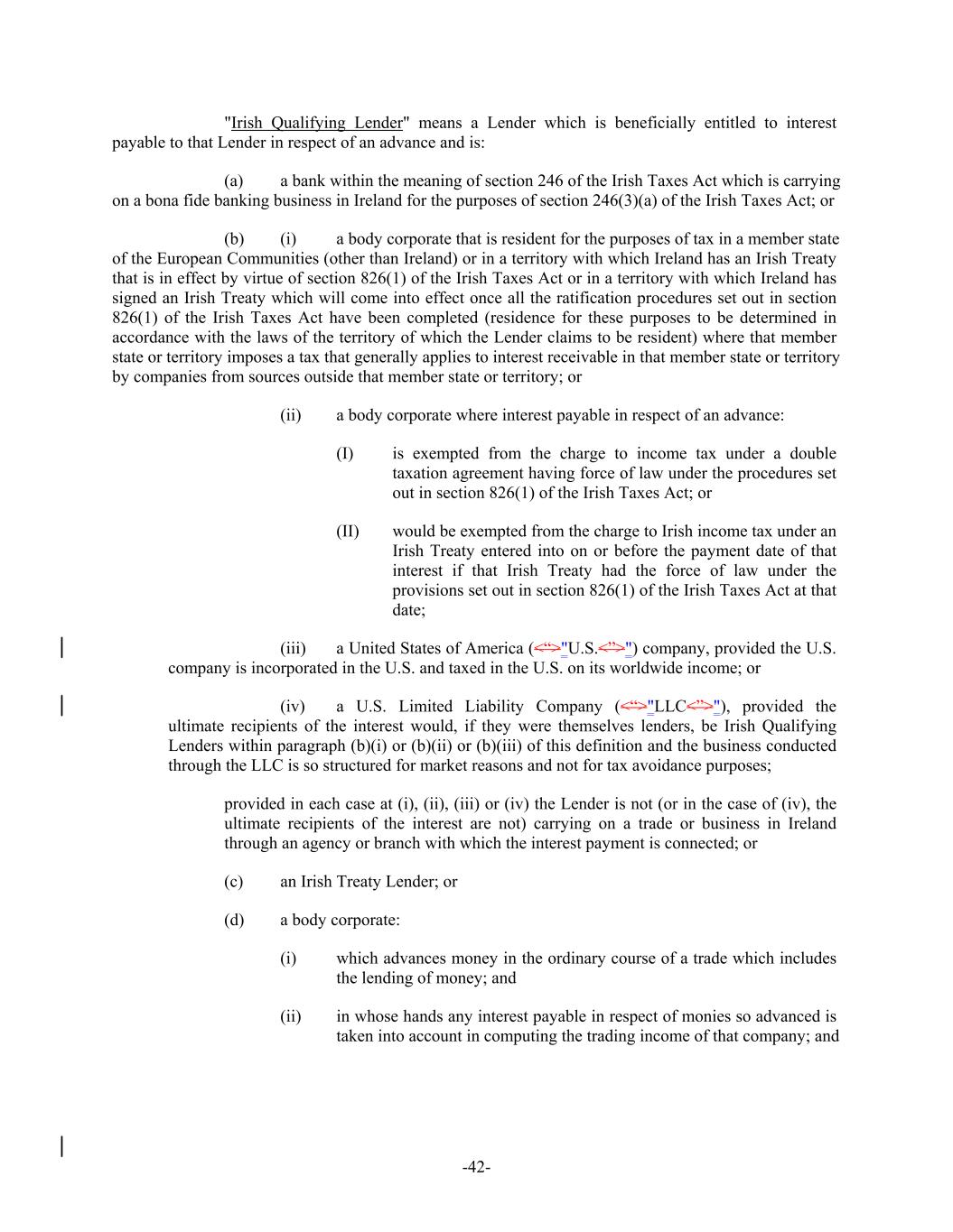 "Irish Qualifying Lender" means a Lender which is beneficially entitled to interest payable to that Lender in respect of an advance and is: (a) a bank within the meaning of section 246 of the Irish Taxes Act which is carrying on a bona fide banking business in Ireland for the purposes of section 246(3)(a) of the Irish Taxes Act; or (b) (i) a body corporate that is resident for the purposes of tax in a member state of the European Communities (other than Ireland) or in a territory with which Ireland has an Irish Treaty that is in effect by virtue of section 826(1) of the Irish Taxes Act or in a territory with which Ireland has signed an Irish Treaty which will come into effect once all the ratification procedures set out in section 826(1) of the Irish Taxes Act have been completed (residence for these purposes to be determined in accordance with the laws of the territory of which the Lender claims to be resident) where that member state or territory imposes a tax that generally applies to interest receivable in that member state or territory by companies from sources outside that member state or territory; or (ii) a body corporate where interest payable in respect of an advance: (I) is exempted from the charge to income tax under a double taxation agreement having force of law under the procedures set out in section 826(1) of the Irish Taxes Act; or (II) would be exempted from the charge to Irish income tax under an Irish Treaty entered into on or before the payment date of that interest if that Irish Treaty had the force of law under the provisions set out in section 826(1) of the Irish Taxes Act at that date; (iii) a United States of America (<“>"U.S.<”>") company, provided the U.S. company is incorporated in the U.S. and taxed in the U.S. on its worldwide income; or (iv) a U.S. Limited Liability Company (<“>"LLC<”>"), provided the ultimate recipients of the interest would, if they were themselves lenders, be Irish Qualifying Lenders within paragraph (b)(i) or (b)(ii) or (b)(iii) of this definition and the business conducted through the LLC is so structured for market reasons and not for tax avoidance purposes; provided in each case at (i), (ii), (iii) or (iv) the Lender is not (or in the case of (iv), the ultimate recipients of the interest are not) carrying on a trade or business in Ireland through an agency or branch with which the interest payment is connected; or (c) an Irish Treaty Lender; or (d) a body corporate: (i) which advances money in the ordinary course of a trade which includes the lending of money; and (ii) in whose hands any interest payable in respect of monies so advanced is taken into account in computing the trading income of that company; and -42-