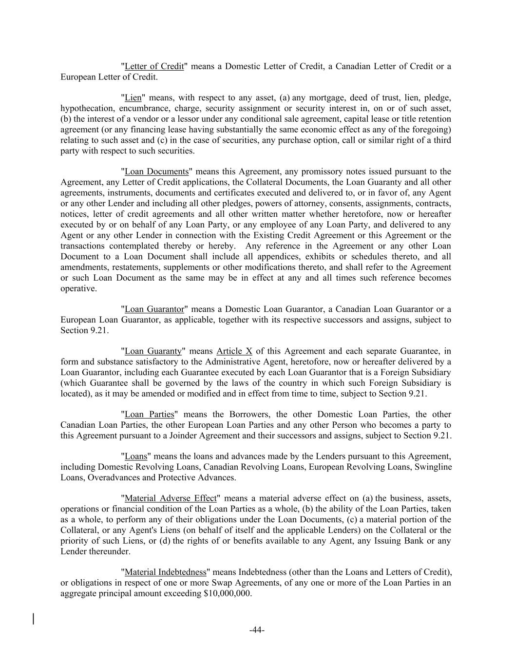 "Letter of Credit" means a Domestic Letter of Credit, a Canadian Letter of Credit or a European Letter of Credit. "Lien" means, with respect to any asset, (a) any mortgage, deed of trust, lien, pledge, hypothecation, encumbrance, charge, security assignment or security interest in, on or of such asset, (b) the interest of a vendor or a lessor under any conditional sale agreement, capital lease or title retention agreement (or any financing lease having substantially the same economic effect as any of the foregoing) relating to such asset and (c) in the case of securities, any purchase option, call or similar right of a third party with respect to such securities. "Loan Documents" means this Agreement, any promissory notes issued pursuant to the Agreement, any Letter of Credit applications, the Collateral Documents, the Loan Guaranty and all other agreements, instruments, documents and certificates executed and delivered to, or in favor of, any Agent or any other Lender and including all other pledges, powers of attorney, consents, assignments, contracts, notices, letter of credit agreements and all other written matter whether heretofore, now or hereafter executed by or on behalf of any Loan Party, or any employee of any Loan Party, and delivered to any Agent or any other Lender in connection with the Existing Credit Agreement or this Agreement or the transactions contemplated thereby or hereby. Any reference in the Agreement or any other Loan Document to a Loan Document shall include all appendices, exhibits or schedules thereto, and all amendments, restatements, supplements or other modifications thereto, and shall refer to the Agreement or such Loan Document as the same may be in effect at any and all times such reference becomes operative. "Loan Guarantor" means a Domestic Loan Guarantor, a Canadian Loan Guarantor or a European Loan Guarantor, as applicable, together with its respective successors and assigns, subject to Section 9.21. "Loan Guaranty" means Article X of this Agreement and each separate Guarantee, in form and substance satisfactory to the Administrative Agent, heretofore, now or hereafter delivered by a Loan Guarantor, including each Guarantee executed by each Loan Guarantor that is a Foreign Subsidiary (which Guarantee shall be governed by the laws of the country in which such Foreign Subsidiary is located), as it may be amended or modified and in effect from time to time, subject to Section 9.21. "Loan Parties" means the Borrowers, the other Domestic Loan Parties, the other Canadian Loan Parties, the other European Loan Parties and any other Person who becomes a party to this Agreement pursuant to a Joinder Agreement and their successors and assigns, subject to Section 9.21. "Loans" means the loans and advances made by the Lenders pursuant to this Agreement, including Domestic Revolving Loans, Canadian Revolving Loans, European Revolving Loans, Swingline Loans, Overadvances and Protective Advances. "Material Adverse Effect" means a material adverse effect on (a) the business, assets, operations or financial condition of the Loan Parties as a whole, (b) the ability of the Loan Parties, taken as a whole, to perform any of their obligations under the Loan Documents, (c) a material portion of the Collateral, or any Agent's Liens (on behalf of itself and the applicable Lenders) on the Collateral or the priority of such Liens, or (d) the rights of or benefits available to any Agent, any Issuing Bank or any Lender thereunder. "Material Indebtedness" means Indebtedness (other than the Loans and Letters of Credit), or obligations in respect of one or more Swap Agreements, of any one or more of the Loan Parties in an aggregate principal amount exceeding $10,000,000. -44-