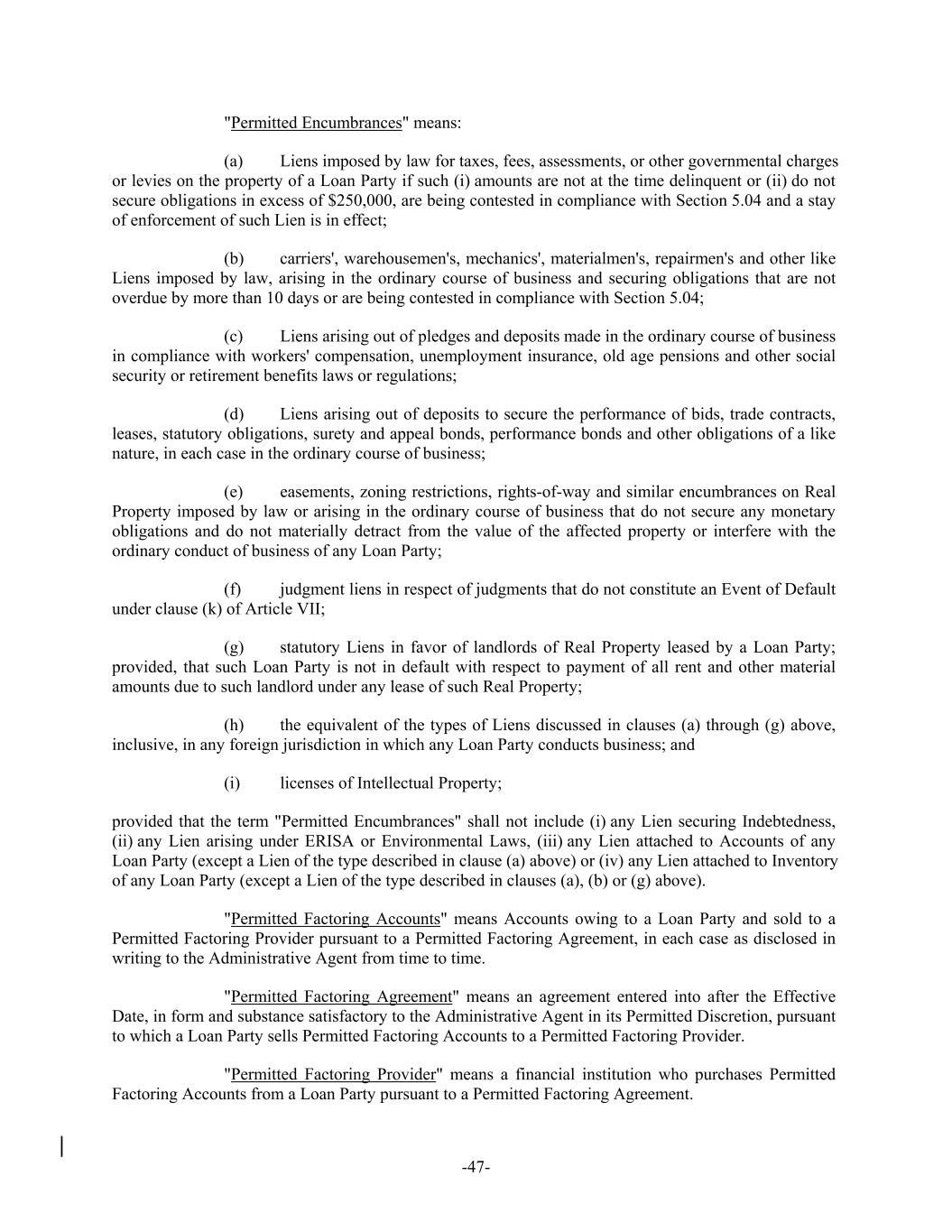 "Permitted Encumbrances" means: (a) Liens imposed by law for taxes, fees, assessments, or other governmental charges or levies on the property of a Loan Party if such (i) amounts are not at the time delinquent or (ii) do not secure obligations in excess of $250,000, are being contested in compliance with Section 5.04 and a stay of enforcement of such Lien is in effect; (b) carriers', warehousemen's, mechanics', materialmen's, repairmen's and other like Liens imposed by law, arising in the ordinary course of business and securing obligations that are not overdue by more than 10 days or are being contested in compliance with Section 5.04; (c) Liens arising out of pledges and deposits made in the ordinary course of business in compliance with workers' compensation, unemployment insurance, old age pensions and other social security or retirement benefits laws or regulations; (d) Liens arising out of deposits to secure the performance of bids, trade contracts, leases, statutory obligations, surety and appeal bonds, performance bonds and other obligations of a like nature, in each case in the ordinary course of business; (e) easements, zoning restrictions, rights-of-way and similar encumbrances on Real Property imposed by law or arising in the ordinary course of business that do not secure any monetary obligations and do not materially detract from the value of the affected property or interfere with the ordinary conduct of business of any Loan Party; (f) judgment liens in respect of judgments that do not constitute an Event of Default under clause (k) of Article VII; (g) statutory Liens in favor of landlords of Real Property leased by a Loan Party; provided, that such Loan Party is not in default with respect to payment of all rent and other material amounts due to such landlord under any lease of such Real Property; (h) the equivalent of the types of Liens discussed in clauses (a) through (g) above, inclusive, in any foreign jurisdiction in which any Loan Party conducts business; and (i) licenses of Intellectual Property; provided that the term "Permitted Encumbrances" shall not include (i) any Lien securing Indebtedness, (ii) any Lien arising under ERISA or Environmental Laws, (iii) any Lien attached to Accounts of any Loan Party (except a Lien of the type described in clause (a) above) or (iv) any Lien attached to Inventory of any Loan Party (except a Lien of the type described in clauses (a), (b) or (g) above). "Permitted Factoring Accounts" means Accounts owing to a Loan Party and sold to a Permitted Factoring Provider pursuant to a Permitted Factoring Agreement, in each case as disclosed in writing to the Administrative Agent from time to time. "Permitted Factoring Agreement" means an agreement entered into after the Effective Date, in form and substance satisfactory to the Administrative Agent in its Permitted Discretion, pursuant to which a Loan Party sells Permitted Factoring Accounts to a Permitted Factoring Provider. "Permitted Factoring Provider" means a financial institution who purchases Permitted Factoring Accounts from a Loan Party pursuant to a Permitted Factoring Agreement. -47-