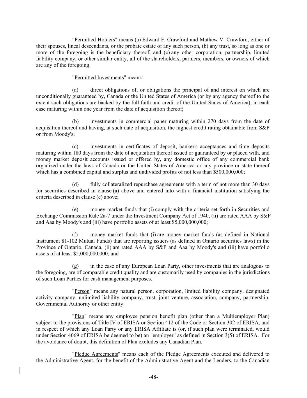 "Permitted Holders" means (a) Edward F. Crawford and Mathew V. Crawford, either of their spouses, lineal descendants, or the probate estate of any such person, (b) any trust, so long as one or more of the foregoing is the beneficiary thereof, and (c) any other corporation, partnership, limited liability company, or other similar entity, all of the shareholders, partners, members, or owners of which are any of the foregoing. "Permitted Investments" means: (a) direct obligations of, or obligations the principal of and interest on which are unconditionally guaranteed by, Canada or the United States of America (or by any agency thereof to the extent such obligations are backed by the full faith and credit of the United States of America), in each case maturing within one year from the date of acquisition thereof; (b) investments in commercial paper maturing within 270 days from the date of acquisition thereof and having, at such date of acquisition, the highest credit rating obtainable from S&P or from Moody's; (c) investments in certificates of deposit, banker's acceptances and time deposits maturing within 180 days from the date of acquisition thereof issued or guaranteed by or placed with, and money market deposit accounts issued or offered by, any domestic office of any commercial bank organized under the laws of Canada or the United States of America or any province or state thereof which has a combined capital and surplus and undivided profits of not less than $500,000,000; (d) fully collateralized repurchase agreements with a term of not more than 30 days for securities described in clause (a) above and entered into with a financial institution satisfying the criteria described in clause (c) above; (e) money market funds that (i) comply with the criteria set forth in Securities and Exchange Commission Rule 2a-7 under the Investment Company Act of 1940, (ii) are rated AAA by S&P and Aaa by Moody's and (iii) have portfolio assets of at least $5,000,000,000; (f) money market funds that (i) are money market funds (as defined in National Instrument 81-102 Mutual Funds) that are reporting issuers (as defined in Ontario securities laws) in the Province of Ontario, Canada, (ii) are rated AAA by S&P and Aaa by Moody's and (iii) have portfolio assets of at least $5,000,000,000; and (g) in the case of any European Loan Party, other investments that are analogous to the foregoing, are of comparable credit quality and are customarily used by companies in the jurisdictions of such Loan Parties for cash management purposes. "Person" means any natural person, corporation, limited liability company, designated activity company, unlimited liability company, trust, joint venture, association, company, partnership, Governmental Authority or other entity. "Plan" means any employee pension benefit plan (other than a Multiemployer Plan) subject to the provisions of Title IV of ERISA or Section 412 of the Code or Section 302 of ERISA, and in respect of which any Loan Party or any ERISA Affiliate is (or, if such plan were terminated, would under Section 4069 of ERISA be deemed to be) an "employer" as defined in Section 3(5) of ERISA. For the avoidance of doubt, this definition of Plan excludes any Canadian Plan. "Pledge Agreements" means each of the Pledge Agreements executed and delivered to the Administrative Agent, for the benefit of the Administrative Agent and the Lenders, to the Canadian -48-