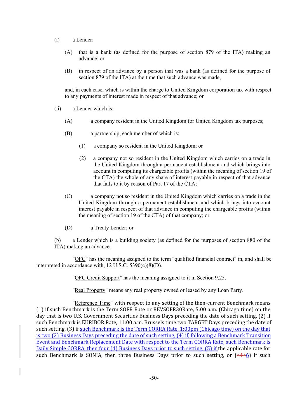 (i) a Lender: (A) that is a bank (as defined for the purpose of section 879 of the ITA) making an advance; or (B) in respect of an advance by a person that was a bank (as defined for the purpose of section 879 of the ITA) at the time that such advance was made, and, in each case, which is within the charge to United Kingdom corporation tax with respect to any payments of interest made in respect of that advance; or (ii) a Lender which is: (A) a company resident in the United Kingdom for United Kingdom tax purposes; (B) a partnership, each member of which is: (1) a company so resident in the United Kingdom; or (2) a company not so resident in the United Kingdom which carries on a trade in the United Kingdom through a permanent establishment and which brings into account in computing its chargeable profits (within the meaning of section 19 of the CTA) the whole of any share of interest payable in respect of that advance that falls to it by reason of Part 17 of the CTA; (C) a company not so resident in the United Kingdom which carries on a trade in the United Kingdom through a permanent establishment and which brings into account interest payable in respect of that advance in computing the chargeable profits (within the meaning of section 19 of the CTA) of that company; or (D) a Treaty Lender; or (b) a Lender which is a building society (as defined for the purposes of section 880 of the ITA) making an advance. "QFC" has the meaning assigned to the term "qualified financial contract" in, and shall be interpreted in accordance with, 12 U.S.C. 5390(c)(8)(D). "QFC Credit Support" has the meaning assigned to it in Section 9.25. "Real Property" means any real property owned or leased by any Loan Party. "Reference Time" with respect to any setting of the then-current Benchmark means (1) if such Benchmark is the Term SOFR Rate or REVSOFR30Rate, 5:00 a.m. (Chicago time) on the day that is two U.S. Government Securities Business Days preceding the date of such setting, (2) if such Benchmark is EURIBOR Rate, 11:00 a.m. Brussels time two TARGET Days preceding the date of such setting, (3) if such Benchmark is the Term CORRA Rate, 1:00pm (Chicago time) on the day that is two (2) Business Days preceding the date of such setting, (4) if, following a Benchmark Transition Event and Benchmark Replacement Date with respect to the Term CORRA Rate, such Benchmark is Daily Simple CORRA, then four (4) Business Days prior to such setting, (5) if the applicable rate for such Benchmark is SONIA, then three Business Days prior to such setting, or (<4>6) if such -50-