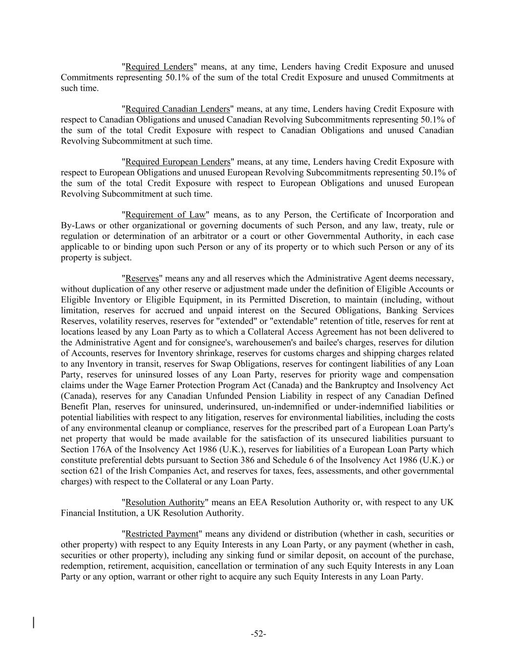 "Required Lenders" means, at any time, Lenders having Credit Exposure and unused Commitments representing 50.1% of the sum of the total Credit Exposure and unused Commitments at such time. "Required Canadian Lenders" means, at any time, Lenders having Credit Exposure with respect to Canadian Obligations and unused Canadian Revolving Subcommitments representing 50.1% of the sum of the total Credit Exposure with respect to Canadian Obligations and unused Canadian Revolving Subcommitment at such time. "Required European Lenders" means, at any time, Lenders having Credit Exposure with respect to European Obligations and unused European Revolving Subcommitments representing 50.1% of the sum of the total Credit Exposure with respect to European Obligations and unused European Revolving Subcommitment at such time. "Requirement of Law" means, as to any Person, the Certificate of Incorporation and By-Laws or other organizational or governing documents of such Person, and any law, treaty, rule or regulation or determination of an arbitrator or a court or other Governmental Authority, in each case applicable to or binding upon such Person or any of its property or to which such Person or any of its property is subject. "Reserves" means any and all reserves which the Administrative Agent deems necessary, without duplication of any other reserve or adjustment made under the definition of Eligible Accounts or Eligible Inventory or Eligible Equipment, in its Permitted Discretion, to maintain (including, without limitation, reserves for accrued and unpaid interest on the Secured Obligations, Banking Services Reserves, volatility reserves, reserves for "extended" or "extendable" retention of title, reserves for rent at locations leased by any Loan Party as to which a Collateral Access Agreement has not been delivered to the Administrative Agent and for consignee's, warehousemen's and bailee's charges, reserves for dilution of Accounts, reserves for Inventory shrinkage, reserves for customs charges and shipping charges related to any Inventory in transit, reserves for Swap Obligations, reserves for contingent liabilities of any Loan Party, reserves for uninsured losses of any Loan Party, reserves for priority wage and compensation claims under the Wage Earner Protection Program Act (Canada) and the Bankruptcy and Insolvency Act (Canada), reserves for any Canadian Unfunded Pension Liability in respect of any Canadian Defined Benefit Plan, reserves for uninsured, underinsured, un-indemnified or under-indemnified liabilities or potential liabilities with respect to any litigation, reserves for environmental liabilities, including the costs of any environmental cleanup or compliance, reserves for the prescribed part of a European Loan Party's net property that would be made available for the satisfaction of its unsecured liabilities pursuant to Section 176A of the Insolvency Act 1986 (U.K.), reserves for liabilities of a European Loan Party which constitute preferential debts pursuant to Section 386 and Schedule 6 of the Insolvency Act 1986 (U.K.) or section 621 of the Irish Companies Act, and reserves for taxes, fees, assessments, and other governmental charges) with respect to the Collateral or any Loan Party. "Resolution Authority" means an EEA Resolution Authority or, with respect to any UK Financial Institution, a UK Resolution Authority. "Restricted Payment" means any dividend or distribution (whether in cash, securities or other property) with respect to any Equity Interests in any Loan Party, or any payment (whether in cash, securities or other property), including any sinking fund or similar deposit, on account of the purchase, redemption, retirement, acquisition, cancellation or termination of any such Equity Interests in any Loan Party or any option, warrant or other right to acquire any such Equity Interests in any Loan Party. -52-