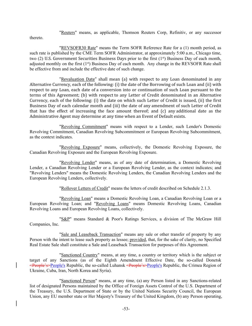 "Reuters" means, as applicable, Thomson Reuters Corp, Refinitiv, or any successor thereto. "REVSOFR30 Rate" means the Term SOFR Reference Rate for a (1) month period, as such rate is published by the CME Term SOFR Administrator, at approximately 5:00 a.m., Chicago time, two (2) U.S. Government Securities Business Days prior to the first (1st) Business Day of each month, adjusted monthly on the first (1st) Business Day of each month. Any change in the REVSOFR Rate shall be effective from and include the effective date of such change. "Revaluation Date" shall mean (a) with respect to any Loan denominated in any Alternative Currency, each of the following: (i) the date of the Borrowing of such Loan and (ii) with respect to any Loan, each date of a conversion into or continuation of such Loan pursuant to the terms of this Agreement; (b) with respect to any Letter of Credit denominated in an Alternative Currency, each of the following: (i) the date on which such Letter of Credit is issued, (ii) the first Business Day of each calendar month and (iii) the date of any amendment of such Letter of Credit that has the effect of increasing the face amount thereof; and (c) any additional date as the Administrative Agent may determine at any time when an Event of Default exists. "Revolving Commitment" means with respect to a Lender, such Lender's Domestic Revolving Commitment, Canadian Revolving Subcommitment or European Revolving Subcommitment, as the context indicates. "Revolving Exposure" means, collectively, the Domestic Revolving Exposure, the Canadian Revolving Exposure and the European Revolving Exposure. "Revolving Lender" means, as of any date of determination, a Domestic Revolving Lender, a Canadian Revolving Lender or a European Revolving Lender, as the context indicates; and "Revolving Lenders" means the Domestic Revolving Lenders, the Canadian Revolving Lenders and the European Revolving Lenders, collectively. "Rollover Letters of Credit" means the letters of credit described on Schedule 2.1.3. "Revolving Loan" means a Domestic Revolving Loan, a Canadian Revolving Loan or a European Revolving Loan; and "Revolving Loans" means Domestic Revolving Loans, Canadian Revolving Loans and European Revolving Loans, collectively. "S&P" means Standard & Poor's Ratings Services, a division of The McGraw Hill Companies, Inc. "Sale and Leaseback Transaction" means any sale or other transfer of property by any Person with the intent to lease such property as lessee; provided, that, for the sake of clarity, no Specified Real Estate Sale shall constitute a Sale and Leaseback Transaction for purposes of this Agreement. "Sanctioned Country" means, at any time, a country or territory which is the subject or target of any Sanctions (as of the Eighth Amendment Effective Date, the so-called Donetsk <People’s>People's Republic, the so-called Luhansk <People’s>People's Republic, the Crimea Region of Ukraine, Cuba, Iran, North Korea and Syria). "Sanctioned Person" means, at any time, (a) any Person listed in any Sanctions-related list of designated Persons maintained by the Office of Foreign Assets Control of the U.S. Department of the Treasury, the U.S. Department of State or by the United Nations Security Council, the European Union, any EU member state or Her Majesty's Treasury of the United Kingdom, (b) any Person operating, -53-