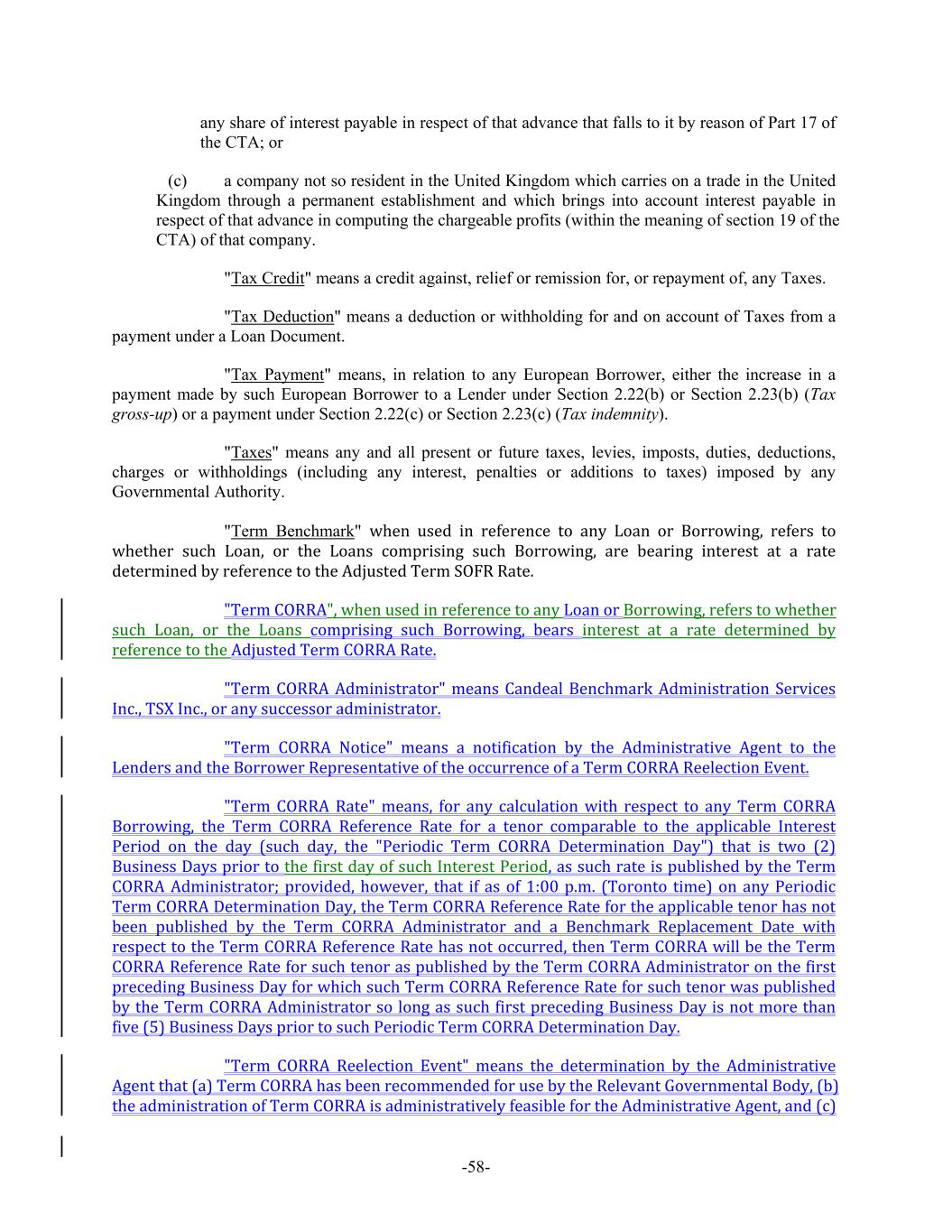 any share of interest payable in respect of that advance that falls to it by reason of Part 17 of the CTA; or (c) a company not so resident in the United Kingdom which carries on a trade in the United Kingdom through a permanent establishment and which brings into account interest payable in respect of that advance in computing the chargeable profits (within the meaning of section 19 of the CTA) of that company. "Tax Credit" means a credit against, relief or remission for, or repayment of, any Taxes. "Tax Deduction" means a deduction or withholding for and on account of Taxes from a payment under a Loan Document. "Tax Payment" means, in relation to any European Borrower, either the increase in a payment made by such European Borrower to a Lender under Section 2.22(b) or Section 2.23(b) (Tax gross-up) or a payment under Section 2.22(c) or Section 2.23(c) (Tax indemnity). "Taxes" means any and all present or future taxes, levies, imposts, duties, deductions, charges or withholdings (including any interest, penalties or additions to taxes) imposed by any Governmental Authority. "Term Benchmark" when used in reference to any Loan or Borrowing, refers to whether such Loan, or the Loans comprising such Borrowing, are bearing interest at a rate determined by reference to the Adjusted Term SOFR Rate. "Term CORRA", when used in reference to any Loan or Borrowing, refers to whether such Loan, or the Loans comprising such Borrowing, bears interest at a rate determined by reference to the Adjusted Term CORRA Rate. "Term CORRA Administrator" means Candeal Benchmark Administration Services Inc., TSX Inc., or any successor administrator. "Term CORRA Notice" means a notification by the Administrative Agent to the Lenders and the Borrower Representative of the occurrence of a Term CORRA Reelection Event. "Term CORRA Rate" means, for any calculation with respect to any Term CORRA Borrowing, the Term CORRA Reference Rate for a tenor comparable to the applicable Interest Period on the day (such day, the "Periodic Term CORRA Determination Day") that is two (2) Business Days prior to the first day of such Interest Period, as such rate is published by the Term CORRA Administrator; provided, however, that if as of 1:00 p.m. (Toronto time) on any Periodic Term CORRA Determination Day, the Term CORRA Reference Rate for the applicable tenor has not been published by the Term CORRA Administrator and a Benchmark Replacement Date with respect to the Term CORRA Reference Rate has not occurred, then Term CORRA will be the Term CORRA Reference Rate for such tenor as published by the Term CORRA Administrator on the first preceding Business Day for which such Term CORRA Reference Rate for such tenor was published by the Term CORRA Administrator so long as such first preceding Business Day is not more than five (5) Business Days prior to such Periodic Term CORRA Determination Day. "Term CORRA Reelection Event" means the determination by the Administrative Agent that (a) Term CORRA has been recommended for use by the Relevant Governmental Body, (b) the administration of Term CORRA is administratively feasible for the Administrative Agent, and (c) -58-