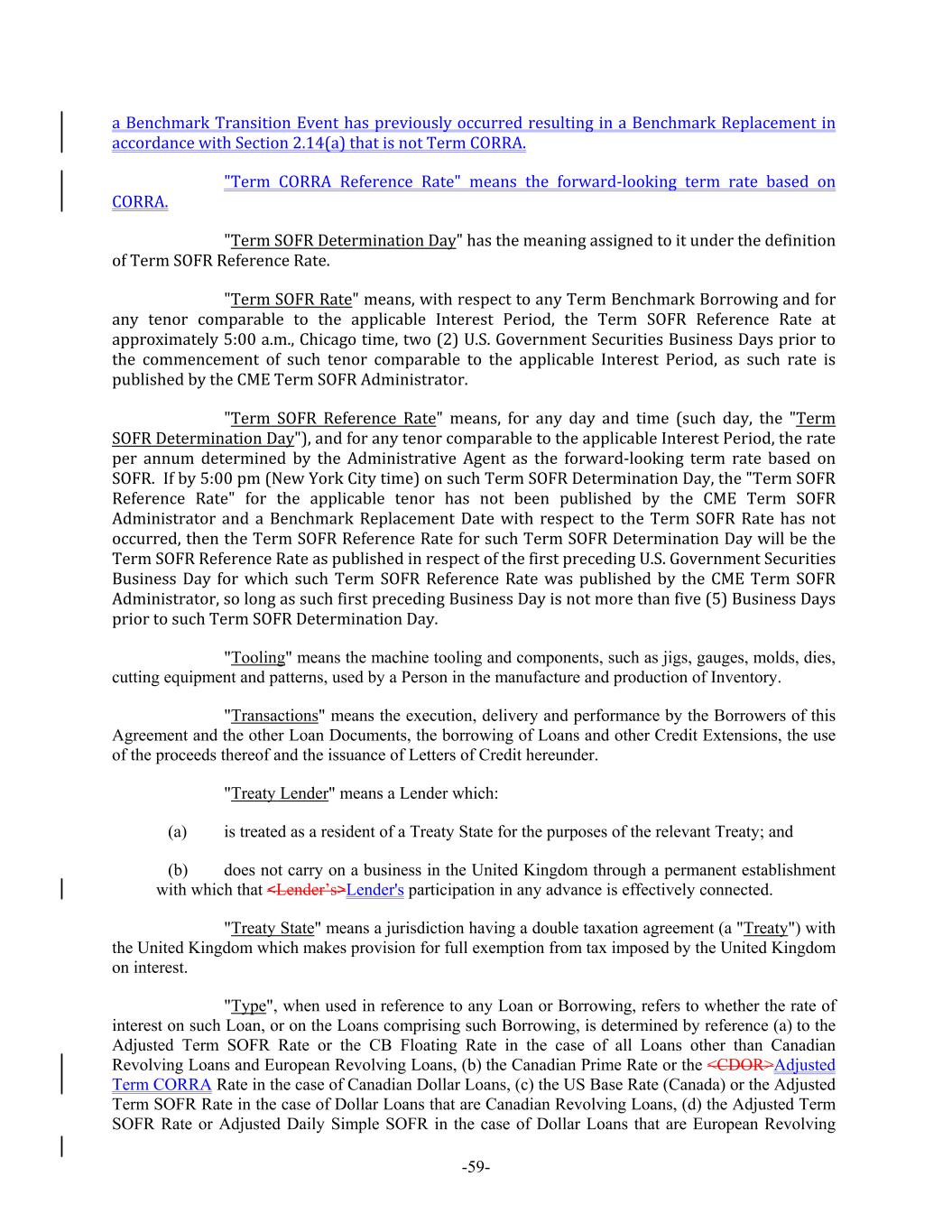 a Benchmark Transition Event has previously occurred resulting in a Benchmark Replacement in accordance with Section 2.14(a) that is not Term CORRA. "Term CORRA Reference Rate" means the forward-looking term rate based on CORRA. "Term SOFR Determination Day" has the meaning assigned to it under the definition of Term SOFR Reference Rate. "Term SOFR Rate" means, with respect to any Term Benchmark Borrowing and for any tenor comparable to the applicable Interest Period, the Term SOFR Reference Rate at approximately 5:00 a.m., Chicago time, two (2) U.S. Government Securities Business Days prior to the commencement of such tenor comparable to the applicable Interest Period, as such rate is published by the CME Term SOFR Administrator. "Term SOFR Reference Rate" means, for any day and time (such day, the "Term SOFR Determination Day"), and for any tenor comparable to the applicable Interest Period, the rate per annum determined by the Administrative Agent as the forward-looking term rate based on SOFR. If by 5:00 pm (New York City time) on such Term SOFR Determination Day, the "Term SOFR Reference Rate" for the applicable tenor has not been published by the CME Term SOFR Administrator and a Benchmark Replacement Date with respect to the Term SOFR Rate has not occurred, then the Term SOFR Reference Rate for such Term SOFR Determination Day will be the Term SOFR Reference Rate as published in respect of the first preceding U.S. Government Securities Business Day for which such Term SOFR Reference Rate was published by the CME Term SOFR Administrator, so long as such first preceding Business Day is not more than five (5) Business Days prior to such Term SOFR Determination Day. "Tooling" means the machine tooling and components, such as jigs, gauges, molds, dies, cutting equipment and patterns, used by a Person in the manufacture and production of Inventory. "Transactions" means the execution, delivery and performance by the Borrowers of this Agreement and the other Loan Documents, the borrowing of Loans and other Credit Extensions, the use of the proceeds thereof and the issuance of Letters of Credit hereunder. "Treaty Lender" means a Lender which: (a) is treated as a resident of a Treaty State for the purposes of the relevant Treaty; and (b) does not carry on a business in the United Kingdom through a permanent establishment with which that <Lender’s>Lender's participation in any advance is effectively connected. "Treaty State" means a jurisdiction having a double taxation agreement (a "Treaty") with the United Kingdom which makes provision for full exemption from tax imposed by the United Kingdom on interest. "Type", when used in reference to any Loan or Borrowing, refers to whether the rate of interest on such Loan, or on the Loans comprising such Borrowing, is determined by reference (a) to the Adjusted Term SOFR Rate or the CB Floating Rate in the case of all Loans other than Canadian Revolving Loans and European Revolving Loans, (b) the Canadian Prime Rate or the <CDOR>Adjusted Term CORRA Rate in the case of Canadian Dollar Loans, (c) the US Base Rate (Canada) or the Adjusted Term SOFR Rate in the case of Dollar Loans that are Canadian Revolving Loans, (d) the Adjusted Term SOFR Rate or Adjusted Daily Simple SOFR in the case of Dollar Loans that are European Revolving -59-