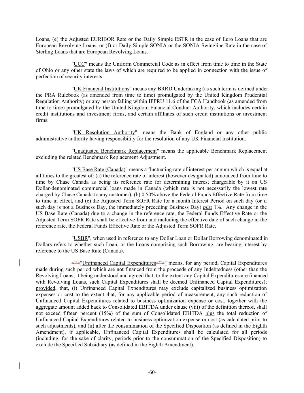 Loans, (e) the Adjusted EURIBOR Rate or the Daily Simple ESTR in the case of Euro Loans that are European Revolving Loans, or (f) or Daily Simple SONIA or the SONIA Swingline Rate in the case of Sterling Loans that are European Revolving Loans. "UCC" means the Uniform Commercial Code as in effect from time to time in the State of Ohio or any other state the laws of which are required to be applied in connection with the issue of perfection of security interests. "UK Financial Institutions" means any BRRD Undertaking (as such term is defined under the PRA Rulebook (as amended from time to time) promulgated by the United Kingdom Prudential Regulation Authority) or any person falling within IFPRU 11.6 of the FCA Handbook (as amended from time to time) promulgated by the United Kingdom Financial Conduct Authority, which includes certain credit institutions and investment firms, and certain affiliates of such credit institutions or investment firms. "UK Resolution Authority" means the Bank of England or any other public administrative authority having responsibility for the resolution of any UK Financial Institution. "Unadjusted Benchmark Replacement" means the applicable Benchmark Replacement excluding the related Benchmark Replacement Adjustment. "US Base Rate (Canada)" means a fluctuating rate of interest per annum which is equal at all times to the greatest of: (a) the reference rate of interest (however designated) announced from time to time by Chase Canada as being its reference rate for determining interest chargeable by it on US Dollar-denominated commercial loans made in Canada (which rate is not necessarily the lowest rate charged by Chase Canada to any customer), (b) 0.50% above the Federal Funds Effective Rate from time to time in effect, and (c) the Adjusted Term SOFR Rate for a month Interest Period on such day (or if such day is not a Business Day, the immediately preceding Business Day) plus 1%. Any change in the US Base Rate (Canada) due to a change in the reference rate, the Federal Funds Effective Rate or the Adjusted Term SOFR Rate shall be effective from and including the effective date of such change in the reference rate, the Federal Funds Effective Rate or the Adjusted Term SOFR Rate. "USBR", when used in reference to any Dollar Loan or Dollar Borrowing denominated in Dollars refers to whether such Loan, or the Loans comprising such Borrowing, are bearing interest by reference to the US Base Rate (Canada). <“>"Unfinanced Capital Expenditures<”>" means, for any period, Capital Expenditures made during such period which are not financed from the proceeds of any Indebtedness (other than the Revolving Loans; it being understood and agreed that, to the extent any Capital Expenditures are financed with Revolving Loans, such Capital Expenditures shall be deemed Unfinanced Capital Expenditures); provided, that, (i) Unfinanced Capital Expenditures may exclude capitalized business optimization expenses or cost to the extent that, for any applicable period of measurement, any such reduction of Unfinanced Capital Expenditures related to business optimization expense or cost, together with the aggregate amount added back to Consolidated EBITDA under clause (viii) of the definition thereof, shall not exceed fifteen percent (15%) of the sum of Consolidated EBITDA plus the total reduction of Unfinanced Capital Expenditures related to business optimization expense or cost (as calculated prior to such adjustments), and (ii) after the consummation of the Specified Disposition (as defined in the Eighth Amendment), if applicable, Unfinanced Capital Expenditures shall be calculated for all periods (including, for the sake of clarity, periods prior to the consummation of the Specified Disposition) to exclude the Specified Subsidiary (as defined in the Eighth Amendment). -60-