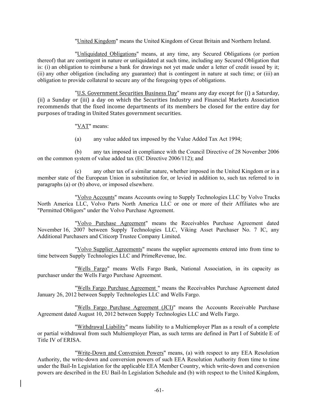 "United Kingdom" means the United Kingdom of Great Britain and Northern Ireland. "Unliquidated Obligations" means, at any time, any Secured Obligations (or portion thereof) that are contingent in nature or unliquidated at such time, including any Secured Obligation that is: (i) an obligation to reimburse a bank for drawings not yet made under a letter of credit issued by it; (ii) any other obligation (including any guarantee) that is contingent in nature at such time; or (iii) an obligation to provide collateral to secure any of the foregoing types of obligations. "U.S. Government Securities Business Day" means any day except for (i) a Saturday, (ii) a Sunday or (iii) a day on which the Securities Industry and Financial Markets Association recommends that the fixed income departments of its members be closed for the entire day for purposes of trading in United States government securities. "VAT" means: (a) any value added tax imposed by the Value Added Tax Act 1994; (b) any tax imposed in compliance with the Council Directive of 28 November 2006 on the common system of value added tax (EC Directive 2006/112); and (c) any other tax of a similar nature, whether imposed in the United Kingdom or in a member state of the European Union in substitution for, or levied in addition to, such tax referred to in paragraphs (a) or (b) above, or imposed elsewhere. "Volvo Accounts" means Accounts owing to Supply Technologies LLC by Volvo Trucks North America LLC, Volvo Parts North America LLC or one or more of their Affiliates who are "Permitted Obligors" under the Volvo Purchase Agreement. "Volvo Purchase Agreement" means the Receivables Purchase Agreement dated November 16, 2007 between Supply Technologies LLC, Viking Asset Purchaser No. 7 IC, any Additional Purchasers and Citicorp Trustee Company Limited. "Volvo Supplier Agreements" means the supplier agreements entered into from time to time between Supply Technologies LLC and PrimeRevenue, Inc. "Wells Fargo" means Wells Fargo Bank, National Association, in its capacity as purchaser under the Wells Fargo Purchase Agreement. "Wells Fargo Purchase Agreement " means the Receivables Purchase Agreement dated January 26, 2012 between Supply Technologies LLC and Wells Fargo. "Wells Fargo Purchase Agreement (JCI)" means the Accounts Receivable Purchase Agreement dated August 10, 2012 between Supply Technologies LLC and Wells Fargo. "Withdrawal Liability" means liability to a Multiemployer Plan as a result of a complete or partial withdrawal from such Multiemployer Plan, as such terms are defined in Part I of Subtitle E of Title IV of ERISA. "Write-Down and Conversion Powers" means, (a) with respect to any EEA Resolution Authority, the write-down and conversion powers of such EEA Resolution Authority from time to time under the Bail-In Legislation for the applicable EEA Member Country, which write-down and conversion powers are described in the EU Bail-In Legislation Schedule and (b) with respect to the United Kingdom, -61-