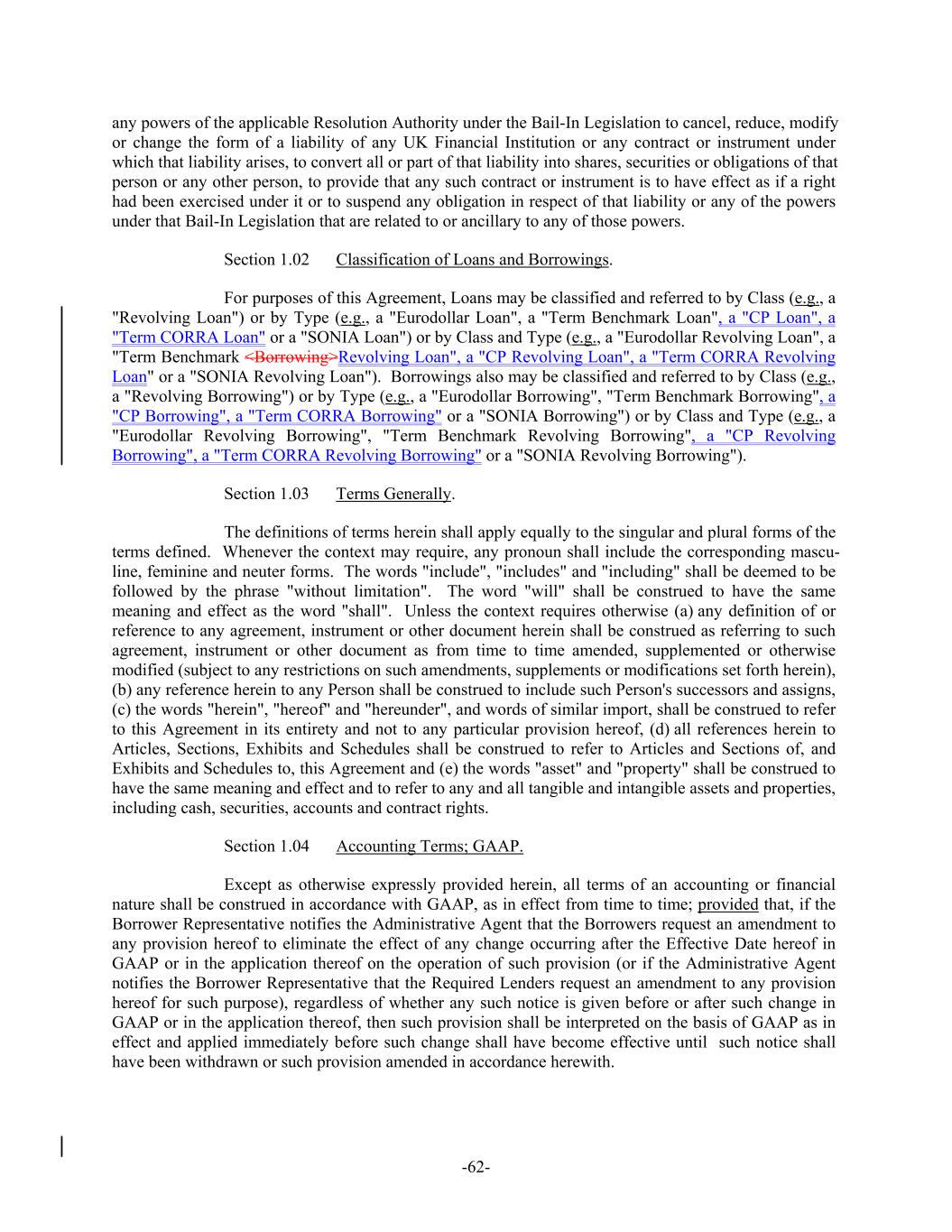 any powers of the applicable Resolution Authority under the Bail-In Legislation to cancel, reduce, modify or change the form of a liability of any UK Financial Institution or any contract or instrument under which that liability arises, to convert all or part of that liability into shares, securities or obligations of that person or any other person, to provide that any such contract or instrument is to have effect as if a right had been exercised under it or to suspend any obligation in respect of that liability or any of the powers under that Bail-In Legislation that are related to or ancillary to any of those powers. Section 1.02 Classification of Loans and Borrowings. For purposes of this Agreement, Loans may be classified and referred to by Class (e.g., a "Revolving Loan") or by Type (e.g., a "Eurodollar Loan", a "Term Benchmark Loan", a "CP Loan", a "Term CORRA Loan" or a "SONIA Loan") or by Class and Type (e.g., a "Eurodollar Revolving Loan", a "Term Benchmark <Borrowing>Revolving Loan", a "CP Revolving Loan", a "Term CORRA Revolving Loan" or a "SONIA Revolving Loan"). Borrowings also may be classified and referred to by Class (e.g., a "Revolving Borrowing") or by Type (e.g., a "Eurodollar Borrowing", "Term Benchmark Borrowing", a "CP Borrowing", a "Term CORRA Borrowing" or a "SONIA Borrowing") or by Class and Type (e.g., a "Eurodollar Revolving Borrowing", "Term Benchmark Revolving Borrowing", a "CP Revolving Borrowing", a "Term CORRA Revolving Borrowing" or a "SONIA Revolving Borrowing"). Section 1.03 Terms Generally. The definitions of terms herein shall apply equally to the singular and plural forms of the terms defined. Whenever the context may require, any pronoun shall include the corresponding mascu- line, feminine and neuter forms. The words "include", "includes" and "including" shall be deemed to be followed by the phrase "without limitation". The word "will" shall be construed to have the same meaning and effect as the word "shall". Unless the context requires otherwise (a) any definition of or reference to any agreement, instrument or other document herein shall be construed as referring to such agreement, instrument or other document as from time to time amended, supplemented or otherwise modified (subject to any restrictions on such amendments, supplements or modifications set forth herein), (b) any reference herein to any Person shall be construed to include such Person's successors and assigns, (c) the words "herein", "hereof" and "hereunder", and words of similar import, shall be construed to refer to this Agreement in its entirety and not to any particular provision hereof, (d) all references herein to Articles, Sections, Exhibits and Schedules shall be construed to refer to Articles and Sections of, and Exhibits and Schedules to, this Agreement and (e) the words "asset" and "property" shall be construed to have the same meaning and effect and to refer to any and all tangible and intangible assets and properties, including cash, securities, accounts and contract rights. Section 1.04 Accounting Terms; GAAP. Except as otherwise expressly provided herein, all terms of an accounting or financial nature shall be construed in accordance with GAAP, as in effect from time to time; provided that, if the Borrower Representative notifies the Administrative Agent that the Borrowers request an amendment to any provision hereof to eliminate the effect of any change occurring after the Effective Date hereof in GAAP or in the application thereof on the operation of such provision (or if the Administrative Agent notifies the Borrower Representative that the Required Lenders request an amendment to any provision hereof for such purpose), regardless of whether any such notice is given before or after such change in GAAP or in the application thereof, then such provision shall be interpreted on the basis of GAAP as in effect and applied immediately before such change shall have become effective until such notice shall have been withdrawn or such provision amended in accordance herewith. -62-