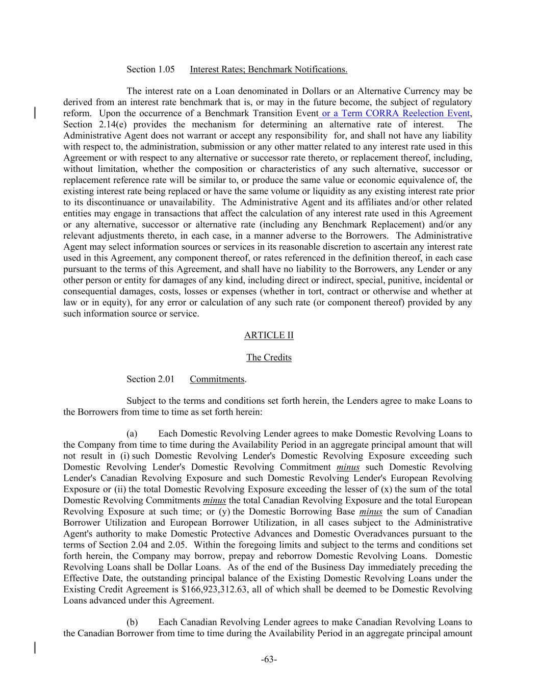 Section 1.05 Interest Rates; Benchmark Notifications. The interest rate on a Loan denominated in Dollars or an Alternative Currency may be derived from an interest rate benchmark that is, or may in the future become, the subject of regulatory reform. Upon the occurrence of a Benchmark Transition Event or a Term CORRA Reelection Event, Section 2.14(e) provides the mechanism for determining an alternative rate of interest. The Administrative Agent does not warrant or accept any responsibility for, and shall not have any liability with respect to, the administration, submission or any other matter related to any interest rate used in this Agreement or with respect to any alternative or successor rate thereto, or replacement thereof, including, without limitation, whether the composition or characteristics of any such alternative, successor or replacement reference rate will be similar to, or produce the same value or economic equivalence of, the existing interest rate being replaced or have the same volume or liquidity as any existing interest rate prior to its discontinuance or unavailability. The Administrative Agent and its affiliates and/or other related entities may engage in transactions that affect the calculation of any interest rate used in this Agreement or any alternative, successor or alternative rate (including any Benchmark Replacement) and/or any relevant adjustments thereto, in each case, in a manner adverse to the Borrowers. The Administrative Agent may select information sources or services in its reasonable discretion to ascertain any interest rate used in this Agreement, any component thereof, or rates referenced in the definition thereof, in each case pursuant to the terms of this Agreement, and shall have no liability to the Borrowers, any Lender or any other person or entity for damages of any kind, including direct or indirect, special, punitive, incidental or consequential damages, costs, losses or expenses (whether in tort, contract or otherwise and whether at law or in equity), for any error or calculation of any such rate (or component thereof) provided by any such information source or service. ARTICLE II The Credits Section 2.01 Commitments. Subject to the terms and conditions set forth herein, the Lenders agree to make Loans to the Borrowers from time to time as set forth herein: (a) Each Domestic Revolving Lender agrees to make Domestic Revolving Loans to the Company from time to time during the Availability Period in an aggregate principal amount that will not result in (i) such Domestic Revolving Lender's Domestic Revolving Exposure exceeding such Domestic Revolving Lender's Domestic Revolving Commitment minus such Domestic Revolving Lender's Canadian Revolving Exposure and such Domestic Revolving Lender's European Revolving Exposure or (ii) the total Domestic Revolving Exposure exceeding the lesser of (x) the sum of the total Domestic Revolving Commitments minus the total Canadian Revolving Exposure and the total European Revolving Exposure at such time; or (y) the Domestic Borrowing Base minus the sum of Canadian Borrower Utilization and European Borrower Utilization, in all cases subject to the Administrative Agent's authority to make Domestic Protective Advances and Domestic Overadvances pursuant to the terms of Section 2.04 and 2.05. Within the foregoing limits and subject to the terms and conditions set forth herein, the Company may borrow, prepay and reborrow Domestic Revolving Loans. Domestic Revolving Loans shall be Dollar Loans. As of the end of the Business Day immediately preceding the Effective Date, the outstanding principal balance of the Existing Domestic Revolving Loans under the Existing Credit Agreement is $166,923,312.63, all of which shall be deemed to be Domestic Revolving Loans advanced under this Agreement. (b) Each Canadian Revolving Lender agrees to make Canadian Revolving Loans to the Canadian Borrower from time to time during the Availability Period in an aggregate principal amount -63-