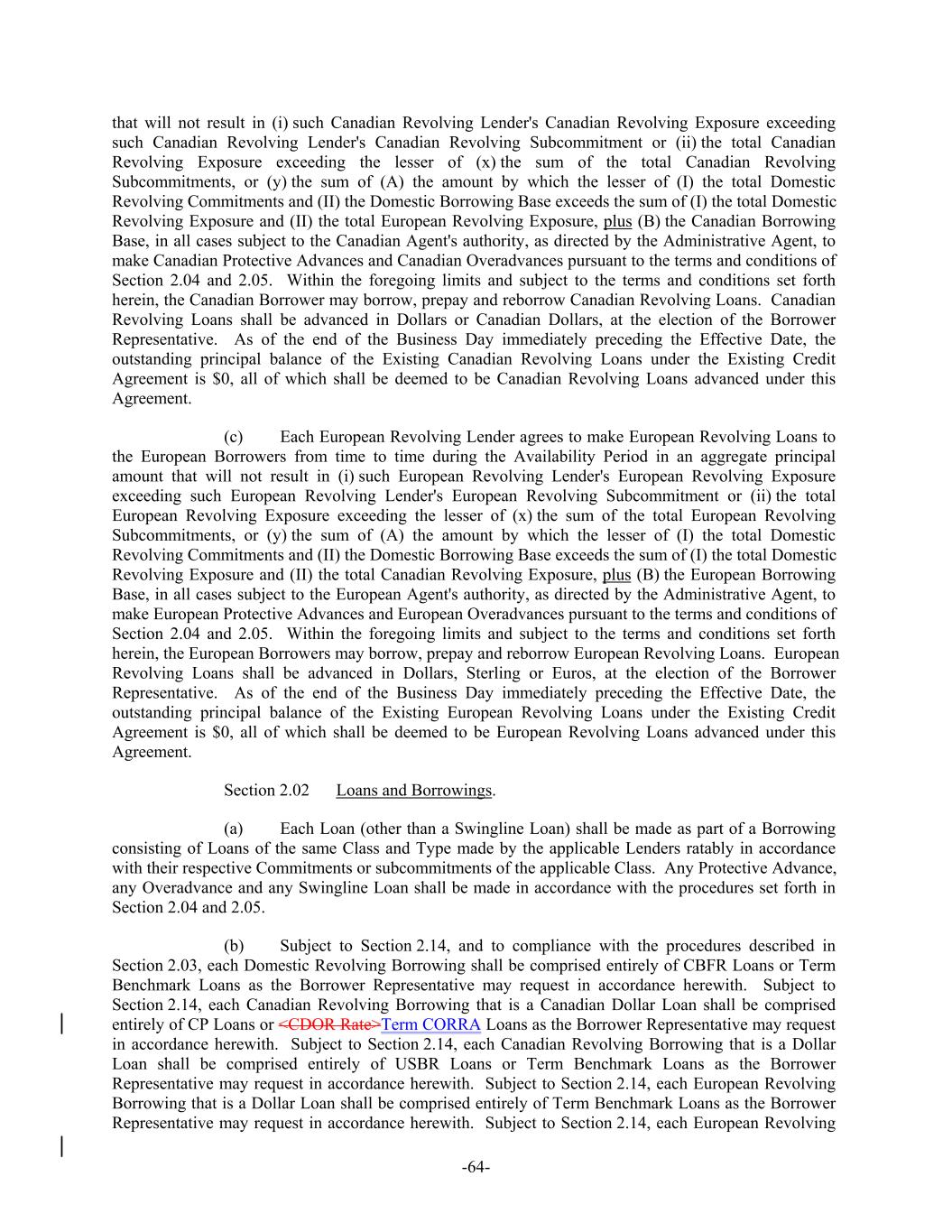 that will not result in (i) such Canadian Revolving Lender's Canadian Revolving Exposure exceeding such Canadian Revolving Lender's Canadian Revolving Subcommitment or (ii) the total Canadian Revolving Exposure exceeding the lesser of (x) the sum of the total Canadian Revolving Subcommitments, or (y) the sum of (A) the amount by which the lesser of (I) the total Domestic Revolving Commitments and (II) the Domestic Borrowing Base exceeds the sum of (I) the total Domestic Revolving Exposure and (II) the total European Revolving Exposure, plus (B) the Canadian Borrowing Base, in all cases subject to the Canadian Agent's authority, as directed by the Administrative Agent, to make Canadian Protective Advances and Canadian Overadvances pursuant to the terms and conditions of Section 2.04 and 2.05. Within the foregoing limits and subject to the terms and conditions set forth herein, the Canadian Borrower may borrow, prepay and reborrow Canadian Revolving Loans. Canadian Revolving Loans shall be advanced in Dollars or Canadian Dollars, at the election of the Borrower Representative. As of the end of the Business Day immediately preceding the Effective Date, the outstanding principal balance of the Existing Canadian Revolving Loans under the Existing Credit Agreement is $0, all of which shall be deemed to be Canadian Revolving Loans advanced under this Agreement. (c) Each European Revolving Lender agrees to make European Revolving Loans to the European Borrowers from time to time during the Availability Period in an aggregate principal amount that will not result in (i) such European Revolving Lender's European Revolving Exposure exceeding such European Revolving Lender's European Revolving Subcommitment or (ii) the total European Revolving Exposure exceeding the lesser of (x) the sum of the total European Revolving Subcommitments, or (y) the sum of (A) the amount by which the lesser of (I) the total Domestic Revolving Commitments and (II) the Domestic Borrowing Base exceeds the sum of (I) the total Domestic Revolving Exposure and (II) the total Canadian Revolving Exposure, plus (B) the European Borrowing Base, in all cases subject to the European Agent's authority, as directed by the Administrative Agent, to make European Protective Advances and European Overadvances pursuant to the terms and conditions of Section 2.04 and 2.05. Within the foregoing limits and subject to the terms and conditions set forth herein, the European Borrowers may borrow, prepay and reborrow European Revolving Loans. European Revolving Loans shall be advanced in Dollars, Sterling or Euros, at the election of the Borrower Representative. As of the end of the Business Day immediately preceding the Effective Date, the outstanding principal balance of the Existing European Revolving Loans under the Existing Credit Agreement is $0, all of which shall be deemed to be European Revolving Loans advanced under this Agreement. Section 2.02 Loans and Borrowings. (a) Each Loan (other than a Swingline Loan) shall be made as part of a Borrowing consisting of Loans of the same Class and Type made by the applicable Lenders ratably in accordance with their respective Commitments or subcommitments of the applicable Class. Any Protective Advance, any Overadvance and any Swingline Loan shall be made in accordance with the procedures set forth in Section 2.04 and 2.05. (b) Subject to Section 2.14, and to compliance with the procedures described in Section 2.03, each Domestic Revolving Borrowing shall be comprised entirely of CBFR Loans or Term Benchmark Loans as the Borrower Representative may request in accordance herewith. Subject to Section 2.14, each Canadian Revolving Borrowing that is a Canadian Dollar Loan shall be comprised entirely of CP Loans or <CDOR Rate>Term CORRA Loans as the Borrower Representative may request in accordance herewith. Subject to Section 2.14, each Canadian Revolving Borrowing that is a Dollar Loan shall be comprised entirely of USBR Loans or Term Benchmark Loans as the Borrower Representative may request in accordance herewith. Subject to Section 2.14, each European Revolving Borrowing that is a Dollar Loan shall be comprised entirely of Term Benchmark Loans as the Borrower Representative may request in accordance herewith. Subject to Section 2.14, each European Revolving -64-