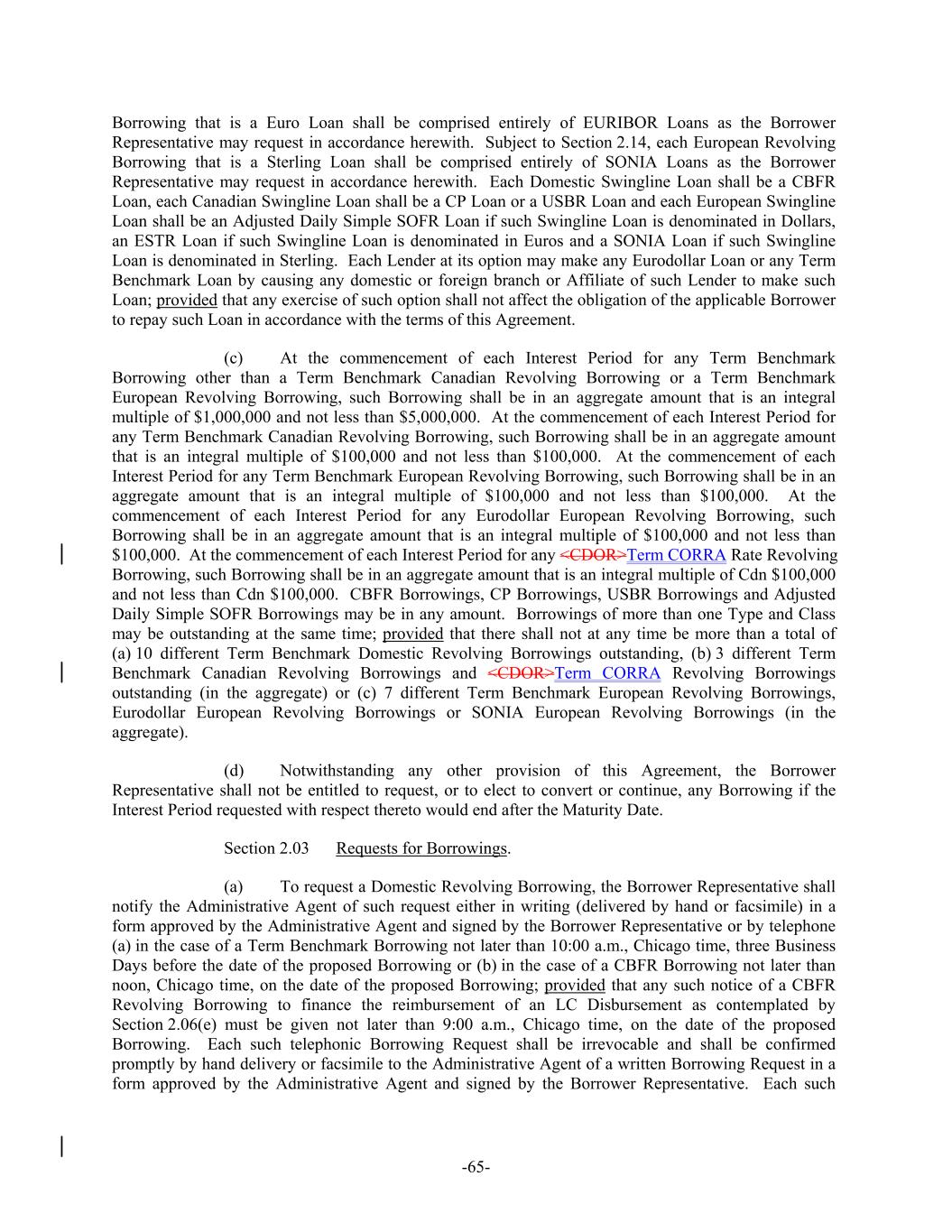Borrowing that is a Euro Loan shall be comprised entirely of EURIBOR Loans as the Borrower Representative may request in accordance herewith. Subject to Section 2.14, each European Revolving Borrowing that is a Sterling Loan shall be comprised entirely of SONIA Loans as the Borrower Representative may request in accordance herewith. Each Domestic Swingline Loan shall be a CBFR Loan, each Canadian Swingline Loan shall be a CP Loan or a USBR Loan and each European Swingline Loan shall be an Adjusted Daily Simple SOFR Loan if such Swingline Loan is denominated in Dollars, an ESTR Loan if such Swingline Loan is denominated in Euros and a SONIA Loan if such Swingline Loan is denominated in Sterling. Each Lender at its option may make any Eurodollar Loan or any Term Benchmark Loan by causing any domestic or foreign branch or Affiliate of such Lender to make such Loan; provided that any exercise of such option shall not affect the obligation of the applicable Borrower to repay such Loan in accordance with the terms of this Agreement. (c) At the commencement of each Interest Period for any Term Benchmark Borrowing other than a Term Benchmark Canadian Revolving Borrowing or a Term Benchmark European Revolving Borrowing, such Borrowing shall be in an aggregate amount that is an integral multiple of $1,000,000 and not less than $5,000,000. At the commencement of each Interest Period for any Term Benchmark Canadian Revolving Borrowing, such Borrowing shall be in an aggregate amount that is an integral multiple of $100,000 and not less than $100,000. At the commencement of each Interest Period for any Term Benchmark European Revolving Borrowing, such Borrowing shall be in an aggregate amount that is an integral multiple of $100,000 and not less than $100,000. At the commencement of each Interest Period for any Eurodollar European Revolving Borrowing, such Borrowing shall be in an aggregate amount that is an integral multiple of $100,000 and not less than $100,000. At the commencement of each Interest Period for any <CDOR>Term CORRA Rate Revolving Borrowing, such Borrowing shall be in an aggregate amount that is an integral multiple of Cdn $100,000 and not less than Cdn $100,000. CBFR Borrowings, CP Borrowings, USBR Borrowings and Adjusted Daily Simple SOFR Borrowings may be in any amount. Borrowings of more than one Type and Class may be outstanding at the same time; provided that there shall not at any time be more than a total of (a) 10 different Term Benchmark Domestic Revolving Borrowings outstanding, (b) 3 different Term Benchmark Canadian Revolving Borrowings and <CDOR>Term CORRA Revolving Borrowings outstanding (in the aggregate) or (c) 7 different Term Benchmark European Revolving Borrowings, Eurodollar European Revolving Borrowings or SONIA European Revolving Borrowings (in the aggregate). (d) Notwithstanding any other provision of this Agreement, the Borrower Representative shall not be entitled to request, or to elect to convert or continue, any Borrowing if the Interest Period requested with respect thereto would end after the Maturity Date. Section 2.03 Requests for Borrowings. (a) To request a Domestic Revolving Borrowing, the Borrower Representative shall notify the Administrative Agent of such request either in writing (delivered by hand or facsimile) in a form approved by the Administrative Agent and signed by the Borrower Representative or by telephone (a) in the case of a Term Benchmark Borrowing not later than 10:00 a.m., Chicago time, three Business Days before the date of the proposed Borrowing or (b) in the case of a CBFR Borrowing not later than noon, Chicago time, on the date of the proposed Borrowing; provided that any such notice of a CBFR Revolving Borrowing to finance the reimbursement of an LC Disbursement as contemplated by Section 2.06(e) must be given not later than 9:00 a.m., Chicago time, on the date of the proposed Borrowing. Each such telephonic Borrowing Request shall be irrevocable and shall be confirmed promptly by hand delivery or facsimile to the Administrative Agent of a written Borrowing Request in a form approved by the Administrative Agent and signed by the Borrower Representative. Each such -65-
