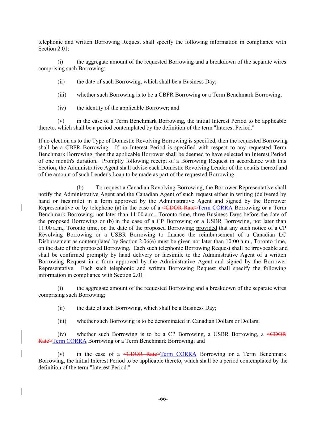 telephonic and written Borrowing Request shall specify the following information in compliance with Section 2.01: (i) the aggregate amount of the requested Borrowing and a breakdown of the separate wires comprising such Borrowing; (ii) the date of such Borrowing, which shall be a Business Day; (iii) whether such Borrowing is to be a CBFR Borrowing or a Term Benchmark Borrowing; (iv) the identity of the applicable Borrower; and (v) in the case of a Term Benchmark Borrowing, the initial Interest Period to be applicable thereto, which shall be a period contemplated by the definition of the term "Interest Period." If no election as to the Type of Domestic Revolving Borrowing is specified, then the requested Borrowing shall be a CBFR Borrowing. If no Interest Period is specified with respect to any requested Term Benchmark Borrowing, then the applicable Borrower shall be deemed to have selected an Interest Period of one month's duration. Promptly following receipt of a Borrowing Request in accordance with this Section, the Administrative Agent shall advise each Domestic Revolving Lender of the details thereof and of the amount of such Lender's Loan to be made as part of the requested Borrowing. (b) To request a Canadian Revolving Borrowing, the Borrower Representative shall notify the Administrative Agent and the Canadian Agent of such request either in writing (delivered by hand or facsimile) in a form approved by the Administrative Agent and signed by the Borrower Representative or by telephone (a) in the case of a <CDOR Rate>Term CORRA Borrowing or a Term Benchmark Borrowing, not later than 11:00 a.m., Toronto time, three Business Days before the date of the proposed Borrowing or (b) in the case of a CP Borrowing or a USBR Borrowing, not later than 11:00 a.m., Toronto time, on the date of the proposed Borrowing; provided that any such notice of a CP Revolving Borrowing or a USBR Borrowing to finance the reimbursement of a Canadian LC Disbursement as contemplated by Section 2.06(e) must be given not later than 10:00 a.m., Toronto time, on the date of the proposed Borrowing. Each such telephonic Borrowing Request shall be irrevocable and shall be confirmed promptly by hand delivery or facsimile to the Administrative Agent of a written Borrowing Request in a form approved by the Administrative Agent and signed by the Borrower Representative. Each such telephonic and written Borrowing Request shall specify the following information in compliance with Section 2.01: (i) the aggregate amount of the requested Borrowing and a breakdown of the separate wires comprising such Borrowing; (ii) the date of such Borrowing, which shall be a Business Day; (iii) whether such Borrowing is to be denominated in Canadian Dollars or Dollars; (iv) whether such Borrowing is to be a CP Borrowing, a USBR Borrowing, a <CDOR Rate>Term CORRA Borrowing or a Term Benchmark Borrowing; and (v) in the case of a <CDOR Rate>Term CORRA Borrowing or a Term Benchmark Borrowing, the initial Interest Period to be applicable thereto, which shall be a period contemplated by the definition of the term "Interest Period." -66-