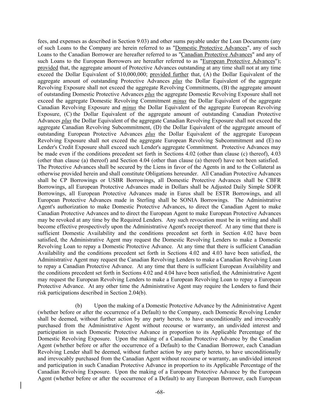 fees, and expenses as described in Section 9.03) and other sums payable under the Loan Documents (any of such Loans to the Company are herein referred to as "Domestic Protective Advances", any of such Loans to the Canadian Borrower are hereafter referred to as "Canadian Protective Advances" and any of such Loans to the European Borrowers are hereafter referred to as "European Protective Advances"); provided that, the aggregate amount of Protective Advances outstanding at any time shall not at any time exceed the Dollar Equivalent of $10,000,000; provided further that, (A) the Dollar Equivalent of the aggregate amount of outstanding Protective Advances plus the Dollar Equivalent of the aggregate Revolving Exposure shall not exceed the aggregate Revolving Commitments, (B) the aggregate amount of outstanding Domestic Protective Advances plus the aggregate Domestic Revolving Exposure shall not exceed the aggregate Domestic Revolving Commitment minus the Dollar Equivalent of the aggregate Canadian Revolving Exposure and minus the Dollar Equivalent of the aggregate European Revolving Exposure, (C) the Dollar Equivalent of the aggregate amount of outstanding Canadian Protective Advances plus the Dollar Equivalent of the aggregate Canadian Revolving Exposure shall not exceed the aggregate Canadian Revolving Subcommitment, (D) the Dollar Equivalent of the aggregate amount of outstanding European Protective Advances plus the Dollar Equivalent of the aggregate European Revolving Exposure shall not exceed the aggregate European Revolving Subcommitment and (E) no Lender's Credit Exposure shall exceed such Lender's aggregate Commitment. Protective Advances may be made even if the conditions precedent set forth in Sections 4.02 (other than clause (c) thereof), 4.03 (other than clause (a) thereof) and Section 4.04 (other than clause (a) thereof) have not been satisfied. The Protective Advances shall be secured by the Liens in favor of the Agents in and to the Collateral as otherwise provided herein and shall constitute Obligations hereunder. All Canadian Protective Advances shall be CP Borrowings or USBR Borrowings, all Domestic Protective Advances shall be CBFR Borrowings, all European Protective Advances made in Dollars shall be Adjusted Daily Simple SOFR Borrowings, all European Protective Advances made in Euros shall be ESTR Borrowings, and all European Protective Advances made in Sterling shall be SONIA Borrowings. The Administrative Agent's authorization to make Domestic Protective Advances, to direct the Canadian Agent to make Canadian Protective Advances and to direct the European Agent to make European Protective Advances may be revoked at any time by the Required Lenders. Any such revocation must be in writing and shall become effective prospectively upon the Administrative Agent's receipt thereof. At any time that there is sufficient Domestic Availability and the conditions precedent set forth in Section 4.02 have been satisfied, the Administrative Agent may request the Domestic Revolving Lenders to make a Domestic Revolving Loan to repay a Domestic Protective Advance. At any time that there is sufficient Canadian Availability and the conditions precedent set forth in Sections 4.02 and 4.03 have been satisfied, the Administrative Agent may request the Canadian Revolving Lenders to make a Canadian Revolving Loan to repay a Canadian Protective Advance. At any time that there is sufficient European Availability and the conditions precedent set forth in Sections 4.02 and 4.04 have been satisfied, the Administrative Agent may request the European Revolving Lenders to make a European Revolving Loan to repay a European Protective Advance. At any other time the Administrative Agent may require the Lenders to fund their risk participations described in Section 2.04(b). (b) Upon the making of a Domestic Protective Advance by the Administrative Agent (whether before or after the occurrence of a Default) to the Company, each Domestic Revolving Lender shall be deemed, without further action by any party hereto, to have unconditionally and irrevocably purchased from the Administrative Agent without recourse or warranty, an undivided interest and participation in such Domestic Protective Advance in proportion to its Applicable Percentage of the Domestic Revolving Exposure. Upon the making of a Canadian Protective Advance by the Canadian Agent (whether before or after the occurrence of a Default) to the Canadian Borrower, each Canadian Revolving Lender shall be deemed, without further action by any party hereto, to have unconditionally and irrevocably purchased from the Canadian Agent without recourse or warranty, an undivided interest and participation in such Canadian Protective Advance in proportion to its Applicable Percentage of the Canadian Revolving Exposure. Upon the making of a European Protective Advance by the European Agent (whether before or after the occurrence of a Default) to any European Borrower, each European -68-