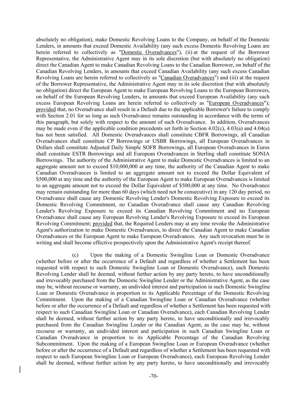 absolutely no obligation), make Domestic Revolving Loans to the Company, on behalf of the Domestic Lenders, in amounts that exceed Domestic Availability (any such excess Domestic Revolving Loans are herein referred to collectively as "Domestic Overadvances"), (ii) at the request of the Borrower Representative, the Administrative Agent may in its sole discretion (but with absolutely no obligation) direct the Canadian Agent to make Canadian Revolving Loans to the Canadian Borrower, on behalf of the Canadian Revolving Lenders, in amounts that exceed Canadian Availability (any such excess Canadian Revolving Loans are herein referred to collectively as "Canadian Overadvances") and (iii) at the request of the Borrower Representative, the Administrative Agent may in its sole discretion (but with absolutely no obligation) direct the European Agent to make European Revolving Loans to the European Borrowers, on behalf of the European Revolving Lenders, in amounts that exceed European Availability (any such excess European Revolving Loans are herein referred to collectively as "European Overadvances"); provided that, no Overadvance shall result in a Default due to the applicable Borrower's failure to comply with Section 2.01 for so long as such Overadvance remains outstanding in accordance with the terms of this paragraph, but solely with respect to the amount of such Overadvance. In addition, Overadvances may be made even if the applicable condition precedents set forth in Section 4.02(c), 4.03(a) and 4.04(a) has not been satisfied. All Domestic Overadvances shall constitute CBFR Borrowings, all Canadian Overadvances shall constitute CP Borrowings or USBR Borrowings, all European Overadvances in Dollars shall constitute Adjusted Daily Simple SOFR Borrowings, all European Overadvances in Euros shall constitute ESTR Borrowings and all European Overadvances in Sterling shall constitute SONIA Borrowings. The authority of the Administrative Agent to make Domestic Overadvances is limited to an aggregate amount not to exceed $10,000,000 at any time, the authority of the Canadian Agent to make Canadian Overadvances is limited to an aggregate amount not to exceed the Dollar Equivalent of $500,000 at any time and the authority of the European Agent to make European Overadvances is limited to an aggregate amount not to exceed the Dollar Equivalent of $500,000 at any time. No Overadvance may remain outstanding for more than 60 days (which need not be consecutive) in any 120 day period, no Overadvance shall cause any Domestic Revolving Lender's Domestic Revolving Exposure to exceed its Domestic Revolving Commitment, no Canadian Overadvance shall cause any Canadian Revolving Lender's Revolving Exposure to exceed its Canadian Revolving Commitment and no European Overadvance shall cause any European Revolving Lender's Revolving Exposure to exceed its European Revolving Commitment; provided that, the Required Lenders may at any time revoke the Administrative Agent's authorization to make Domestic Overadvances, to direct the Canadian Agent to make Canadian Overadvances or the European Agent to make European Overadvances. Any such revocation must be in writing and shall become effective prospectively upon the Administrative Agent's receipt thereof. (c) Upon the making of a Domestic Swingline Loan or Domestic Overadvance (whether before or after the occurrence of a Default and regardless of whether a Settlement has been requested with respect to such Domestic Swingline Loan or Domestic Overadvance), each Domestic Revolving Lender shall be deemed, without further action by any party hereto, to have unconditionally and irrevocably purchased from the Domestic Swingline Lender or the Administrative Agent, as the case may be, without recourse or warranty, an undivided interest and participation in such Domestic Swingline Loan or Domestic Overadvance in proportion to its Applicable Percentage of the Domestic Revolving Commitment. Upon the making of a Canadian Swingline Loan or Canadian Overadvance (whether before or after the occurrence of a Default and regardless of whether a Settlement has been requested with respect to such Canadian Swingline Loan or Canadian Overadvance), each Canadian Revolving Lender shall be deemed, without further action by any party hereto, to have unconditionally and irrevocably purchased from the Canadian Swingline Lender or the Canadian Agent, as the case may be, without recourse or warranty, an undivided interest and participation in such Canadian Swingline Loan or Canadian Overadvance in proportion to its Applicable Percentage of the Canadian Revolving Subcommitment. Upon the making of a European Swingline Loan or European Overadvance (whether before or after the occurrence of a Default and regardless of whether a Settlement has been requested with respect to such European Swingline Loan or European Overadvance), each European Revolving Lender shall be deemed, without further action by any party hereto, to have unconditionally and irrevocably -70-