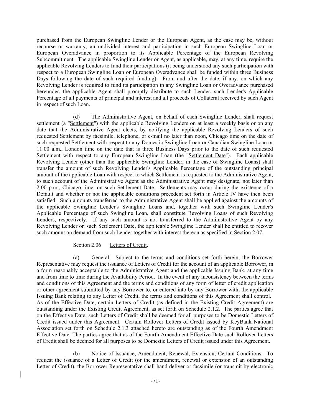 purchased from the European Swingline Lender or the European Agent, as the case may be, without recourse or warranty, an undivided interest and participation in such European Swingline Loan or European Overadvance in proportion to its Applicable Percentage of the European Revolving Subcommitment. The applicable Swingline Lender or Agent, as applicable, may, at any time, require the applicable Revolving Lenders to fund their participations (it being understood any such participation with respect to a European Swingline Loan or European Overadvance shall be funded within three Business Days following the date of such required funding). From and after the date, if any, on which any Revolving Lender is required to fund its participation in any Swingline Loan or Overadvance purchased hereunder, the applicable Agent shall promptly distribute to such Lender, such Lender's Applicable Percentage of all payments of principal and interest and all proceeds of Collateral received by such Agent in respect of such Loan. (d) The Administrative Agent, on behalf of each Swingline Lender, shall request settlement (a "Settlement") with the applicable Revolving Lenders on at least a weekly basis or on any date that the Administrative Agent elects, by notifying the applicable Revolving Lenders of such requested Settlement by facsimile, telephone, or e-mail no later than noon, Chicago time on the date of such requested Settlement with respect to any Domestic Swingline Loan or Canadian Swingline Loan or 11:00 a.m., London time on the date that is three Business Days prior to the date of such requested Settlement with respect to any European Swingline Loan (the "Settlement Date"). Each applicable Revolving Lender (other than the applicable Swingline Lender, in the case of Swingline Loans) shall transfer the amount of such Revolving Lender's Applicable Percentage of the outstanding principal amount of the applicable Loan with respect to which Settlement is requested to the Administrative Agent, to such account of the Administrative Agent as the Administrative Agent may designate, not later than 2:00 p.m., Chicago time, on such Settlement Date. Settlements may occur during the existence of a Default and whether or not the applicable conditions precedent set forth in Article IV have then been satisfied. Such amounts transferred to the Administrative Agent shall be applied against the amounts of the applicable Swingline Lender's Swingline Loans and, together with such Swingline Lender's Applicable Percentage of such Swingline Loan, shall constitute Revolving Loans of such Revolving Lenders, respectively. If any such amount is not transferred to the Administrative Agent by any Revolving Lender on such Settlement Date, the applicable Swingline Lender shall be entitled to recover such amount on demand from such Lender together with interest thereon as specified in Section 2.07. Section 2.06 Letters of Credit. (a) General. Subject to the terms and conditions set forth herein, the Borrower Representative may request the issuance of Letters of Credit for the account of an applicable Borrower, in a form reasonably acceptable to the Administrative Agent and the applicable Issuing Bank, at any time and from time to time during the Availability Period. In the event of any inconsistency between the terms and conditions of this Agreement and the terms and conditions of any form of letter of credit application or other agreement submitted by any Borrower to, or entered into by any Borrower with, the applicable Issuing Bank relating to any Letter of Credit, the terms and conditions of this Agreement shall control. As of the Effective Date, certain Letters of Credit (as defined in the Existing Credit Agreement) are outstanding under the Existing Credit Agreement, as set forth on Schedule 2.1.2. The parties agree that on the Effective Date, such Letters of Credit shall be deemed for all purposes to be Domestic Letters of Credit issued under this Agreement. Certain Rollover Letters of Credit issued by KeyBank National Association set forth on Schedule 2.1.3 attached hereto are outstanding as of the Fourth Amendment Effective Date. The parties agree that as of the Fourth Amendment Effective Date such Rollover Letters of Credit shall be deemed for all purposes to be Domestic Letters of Credit issued under this Agreement. (b) Notice of Issuance, Amendment, Renewal, Extension; Certain Conditions. To request the issuance of a Letter of Credit (or the amendment, renewal or extension of an outstanding Letter of Credit), the Borrower Representative shall hand deliver or facsimile (or transmit by electronic -71-