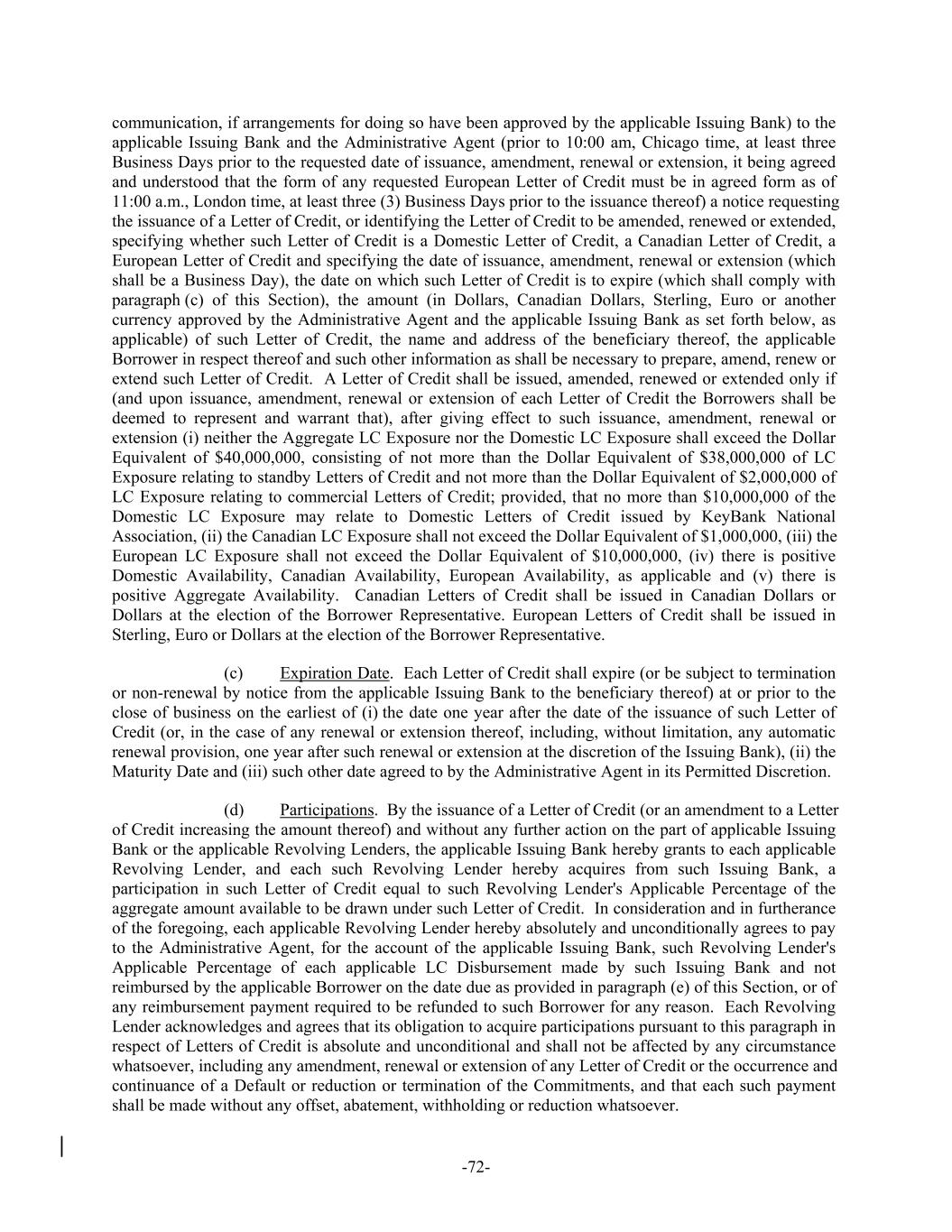 communication, if arrangements for doing so have been approved by the applicable Issuing Bank) to the applicable Issuing Bank and the Administrative Agent (prior to 10:00 am, Chicago time, at least three Business Days prior to the requested date of issuance, amendment, renewal or extension, it being agreed and understood that the form of any requested European Letter of Credit must be in agreed form as of 11:00 a.m., London time, at least three (3) Business Days prior to the issuance thereof) a notice requesting the issuance of a Letter of Credit, or identifying the Letter of Credit to be amended, renewed or extended, specifying whether such Letter of Credit is a Domestic Letter of Credit, a Canadian Letter of Credit, a European Letter of Credit and specifying the date of issuance, amendment, renewal or extension (which shall be a Business Day), the date on which such Letter of Credit is to expire (which shall comply with paragraph (c) of this Section), the amount (in Dollars, Canadian Dollars, Sterling, Euro or another currency approved by the Administrative Agent and the applicable Issuing Bank as set forth below, as applicable) of such Letter of Credit, the name and address of the beneficiary thereof, the applicable Borrower in respect thereof and such other information as shall be necessary to prepare, amend, renew or extend such Letter of Credit. A Letter of Credit shall be issued, amended, renewed or extended only if (and upon issuance, amendment, renewal or extension of each Letter of Credit the Borrowers shall be deemed to represent and warrant that), after giving effect to such issuance, amendment, renewal or extension (i) neither the Aggregate LC Exposure nor the Domestic LC Exposure shall exceed the Dollar Equivalent of $40,000,000, consisting of not more than the Dollar Equivalent of $38,000,000 of LC Exposure relating to standby Letters of Credit and not more than the Dollar Equivalent of $2,000,000 of LC Exposure relating to commercial Letters of Credit; provided, that no more than $10,000,000 of the Domestic LC Exposure may relate to Domestic Letters of Credit issued by KeyBank National Association, (ii) the Canadian LC Exposure shall not exceed the Dollar Equivalent of $1,000,000, (iii) the European LC Exposure shall not exceed the Dollar Equivalent of $10,000,000, (iv) there is positive Domestic Availability, Canadian Availability, European Availability, as applicable and (v) there is positive Aggregate Availability. Canadian Letters of Credit shall be issued in Canadian Dollars or Dollars at the election of the Borrower Representative. European Letters of Credit shall be issued in Sterling, Euro or Dollars at the election of the Borrower Representative. (c) Expiration Date. Each Letter of Credit shall expire (or be subject to termination or non-renewal by notice from the applicable Issuing Bank to the beneficiary thereof) at or prior to the close of business on the earliest of (i) the date one year after the date of the issuance of such Letter of Credit (or, in the case of any renewal or extension thereof, including, without limitation, any automatic renewal provision, one year after such renewal or extension at the discretion of the Issuing Bank), (ii) the Maturity Date and (iii) such other date agreed to by the Administrative Agent in its Permitted Discretion. (d) Participations. By the issuance of a Letter of Credit (or an amendment to a Letter of Credit increasing the amount thereof) and without any further action on the part of applicable Issuing Bank or the applicable Revolving Lenders, the applicable Issuing Bank hereby grants to each applicable Revolving Lender, and each such Revolving Lender hereby acquires from such Issuing Bank, a participation in such Letter of Credit equal to such Revolving Lender's Applicable Percentage of the aggregate amount available to be drawn under such Letter of Credit. In consideration and in furtherance of the foregoing, each applicable Revolving Lender hereby absolutely and unconditionally agrees to pay to the Administrative Agent, for the account of the applicable Issuing Bank, such Revolving Lender's Applicable Percentage of each applicable LC Disbursement made by such Issuing Bank and not reimbursed by the applicable Borrower on the date due as provided in paragraph (e) of this Section, or of any reimbursement payment required to be refunded to such Borrower for any reason. Each Revolving Lender acknowledges and agrees that its obligation to acquire participations pursuant to this paragraph in respect of Letters of Credit is absolute and unconditional and shall not be affected by any circumstance whatsoever, including any amendment, renewal or extension of any Letter of Credit or the occurrence and continuance of a Default or reduction or termination of the Commitments, and that each such payment shall be made without any offset, abatement, withholding or reduction whatsoever. -72-