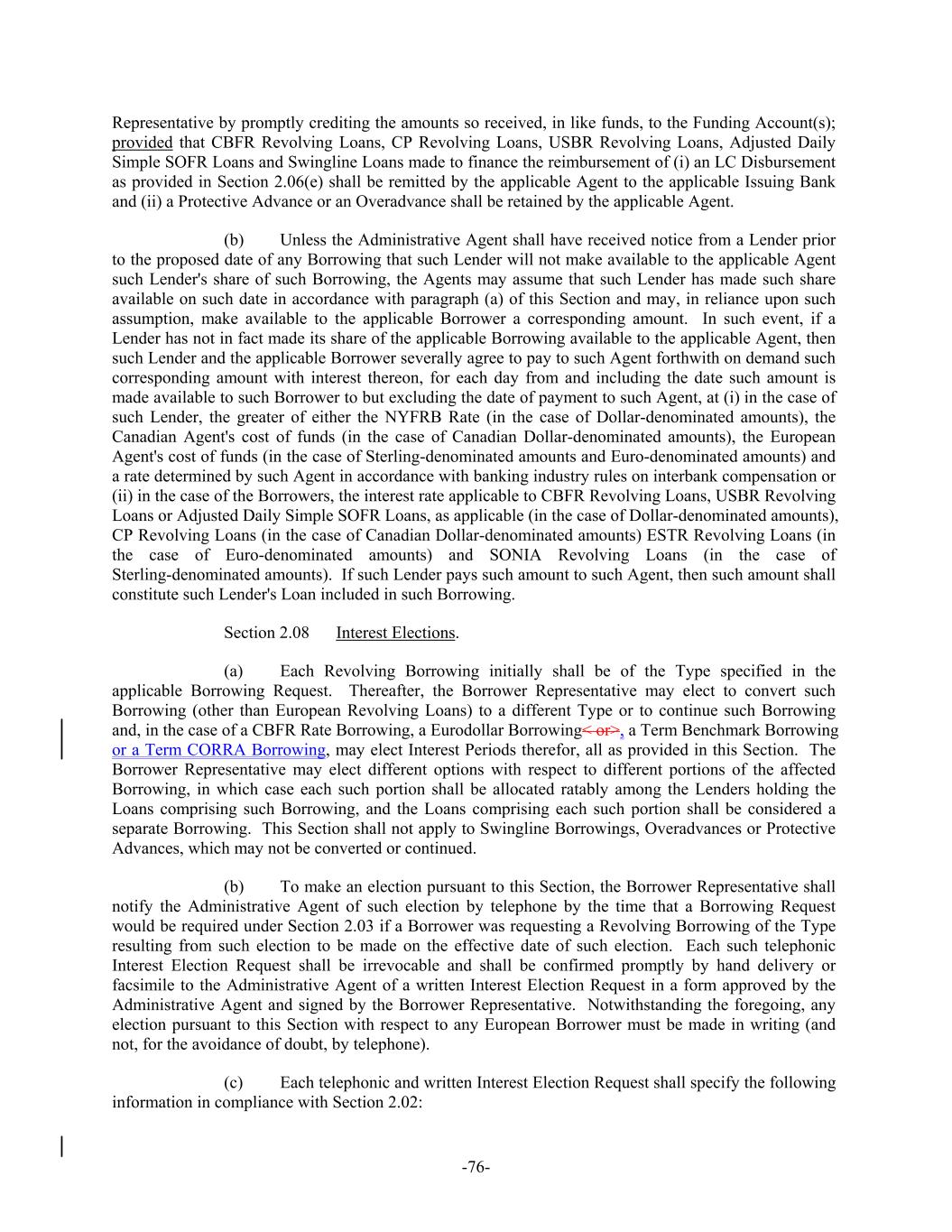 Representative by promptly crediting the amounts so received, in like funds, to the Funding Account(s); provided that CBFR Revolving Loans, CP Revolving Loans, USBR Revolving Loans, Adjusted Daily Simple SOFR Loans and Swingline Loans made to finance the reimbursement of (i) an LC Disbursement as provided in Section 2.06(e) shall be remitted by the applicable Agent to the applicable Issuing Bank and (ii) a Protective Advance or an Overadvance shall be retained by the applicable Agent. (b) Unless the Administrative Agent shall have received notice from a Lender prior to the proposed date of any Borrowing that such Lender will not make available to the applicable Agent such Lender's share of such Borrowing, the Agents may assume that such Lender has made such share available on such date in accordance with paragraph (a) of this Section and may, in reliance upon such assumption, make available to the applicable Borrower a corresponding amount. In such event, if a Lender has not in fact made its share of the applicable Borrowing available to the applicable Agent, then such Lender and the applicable Borrower severally agree to pay to such Agent forthwith on demand such corresponding amount with interest thereon, for each day from and including the date such amount is made available to such Borrower to but excluding the date of payment to such Agent, at (i) in the case of such Lender, the greater of either the NYFRB Rate (in the case of Dollar-denominated amounts), the Canadian Agent's cost of funds (in the case of Canadian Dollar-denominated amounts), the European Agent's cost of funds (in the case of Sterling-denominated amounts and Euro-denominated amounts) and a rate determined by such Agent in accordance with banking industry rules on interbank compensation or (ii) in the case of the Borrowers, the interest rate applicable to CBFR Revolving Loans, USBR Revolving Loans or Adjusted Daily Simple SOFR Loans, as applicable (in the case of Dollar-denominated amounts), CP Revolving Loans (in the case of Canadian Dollar-denominated amounts) ESTR Revolving Loans (in the case of Euro-denominated amounts) and SONIA Revolving Loans (in the case of Sterling-denominated amounts). If such Lender pays such amount to such Agent, then such amount shall constitute such Lender's Loan included in such Borrowing. Section 2.08 Interest Elections. (a) Each Revolving Borrowing initially shall be of the Type specified in the applicable Borrowing Request. Thereafter, the Borrower Representative may elect to convert such Borrowing (other than European Revolving Loans) to a different Type or to continue such Borrowing and, in the case of a CBFR Rate Borrowing, a Eurodollar Borrowing< or>, a Term Benchmark Borrowing or a Term CORRA Borrowing, may elect Interest Periods therefor, all as provided in this Section. The Borrower Representative may elect different options with respect to different portions of the affected Borrowing, in which case each such portion shall be allocated ratably among the Lenders holding the Loans comprising such Borrowing, and the Loans comprising each such portion shall be considered a separate Borrowing. This Section shall not apply to Swingline Borrowings, Overadvances or Protective Advances, which may not be converted or continued. (b) To make an election pursuant to this Section, the Borrower Representative shall notify the Administrative Agent of such election by telephone by the time that a Borrowing Request would be required under Section 2.03 if a Borrower was requesting a Revolving Borrowing of the Type resulting from such election to be made on the effective date of such election. Each such telephonic Interest Election Request shall be irrevocable and shall be confirmed promptly by hand delivery or facsimile to the Administrative Agent of a written Interest Election Request in a form approved by the Administrative Agent and signed by the Borrower Representative. Notwithstanding the foregoing, any election pursuant to this Section with respect to any European Borrower must be made in writing (and not, for the avoidance of doubt, by telephone). (c) Each telephonic and written Interest Election Request shall specify the following information in compliance with Section 2.02: -76-