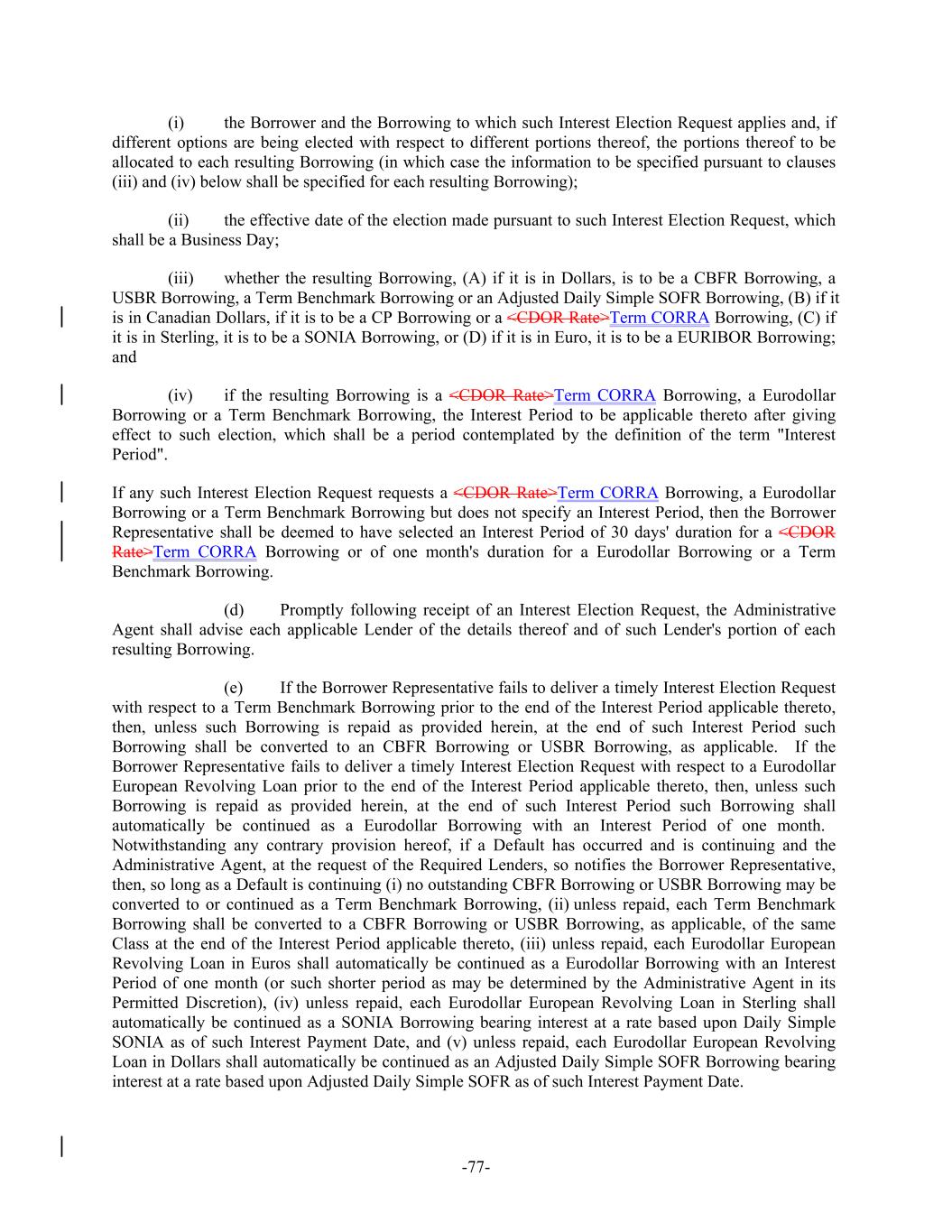 (i) the Borrower and the Borrowing to which such Interest Election Request applies and, if different options are being elected with respect to different portions thereof, the portions thereof to be allocated to each resulting Borrowing (in which case the information to be specified pursuant to clauses (iii) and (iv) below shall be specified for each resulting Borrowing); (ii) the effective date of the election made pursuant to such Interest Election Request, which shall be a Business Day; (iii) whether the resulting Borrowing, (A) if it is in Dollars, is to be a CBFR Borrowing, a USBR Borrowing, a Term Benchmark Borrowing or an Adjusted Daily Simple SOFR Borrowing, (B) if it is in Canadian Dollars, if it is to be a CP Borrowing or a <CDOR Rate>Term CORRA Borrowing, (C) if it is in Sterling, it is to be a SONIA Borrowing, or (D) if it is in Euro, it is to be a EURIBOR Borrowing; and (iv) if the resulting Borrowing is a <CDOR Rate>Term CORRA Borrowing, a Eurodollar Borrowing or a Term Benchmark Borrowing, the Interest Period to be applicable thereto after giving effect to such election, which shall be a period contemplated by the definition of the term "Interest Period". If any such Interest Election Request requests a <CDOR Rate>Term CORRA Borrowing, a Eurodollar Borrowing or a Term Benchmark Borrowing but does not specify an Interest Period, then the Borrower Representative shall be deemed to have selected an Interest Period of 30 days' duration for a <CDOR Rate>Term CORRA Borrowing or of one month's duration for a Eurodollar Borrowing or a Term Benchmark Borrowing. (d) Promptly following receipt of an Interest Election Request, the Administrative Agent shall advise each applicable Lender of the details thereof and of such Lender's portion of each resulting Borrowing. (e) If the Borrower Representative fails to deliver a timely Interest Election Request with respect to a Term Benchmark Borrowing prior to the end of the Interest Period applicable thereto, then, unless such Borrowing is repaid as provided herein, at the end of such Interest Period such Borrowing shall be converted to an CBFR Borrowing or USBR Borrowing, as applicable. If the Borrower Representative fails to deliver a timely Interest Election Request with respect to a Eurodollar European Revolving Loan prior to the end of the Interest Period applicable thereto, then, unless such Borrowing is repaid as provided herein, at the end of such Interest Period such Borrowing shall automatically be continued as a Eurodollar Borrowing with an Interest Period of one month. Notwithstanding any contrary provision hereof, if a Default has occurred and is continuing and the Administrative Agent, at the request of the Required Lenders, so notifies the Borrower Representative, then, so long as a Default is continuing (i) no outstanding CBFR Borrowing or USBR Borrowing may be converted to or continued as a Term Benchmark Borrowing, (ii) unless repaid, each Term Benchmark Borrowing shall be converted to a CBFR Borrowing or USBR Borrowing, as applicable, of the same Class at the end of the Interest Period applicable thereto, (iii) unless repaid, each Eurodollar European Revolving Loan in Euros shall automatically be continued as a Eurodollar Borrowing with an Interest Period of one month (or such shorter period as may be determined by the Administrative Agent in its Permitted Discretion), (iv) unless repaid, each Eurodollar European Revolving Loan in Sterling shall automatically be continued as a SONIA Borrowing bearing interest at a rate based upon Daily Simple SONIA as of such Interest Payment Date, and (v) unless repaid, each Eurodollar European Revolving Loan in Dollars shall automatically be continued as an Adjusted Daily Simple SOFR Borrowing bearing interest at a rate based upon Adjusted Daily Simple SOFR as of such Interest Payment Date. -77-