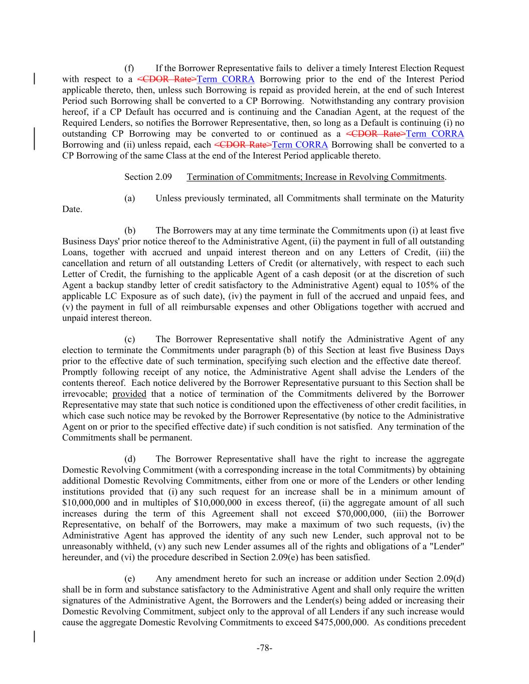 (f) If the Borrower Representative fails to deliver a timely Interest Election Request with respect to a <CDOR Rate>Term CORRA Borrowing prior to the end of the Interest Period applicable thereto, then, unless such Borrowing is repaid as provided herein, at the end of such Interest Period such Borrowing shall be converted to a CP Borrowing. Notwithstanding any contrary provision hereof, if a CP Default has occurred and is continuing and the Canadian Agent, at the request of the Required Lenders, so notifies the Borrower Representative, then, so long as a Default is continuing (i) no outstanding CP Borrowing may be converted to or continued as a <CDOR Rate>Term CORRA Borrowing and (ii) unless repaid, each <CDOR Rate>Term CORRA Borrowing shall be converted to a CP Borrowing of the same Class at the end of the Interest Period applicable thereto. Section 2.09 Termination of Commitments; Increase in Revolving Commitments. (a) Unless previously terminated, all Commitments shall terminate on the Maturity Date. (b) The Borrowers may at any time terminate the Commitments upon (i) at least five Business Days' prior notice thereof to the Administrative Agent, (ii) the payment in full of all outstanding Loans, together with accrued and unpaid interest thereon and on any Letters of Credit, (iii) the cancellation and return of all outstanding Letters of Credit (or alternatively, with respect to each such Letter of Credit, the furnishing to the applicable Agent of a cash deposit (or at the discretion of such Agent a backup standby letter of credit satisfactory to the Administrative Agent) equal to 105% of the applicable LC Exposure as of such date), (iv) the payment in full of the accrued and unpaid fees, and (v) the payment in full of all reimbursable expenses and other Obligations together with accrued and unpaid interest thereon. (c) The Borrower Representative shall notify the Administrative Agent of any election to terminate the Commitments under paragraph (b) of this Section at least five Business Days prior to the effective date of such termination, specifying such election and the effective date thereof. Promptly following receipt of any notice, the Administrative Agent shall advise the Lenders of the contents thereof. Each notice delivered by the Borrower Representative pursuant to this Section shall be irrevocable; provided that a notice of termination of the Commitments delivered by the Borrower Representative may state that such notice is conditioned upon the effectiveness of other credit facilities, in which case such notice may be revoked by the Borrower Representative (by notice to the Administrative Agent on or prior to the specified effective date) if such condition is not satisfied. Any termination of the Commitments shall be permanent. (d) The Borrower Representative shall have the right to increase the aggregate Domestic Revolving Commitment (with a corresponding increase in the total Commitments) by obtaining additional Domestic Revolving Commitments, either from one or more of the Lenders or other lending institutions provided that (i) any such request for an increase shall be in a minimum amount of $10,000,000 and in multiples of $10,000,000 in excess thereof, (ii) the aggregate amount of all such increases during the term of this Agreement shall not exceed $70,000,000, (iii) the Borrower Representative, on behalf of the Borrowers, may make a maximum of two such requests, (iv) the Administrative Agent has approved the identity of any such new Lender, such approval not to be unreasonably withheld, (v) any such new Lender assumes all of the rights and obligations of a "Lender" hereunder, and (vi) the procedure described in Section 2.09(e) has been satisfied. (e) Any amendment hereto for such an increase or addition under Section 2.09(d) shall be in form and substance satisfactory to the Administrative Agent and shall only require the written signatures of the Administrative Agent, the Borrowers and the Lender(s) being added or increasing their Domestic Revolving Commitment, subject only to the approval of all Lenders if any such increase would cause the aggregate Domestic Revolving Commitments to exceed $475,000,000. As conditions precedent -78-