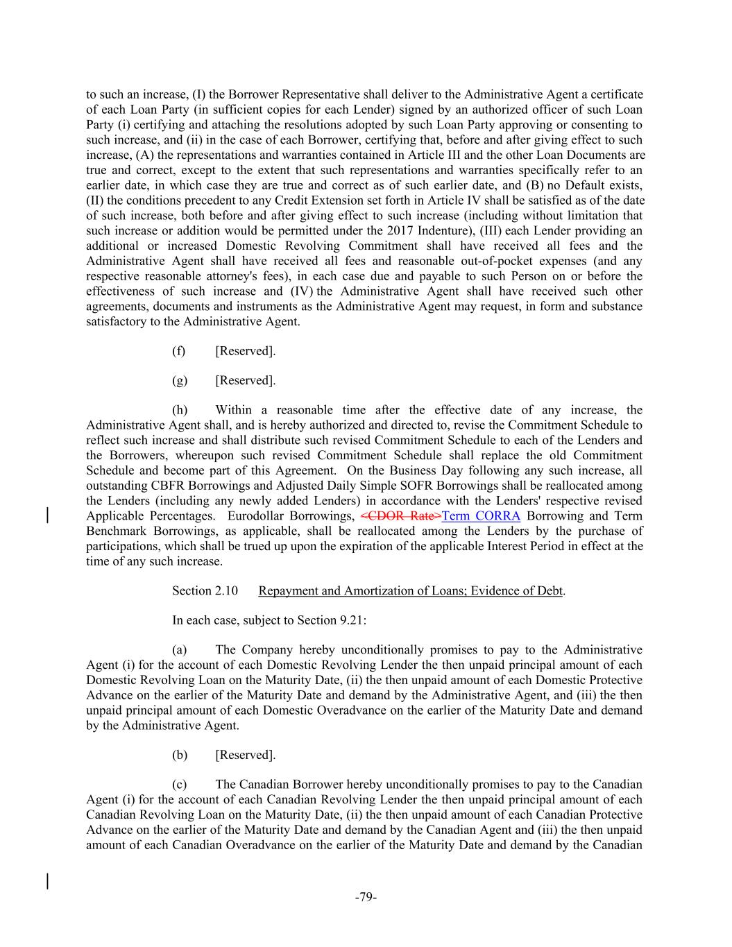 to such an increase, (I) the Borrower Representative shall deliver to the Administrative Agent a certificate of each Loan Party (in sufficient copies for each Lender) signed by an authorized officer of such Loan Party (i) certifying and attaching the resolutions adopted by such Loan Party approving or consenting to such increase, and (ii) in the case of each Borrower, certifying that, before and after giving effect to such increase, (A) the representations and warranties contained in Article III and the other Loan Documents are true and correct, except to the extent that such representations and warranties specifically refer to an earlier date, in which case they are true and correct as of such earlier date, and (B) no Default exists, (II) the conditions precedent to any Credit Extension set forth in Article IV shall be satisfied as of the date of such increase, both before and after giving effect to such increase (including without limitation that such increase or addition would be permitted under the 2017 Indenture), (III) each Lender providing an additional or increased Domestic Revolving Commitment shall have received all fees and the Administrative Agent shall have received all fees and reasonable out-of-pocket expenses (and any respective reasonable attorney's fees), in each case due and payable to such Person on or before the effectiveness of such increase and (IV) the Administrative Agent shall have received such other agreements, documents and instruments as the Administrative Agent may request, in form and substance satisfactory to the Administrative Agent. (f) [Reserved]. (g) [Reserved]. (h) Within a reasonable time after the effective date of any increase, the Administrative Agent shall, and is hereby authorized and directed to, revise the Commitment Schedule to reflect such increase and shall distribute such revised Commitment Schedule to each of the Lenders and the Borrowers, whereupon such revised Commitment Schedule shall replace the old Commitment Schedule and become part of this Agreement. On the Business Day following any such increase, all outstanding CBFR Borrowings and Adjusted Daily Simple SOFR Borrowings shall be reallocated among the Lenders (including any newly added Lenders) in accordance with the Lenders' respective revised Applicable Percentages. Eurodollar Borrowings, <CDOR Rate>Term CORRA Borrowing and Term Benchmark Borrowings, as applicable, shall be reallocated among the Lenders by the purchase of participations, which shall be trued up upon the expiration of the applicable Interest Period in effect at the time of any such increase. Section 2.10 Repayment and Amortization of Loans; Evidence of Debt. In each case, subject to Section 9.21: (a) The Company hereby unconditionally promises to pay to the Administrative Agent (i) for the account of each Domestic Revolving Lender the then unpaid principal amount of each Domestic Revolving Loan on the Maturity Date, (ii) the then unpaid amount of each Domestic Protective Advance on the earlier of the Maturity Date and demand by the Administrative Agent, and (iii) the then unpaid principal amount of each Domestic Overadvance on the earlier of the Maturity Date and demand by the Administrative Agent. (b) [Reserved]. (c) The Canadian Borrower hereby unconditionally promises to pay to the Canadian Agent (i) for the account of each Canadian Revolving Lender the then unpaid principal amount of each Canadian Revolving Loan on the Maturity Date, (ii) the then unpaid amount of each Canadian Protective Advance on the earlier of the Maturity Date and demand by the Canadian Agent and (iii) the then unpaid amount of each Canadian Overadvance on the earlier of the Maturity Date and demand by the Canadian -79-