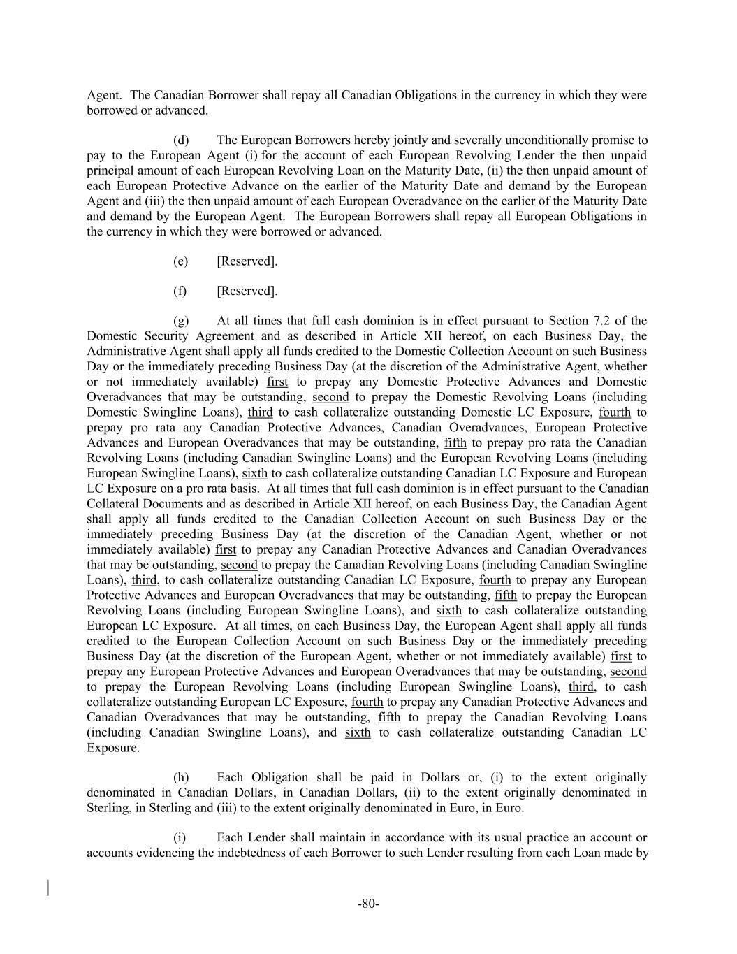 Agent. The Canadian Borrower shall repay all Canadian Obligations in the currency in which they were borrowed or advanced. (d) The European Borrowers hereby jointly and severally unconditionally promise to pay to the European Agent (i) for the account of each European Revolving Lender the then unpaid principal amount of each European Revolving Loan on the Maturity Date, (ii) the then unpaid amount of each European Protective Advance on the earlier of the Maturity Date and demand by the European Agent and (iii) the then unpaid amount of each European Overadvance on the earlier of the Maturity Date and demand by the European Agent. The European Borrowers shall repay all European Obligations in the currency in which they were borrowed or advanced. (e) [Reserved]. (f) [Reserved]. (g) At all times that full cash dominion is in effect pursuant to Section 7.2 of the Domestic Security Agreement and as described in Article XII hereof, on each Business Day, the Administrative Agent shall apply all funds credited to the Domestic Collection Account on such Business Day or the immediately preceding Business Day (at the discretion of the Administrative Agent, whether or not immediately available) first to prepay any Domestic Protective Advances and Domestic Overadvances that may be outstanding, second to prepay the Domestic Revolving Loans (including Domestic Swingline Loans), third to cash collateralize outstanding Domestic LC Exposure, fourth to prepay pro rata any Canadian Protective Advances, Canadian Overadvances, European Protective Advances and European Overadvances that may be outstanding, fifth to prepay pro rata the Canadian Revolving Loans (including Canadian Swingline Loans) and the European Revolving Loans (including European Swingline Loans), sixth to cash collateralize outstanding Canadian LC Exposure and European LC Exposure on a pro rata basis. At all times that full cash dominion is in effect pursuant to the Canadian Collateral Documents and as described in Article XII hereof, on each Business Day, the Canadian Agent shall apply all funds credited to the Canadian Collection Account on such Business Day or the immediately preceding Business Day (at the discretion of the Canadian Agent, whether or not immediately available) first to prepay any Canadian Protective Advances and Canadian Overadvances that may be outstanding, second to prepay the Canadian Revolving Loans (including Canadian Swingline Loans), third, to cash collateralize outstanding Canadian LC Exposure, fourth to prepay any European Protective Advances and European Overadvances that may be outstanding, fifth to prepay the European Revolving Loans (including European Swingline Loans), and sixth to cash collateralize outstanding European LC Exposure. At all times, on each Business Day, the European Agent shall apply all funds credited to the European Collection Account on such Business Day or the immediately preceding Business Day (at the discretion of the European Agent, whether or not immediately available) first to prepay any European Protective Advances and European Overadvances that may be outstanding, second to prepay the European Revolving Loans (including European Swingline Loans), third, to cash collateralize outstanding European LC Exposure, fourth to prepay any Canadian Protective Advances and Canadian Overadvances that may be outstanding, fifth to prepay the Canadian Revolving Loans (including Canadian Swingline Loans), and sixth to cash collateralize outstanding Canadian LC Exposure. (h) Each Obligation shall be paid in Dollars or, (i) to the extent originally denominated in Canadian Dollars, in Canadian Dollars, (ii) to the extent originally denominated in Sterling, in Sterling and (iii) to the extent originally denominated in Euro, in Euro. (i) Each Lender shall maintain in accordance with its usual practice an account or accounts evidencing the indebtedness of each Borrower to such Lender resulting from each Loan made by -80-