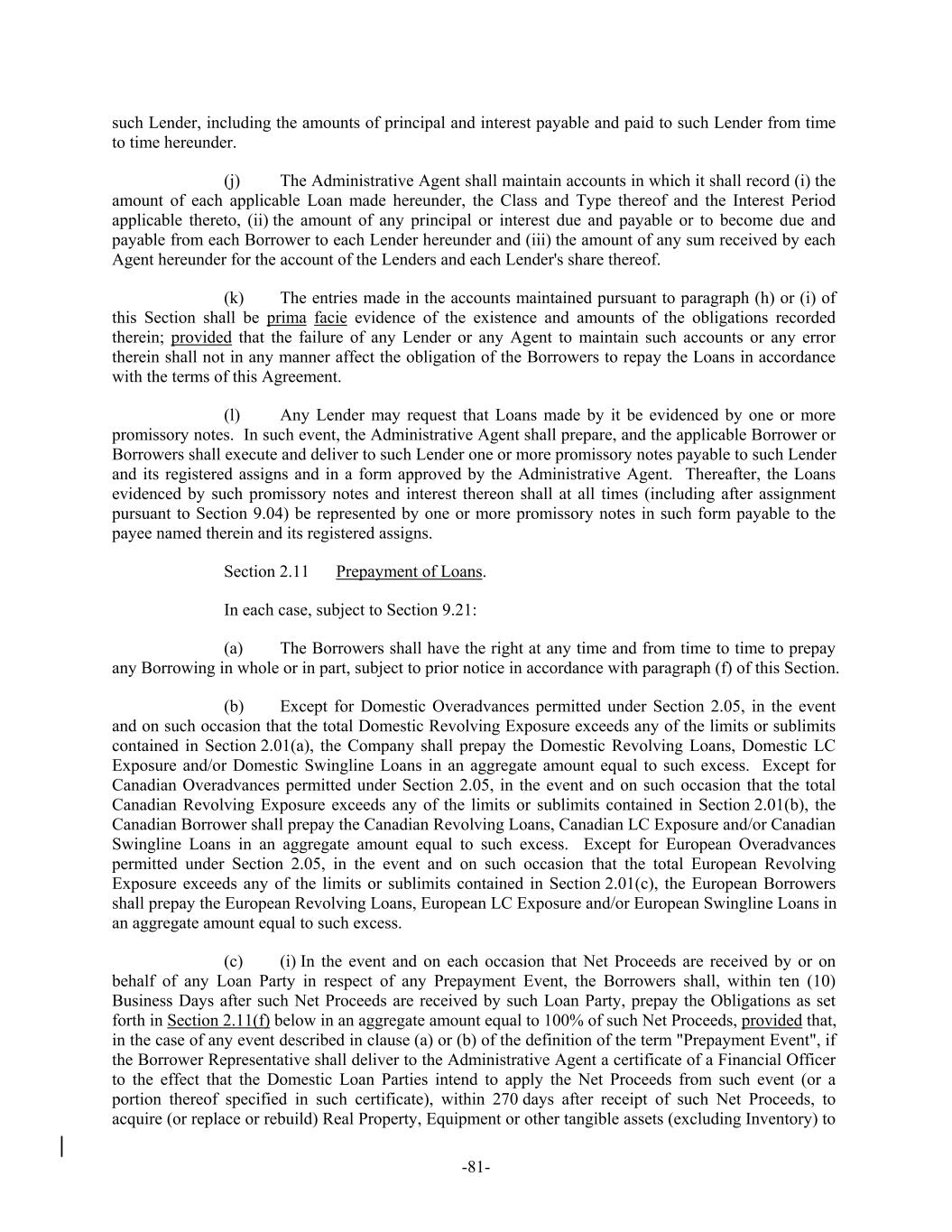such Lender, including the amounts of principal and interest payable and paid to such Lender from time to time hereunder. (j) The Administrative Agent shall maintain accounts in which it shall record (i) the amount of each applicable Loan made hereunder, the Class and Type thereof and the Interest Period applicable thereto, (ii) the amount of any principal or interest due and payable or to become due and payable from each Borrower to each Lender hereunder and (iii) the amount of any sum received by each Agent hereunder for the account of the Lenders and each Lender's share thereof. (k) The entries made in the accounts maintained pursuant to paragraph (h) or (i) of this Section shall be prima facie evidence of the existence and amounts of the obligations recorded therein; provided that the failure of any Lender or any Agent to maintain such accounts or any error therein shall not in any manner affect the obligation of the Borrowers to repay the Loans in accordance with the terms of this Agreement. (l) Any Lender may request that Loans made by it be evidenced by one or more promissory notes. In such event, the Administrative Agent shall prepare, and the applicable Borrower or Borrowers shall execute and deliver to such Lender one or more promissory notes payable to such Lender and its registered assigns and in a form approved by the Administrative Agent. Thereafter, the Loans evidenced by such promissory notes and interest thereon shall at all times (including after assignment pursuant to Section 9.04) be represented by one or more promissory notes in such form payable to the payee named therein and its registered assigns. Section 2.11 Prepayment of Loans. In each case, subject to Section 9.21: (a) The Borrowers shall have the right at any time and from time to time to prepay any Borrowing in whole or in part, subject to prior notice in accordance with paragraph (f) of this Section. (b) Except for Domestic Overadvances permitted under Section 2.05, in the event and on such occasion that the total Domestic Revolving Exposure exceeds any of the limits or sublimits contained in Section 2.01(a), the Company shall prepay the Domestic Revolving Loans, Domestic LC Exposure and/or Domestic Swingline Loans in an aggregate amount equal to such excess. Except for Canadian Overadvances permitted under Section 2.05, in the event and on such occasion that the total Canadian Revolving Exposure exceeds any of the limits or sublimits contained in Section 2.01(b), the Canadian Borrower shall prepay the Canadian Revolving Loans, Canadian LC Exposure and/or Canadian Swingline Loans in an aggregate amount equal to such excess. Except for European Overadvances permitted under Section 2.05, in the event and on such occasion that the total European Revolving Exposure exceeds any of the limits or sublimits contained in Section 2.01(c), the European Borrowers shall prepay the European Revolving Loans, European LC Exposure and/or European Swingline Loans in an aggregate amount equal to such excess. (c) (i) In the event and on each occasion that Net Proceeds are received by or on behalf of any Loan Party in respect of any Prepayment Event, the Borrowers shall, within ten (10) Business Days after such Net Proceeds are received by such Loan Party, prepay the Obligations as set forth in Section 2.11(f) below in an aggregate amount equal to 100% of such Net Proceeds, provided that, in the case of any event described in clause (a) or (b) of the definition of the term "Prepayment Event", if the Borrower Representative shall deliver to the Administrative Agent a certificate of a Financial Officer to the effect that the Domestic Loan Parties intend to apply the Net Proceeds from such event (or a portion thereof specified in such certificate), within 270 days after receipt of such Net Proceeds, to acquire (or replace or rebuild) Real Property, Equipment or other tangible assets (excluding Inventory) to -81-