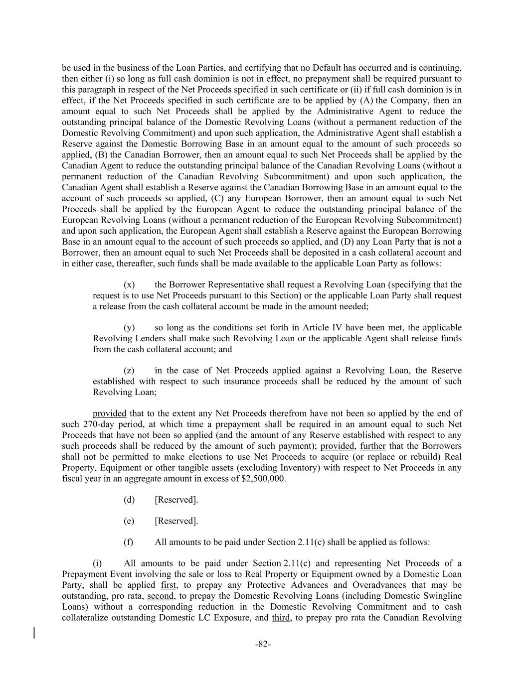 be used in the business of the Loan Parties, and certifying that no Default has occurred and is continuing, then either (i) so long as full cash dominion is not in effect, no prepayment shall be required pursuant to this paragraph in respect of the Net Proceeds specified in such certificate or (ii) if full cash dominion is in effect, if the Net Proceeds specified in such certificate are to be applied by (A) the Company, then an amount equal to such Net Proceeds shall be applied by the Administrative Agent to reduce the outstanding principal balance of the Domestic Revolving Loans (without a permanent reduction of the Domestic Revolving Commitment) and upon such application, the Administrative Agent shall establish a Reserve against the Domestic Borrowing Base in an amount equal to the amount of such proceeds so applied, (B) the Canadian Borrower, then an amount equal to such Net Proceeds shall be applied by the Canadian Agent to reduce the outstanding principal balance of the Canadian Revolving Loans (without a permanent reduction of the Canadian Revolving Subcommitment) and upon such application, the Canadian Agent shall establish a Reserve against the Canadian Borrowing Base in an amount equal to the account of such proceeds so applied, (C) any European Borrower, then an amount equal to such Net Proceeds shall be applied by the European Agent to reduce the outstanding principal balance of the European Revolving Loans (without a permanent reduction of the European Revolving Subcommitment) and upon such application, the European Agent shall establish a Reserve against the European Borrowing Base in an amount equal to the account of such proceeds so applied, and (D) any Loan Party that is not a Borrower, then an amount equal to such Net Proceeds shall be deposited in a cash collateral account and in either case, thereafter, such funds shall be made available to the applicable Loan Party as follows: (x) the Borrower Representative shall request a Revolving Loan (specifying that the request is to use Net Proceeds pursuant to this Section) or the applicable Loan Party shall request a release from the cash collateral account be made in the amount needed; (y) so long as the conditions set forth in Article IV have been met, the applicable Revolving Lenders shall make such Revolving Loan or the applicable Agent shall release funds from the cash collateral account; and (z) in the case of Net Proceeds applied against a Revolving Loan, the Reserve established with respect to such insurance proceeds shall be reduced by the amount of such Revolving Loan; provided that to the extent any Net Proceeds therefrom have not been so applied by the end of such 270-day period, at which time a prepayment shall be required in an amount equal to such Net Proceeds that have not been so applied (and the amount of any Reserve established with respect to any such proceeds shall be reduced by the amount of such payment); provided, further that the Borrowers shall not be permitted to make elections to use Net Proceeds to acquire (or replace or rebuild) Real Property, Equipment or other tangible assets (excluding Inventory) with respect to Net Proceeds in any fiscal year in an aggregate amount in excess of $2,500,000. (d) [Reserved]. (e) [Reserved]. (f) All amounts to be paid under Section 2.11(c) shall be applied as follows: (i) All amounts to be paid under Section 2.11(c) and representing Net Proceeds of a Prepayment Event involving the sale or loss to Real Property or Equipment owned by a Domestic Loan Party, shall be applied first, to prepay any Protective Advances and Overadvances that may be outstanding, pro rata, second, to prepay the Domestic Revolving Loans (including Domestic Swingline Loans) without a corresponding reduction in the Domestic Revolving Commitment and to cash collateralize outstanding Domestic LC Exposure, and third, to prepay pro rata the Canadian Revolving -82-