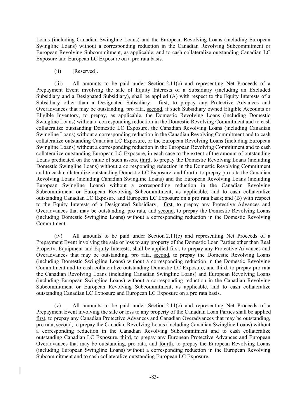 Loans (including Canadian Swingline Loans) and the European Revolving Loans (including European Swingline Loans) without a corresponding reduction in the Canadian Revolving Subcommitment or European Revolving Subcommitment, as applicable, and to cash collateralize outstanding Canadian LC Exposure and European LC Exposure on a pro rata basis. (ii) [Reserved]. (iii) All amounts to be paid under Section 2.11(c) and representing Net Proceeds of a Prepayment Event involving the sale of Equity Interests of a Subsidiary (including an Excluded Subsidiary and a Designated Subsidiary), shall be applied (A) with respect to the Equity Interests of a Subsidiary other than a Designated Subsidiary, first, to prepay any Protective Advances and Overadvances that may be outstanding, pro rata, second, if such Subsidiary owned Eligible Accounts or Eligible Inventory, to prepay, as applicable, the Domestic Revolving Loans (including Domestic Swingline Loans) without a corresponding reduction in the Domestic Revolving Commitment and to cash collateralize outstanding Domestic LC Exposure, the Canadian Revolving Loans (including Canadian Swingline Loans) without a corresponding reduction in the Canadian Revolving Commitment and to cash collateralize outstanding Canadian LC Exposure, or the European Revolving Loans (including European Swingline Loans) without a corresponding reduction in the European Revolving Commitment and to cash collateralize outstanding European LC Exposure, in each case to the extent of the amount of outstanding Loans predicated on the value of such assets, third, to prepay the Domestic Revolving Loans (including Domestic Swingline Loans) without a corresponding reduction in the Domestic Revolving Commitment and to cash collateralize outstanding Domestic LC Exposure, and fourth, to prepay pro rata the Canadian Revolving Loans (including Canadian Swingline Loans) and the European Revolving Loans (including European Swingline Loans) without a corresponding reduction in the Canadian Revolving Subcommitment or European Revolving Subcommitment, as applicable, and to cash collateralize outstanding Canadian LC Exposure and European LC Exposure on a pro rata basis; and (B) with respect to the Equity Interests of a Designated Subsidiary, first, to prepay any Protective Advances and Overadvances that may be outstanding, pro rata, and second, to prepay the Domestic Revolving Loans (including Domestic Swingline Loans) without a corresponding reduction in the Domestic Revolving Commitment. (iv) All amounts to be paid under Section 2.11(c) and representing Net Proceeds of a Prepayment Event involving the sale or loss to any property of the Domestic Loan Parties other than Real Property, Equipment and Equity Interests, shall be applied first, to prepay any Protective Advances and Overadvances that may be outstanding, pro rata, second, to prepay the Domestic Revolving Loans (including Domestic Swingline Loans) without a corresponding reduction in the Domestic Revolving Commitment and to cash collateralize outstanding Domestic LC Exposure, and third, to prepay pro rata the Canadian Revolving Loans (including Canadian Swingline Loans) and European Revolving Loans (including European Swingline Loans) without a corresponding reduction in the Canadian Revolving Subcommitment or European Revolving Subcommitment, as applicable, and to cash collateralize outstanding Canadian LC Exposure and European LC Exposure on a pro rata basis. (v) All amounts to be paid under Section 2.11(c) and representing Net Proceeds of a Prepayment Event involving the sale or loss to any property of the Canadian Loan Parties shall be applied first, to prepay any Canadian Protective Advances and Canadian Overadvances that may be outstanding, pro rata, second, to prepay the Canadian Revolving Loans (including Canadian Swingline Loans) without a corresponding reduction in the Canadian Revolving Subcommitment and to cash collateralize outstanding Canadian LC Exposure, third, to prepay any European Protective Advances and European Overadvances that may be outstanding, pro rata, and fourth, to prepay the European Revolving Loans (including European Swingline Loans) without a corresponding reduction in the European Revolving Subcommitment and to cash collateralize outstanding European LC Exposure. -83-