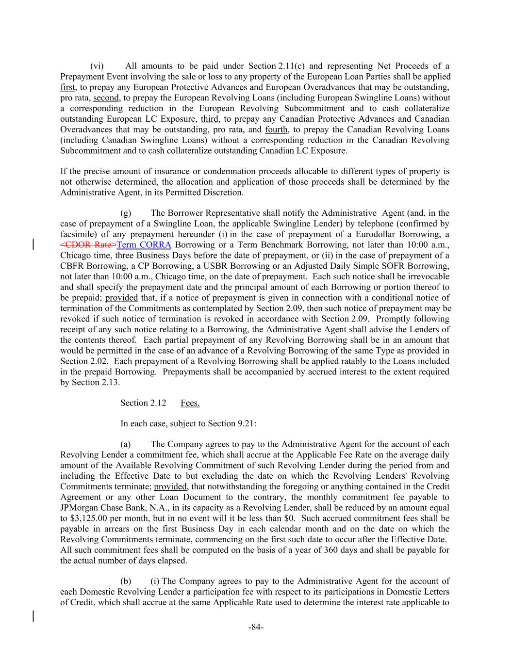 (vi) All amounts to be paid under Section 2.11(c) and representing Net Proceeds of a Prepayment Event involving the sale or loss to any property of the European Loan Parties shall be applied first, to prepay any European Protective Advances and European Overadvances that may be outstanding, pro rata, second, to prepay the European Revolving Loans (including European Swingline Loans) without a corresponding reduction in the European Revolving Subcommitment and to cash collateralize outstanding European LC Exposure, third, to prepay any Canadian Protective Advances and Canadian Overadvances that may be outstanding, pro rata, and fourth, to prepay the Canadian Revolving Loans (including Canadian Swingline Loans) without a corresponding reduction in the Canadian Revolving Subcommitment and to cash collateralize outstanding Canadian LC Exposure. If the precise amount of insurance or condemnation proceeds allocable to different types of property is not otherwise determined, the allocation and application of those proceeds shall be determined by the Administrative Agent, in its Permitted Discretion. (g) The Borrower Representative shall notify the Administrative Agent (and, in the case of prepayment of a Swingline Loan, the applicable Swingline Lender) by telephone (confirmed by facsimile) of any prepayment hereunder (i) in the case of prepayment of a Eurodollar Borrowing, a <CDOR Rate>Term CORRA Borrowing or a Term Benchmark Borrowing, not later than 10:00 a.m., Chicago time, three Business Days before the date of prepayment, or (ii) in the case of prepayment of a CBFR Borrowing, a CP Borrowing, a USBR Borrowing or an Adjusted Daily Simple SOFR Borrowing, not later than 10:00 a.m., Chicago time, on the date of prepayment. Each such notice shall be irrevocable and shall specify the prepayment date and the principal amount of each Borrowing or portion thereof to be prepaid; provided that, if a notice of prepayment is given in connection with a conditional notice of termination of the Commitments as contemplated by Section 2.09, then such notice of prepayment may be revoked if such notice of termination is revoked in accordance with Section 2.09. Promptly following receipt of any such notice relating to a Borrowing, the Administrative Agent shall advise the Lenders of the contents thereof. Each partial prepayment of any Revolving Borrowing shall be in an amount that would be permitted in the case of an advance of a Revolving Borrowing of the same Type as provided in Section 2.02. Each prepayment of a Revolving Borrowing shall be applied ratably to the Loans included in the prepaid Borrowing. Prepayments shall be accompanied by accrued interest to the extent required by Section 2.13. Section 2.12 Fees. In each case, subject to Section 9.21: (a) The Company agrees to pay to the Administrative Agent for the account of each Revolving Lender a commitment fee, which shall accrue at the Applicable Fee Rate on the average daily amount of the Available Revolving Commitment of such Revolving Lender during the period from and including the Effective Date to but excluding the date on which the Revolving Lenders' Revolving Commitments terminate; provided, that notwithstanding the foregoing or anything contained in the Credit Agreement or any other Loan Document to the contrary, the monthly commitment fee payable to JPMorgan Chase Bank, N.A., in its capacity as a Revolving Lender, shall be reduced by an amount equal to $3,125.00 per month, but in no event will it be less than $0. Such accrued commitment fees shall be payable in arrears on the first Business Day in each calendar month and on the date on which the Revolving Commitments terminate, commencing on the first such date to occur after the Effective Date. All such commitment fees shall be computed on the basis of a year of 360 days and shall be payable for the actual number of days elapsed. (b) (i) The Company agrees to pay to the Administrative Agent for the account of each Domestic Revolving Lender a participation fee with respect to its participations in Domestic Letters of Credit, which shall accrue at the same Applicable Rate used to determine the interest rate applicable to -84-