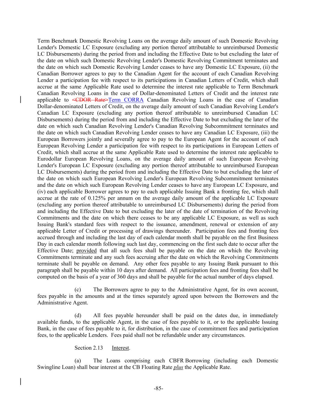 Term Benchmark Domestic Revolving Loans on the average daily amount of such Domestic Revolving Lender's Domestic LC Exposure (excluding any portion thereof attributable to unreimbursed Domestic LC Disbursements) during the period from and including the Effective Date to but excluding the later of the date on which such Domestic Revolving Lender's Domestic Revolving Commitment terminates and the date on which such Domestic Revolving Lender ceases to have any Domestic LC Exposure, (ii) the Canadian Borrower agrees to pay to the Canadian Agent for the account of each Canadian Revolving Lender a participation fee with respect to its participations in Canadian Letters of Credit, which shall accrue at the same Applicable Rate used to determine the interest rate applicable to Term Benchmark Canadian Revolving Loans in the case of Dollar-denominated Letters of Credit and the interest rate applicable to <CDOR Rate>Term CORRA Canadian Revolving Loans in the case of Canadian Dollar-denominated Letters of Credit, on the average daily amount of such Canadian Revolving Lender's Canadian LC Exposure (excluding any portion thereof attributable to unreimbursed Canadian LC Disbursements) during the period from and including the Effective Date to but excluding the later of the date on which such Canadian Revolving Lender's Canadian Revolving Subcommitment terminates and the date on which such Canadian Revolving Lender ceases to have any Canadian LC Exposure, (iii) the European Borrowers jointly and severally agree to pay to the European Agent for the account of each European Revolving Lender a participation fee with respect to its participations in European Letters of Credit, which shall accrue at the same Applicable Rate used to determine the interest rate applicable to Eurodollar European Revolving Loans, on the average daily amount of such European Revolving Lender's European LC Exposure (excluding any portion thereof attributable to unreimbursed European LC Disbursements) during the period from and including the Effective Date to but excluding the later of the date on which such European Revolving Lender's European Revolving Subcommitment terminates and the date on which such European Revolving Lender ceases to have any European LC Exposure, and (iv) each applicable Borrower agrees to pay to each applicable Issuing Bank a fronting fee, which shall accrue at the rate of 0.125% per annum on the average daily amount of the applicable LC Exposure (excluding any portion thereof attributable to unreimbursed LC Disbursements) during the period from and including the Effective Date to but excluding the later of the date of termination of the Revolving Commitments and the date on which there ceases to be any applicable LC Exposure, as well as such Issuing Bank's standard fees with respect to the issuance, amendment, renewal or extension of any applicable Letter of Credit or processing of drawings thereunder. Participation fees and fronting fees accrued through and including the last day of each calendar month shall be payable on the first Business Day in each calendar month following such last day, commencing on the first such date to occur after the Effective Date; provided that all such fees shall be payable on the date on which the Revolving Commitments terminate and any such fees accruing after the date on which the Revolving Commitments terminate shall be payable on demand. Any other fees payable to any Issuing Bank pursuant to this paragraph shall be payable within 10 days after demand. All participation fees and fronting fees shall be computed on the basis of a year of 360 days and shall be payable for the actual number of days elapsed. (c) The Borrowers agree to pay to the Administrative Agent, for its own account, fees payable in the amounts and at the times separately agreed upon between the Borrowers and the Administrative Agent. (d) All fees payable hereunder shall be paid on the dates due, in immediately available funds, to the applicable Agent, in the case of fees payable to it, or to the applicable Issuing Bank, in the case of fees payable to it, for distribution, in the case of commitment fees and participation fees, to the applicable Lenders. Fees paid shall not be refundable under any circumstances. Section 2.13 Interest. (a) The Loans comprising each CBFR Borrowing (including each Domestic Swingline Loan) shall bear interest at the CB Floating Rate plus the Applicable Rate. -85-