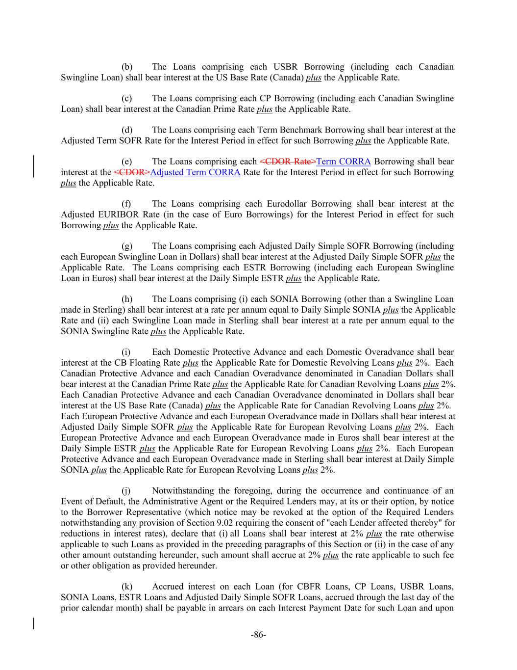 (b) The Loans comprising each USBR Borrowing (including each Canadian Swingline Loan) shall bear interest at the US Base Rate (Canada) plus the Applicable Rate. (c) The Loans comprising each CP Borrowing (including each Canadian Swingline Loan) shall bear interest at the Canadian Prime Rate plus the Applicable Rate. (d) The Loans comprising each Term Benchmark Borrowing shall bear interest at the Adjusted Term SOFR Rate for the Interest Period in effect for such Borrowing plus the Applicable Rate. (e) The Loans comprising each <CDOR Rate>Term CORRA Borrowing shall bear interest at the <CDOR>Adjusted Term CORRA Rate for the Interest Period in effect for such Borrowing plus the Applicable Rate. (f) The Loans comprising each Eurodollar Borrowing shall bear interest at the Adjusted EURIBOR Rate (in the case of Euro Borrowings) for the Interest Period in effect for such Borrowing plus the Applicable Rate. (g) The Loans comprising each Adjusted Daily Simple SOFR Borrowing (including each European Swingline Loan in Dollars) shall bear interest at the Adjusted Daily Simple SOFR plus the Applicable Rate. The Loans comprising each ESTR Borrowing (including each European Swingline Loan in Euros) shall bear interest at the Daily Simple ESTR plus the Applicable Rate. (h) The Loans comprising (i) each SONIA Borrowing (other than a Swingline Loan made in Sterling) shall bear interest at a rate per annum equal to Daily Simple SONIA plus the Applicable Rate and (ii) each Swingline Loan made in Sterling shall bear interest at a rate per annum equal to the SONIA Swingline Rate plus the Applicable Rate. (i) Each Domestic Protective Advance and each Domestic Overadvance shall bear interest at the CB Floating Rate plus the Applicable Rate for Domestic Revolving Loans plus 2%. Each Canadian Protective Advance and each Canadian Overadvance denominated in Canadian Dollars shall bear interest at the Canadian Prime Rate plus the Applicable Rate for Canadian Revolving Loans plus 2%. Each Canadian Protective Advance and each Canadian Overadvance denominated in Dollars shall bear interest at the US Base Rate (Canada) plus the Applicable Rate for Canadian Revolving Loans plus 2%. Each European Protective Advance and each European Overadvance made in Dollars shall bear interest at Adjusted Daily Simple SOFR plus the Applicable Rate for European Revolving Loans plus 2%. Each European Protective Advance and each European Overadvance made in Euros shall bear interest at the Daily Simple ESTR plus the Applicable Rate for European Revolving Loans plus 2%. Each European Protective Advance and each European Overadvance made in Sterling shall bear interest at Daily Simple SONIA plus the Applicable Rate for European Revolving Loans plus 2%. (j) Notwithstanding the foregoing, during the occurrence and continuance of an Event of Default, the Administrative Agent or the Required Lenders may, at its or their option, by notice to the Borrower Representative (which notice may be revoked at the option of the Required Lenders notwithstanding any provision of Section 9.02 requiring the consent of "each Lender affected thereby" for reductions in interest rates), declare that (i) all Loans shall bear interest at 2% plus the rate otherwise applicable to such Loans as provided in the preceding paragraphs of this Section or (ii) in the case of any other amount outstanding hereunder, such amount shall accrue at 2% plus the rate applicable to such fee or other obligation as provided hereunder. (k) Accrued interest on each Loan (for CBFR Loans, CP Loans, USBR Loans, SONIA Loans, ESTR Loans and Adjusted Daily Simple SOFR Loans, accrued through the last day of the prior calendar month) shall be payable in arrears on each Interest Payment Date for such Loan and upon -86-